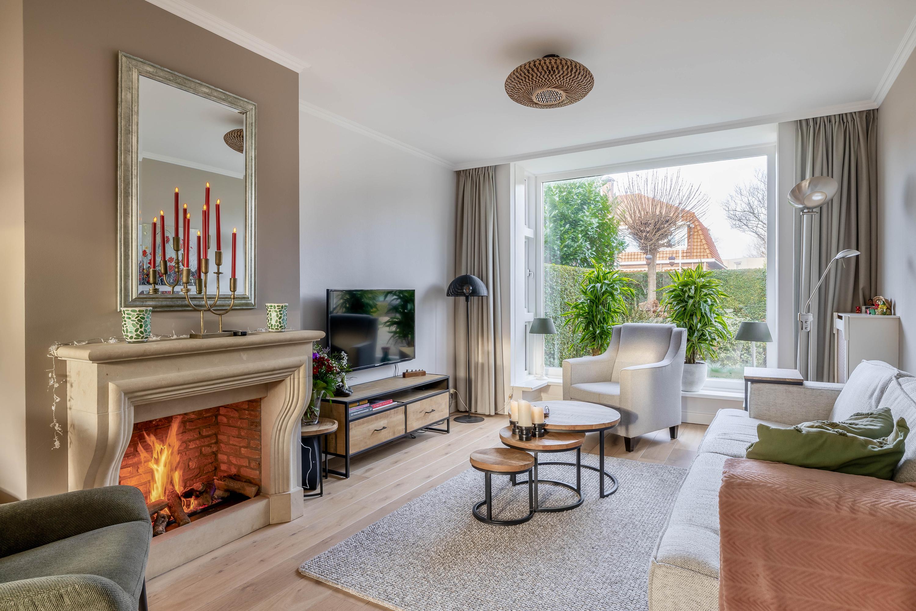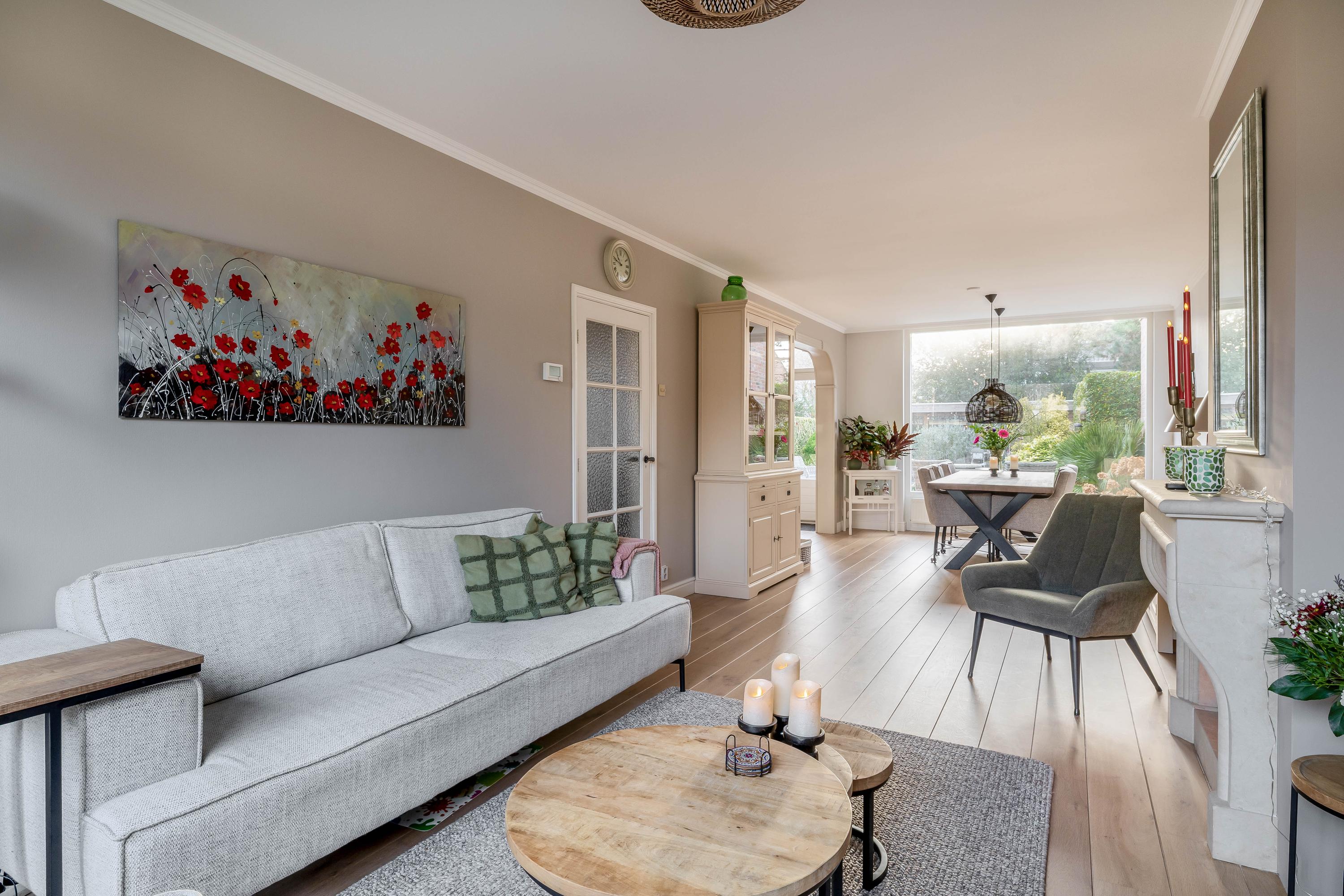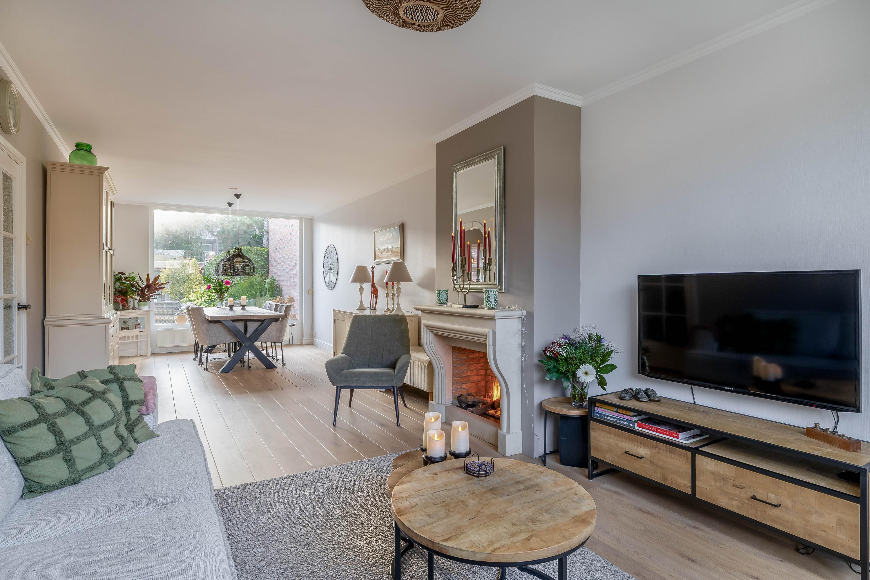 De doorzonwoonkamer beschikt over grote raampartijen aan zowel de voor- als achterzijde, wat zorgt voor een goede lichtinval. De woonkamer is recentelijk geheel gerenoveerd en heeft een fraaie houten vloer en schouw met gashaard.