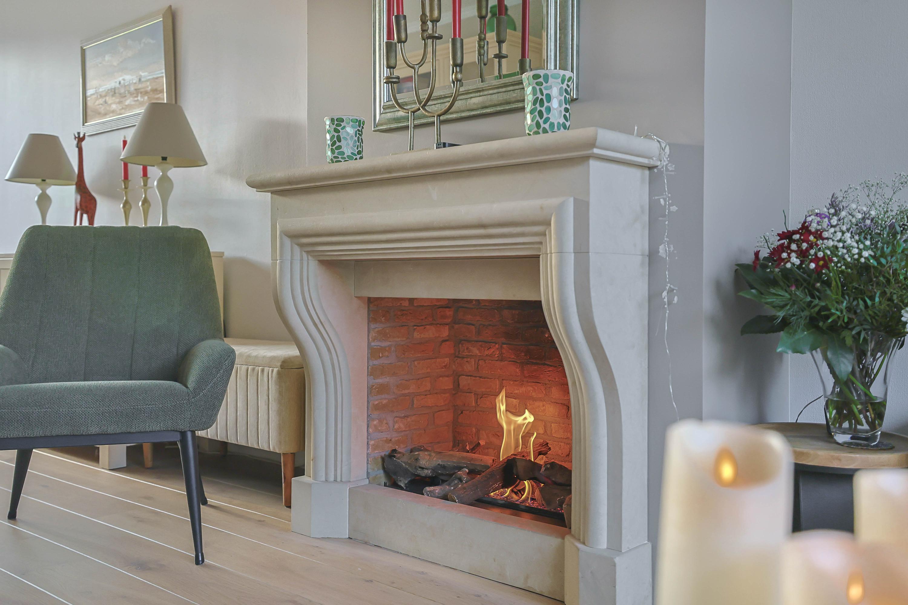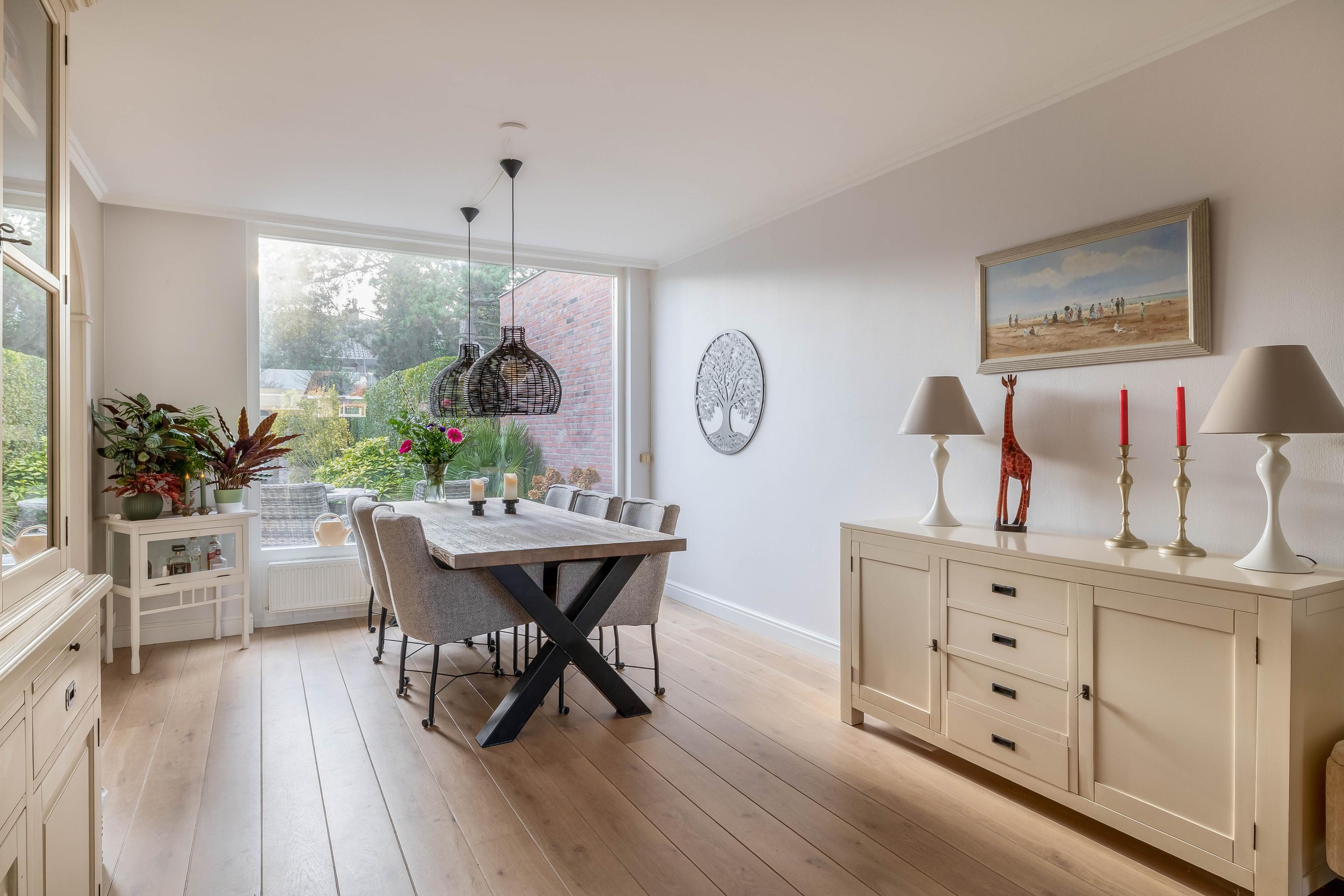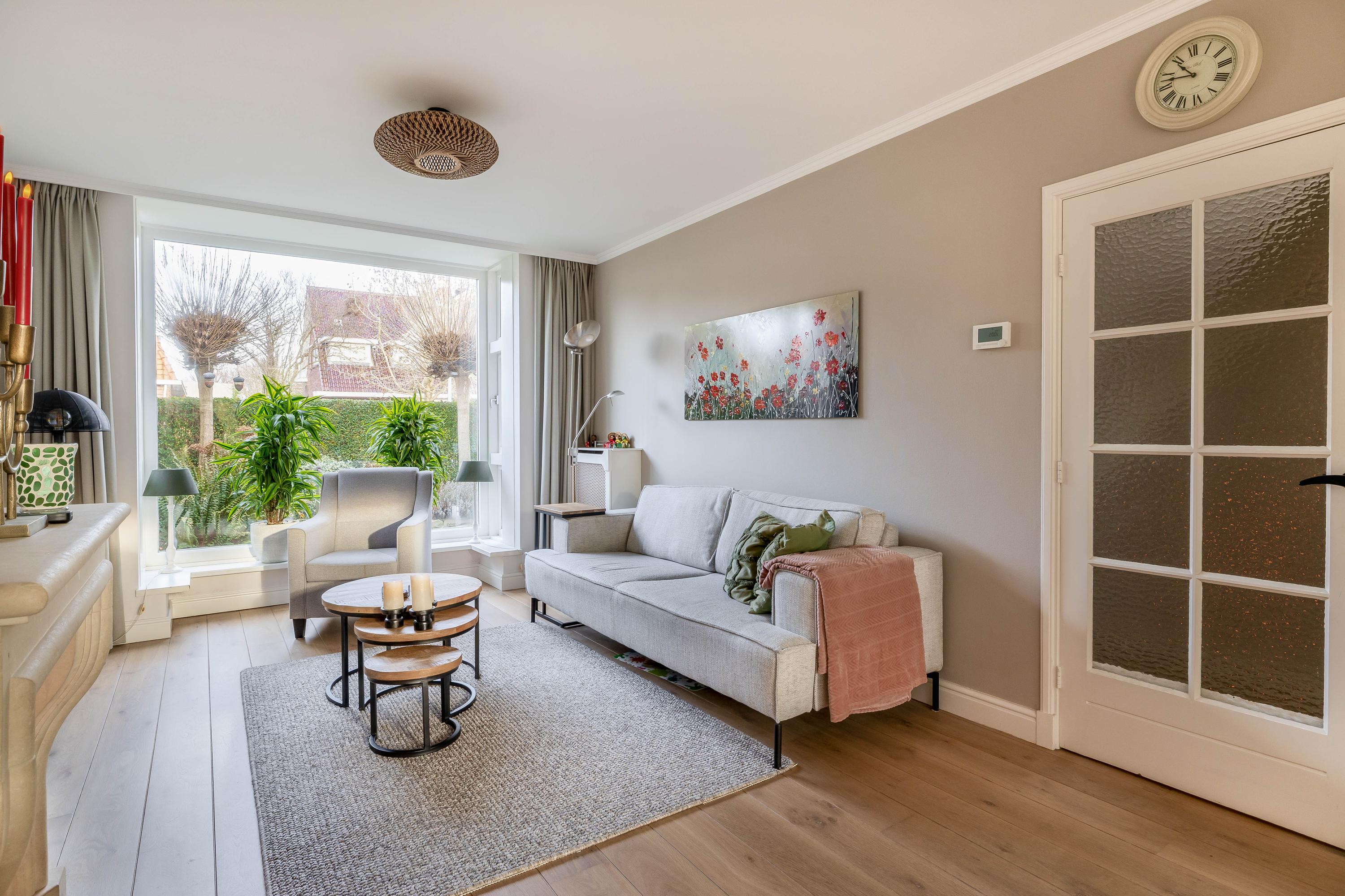 De doorzonwoonkamer beschikt over grote raampartijen aan zowel de voor- als achterzijde, wat zorgt voor een goede lichtinval. De woonkamer is recentelijk geheel gerenoveerd en heeft een fraaie houten vloer en schouw met gashaard.