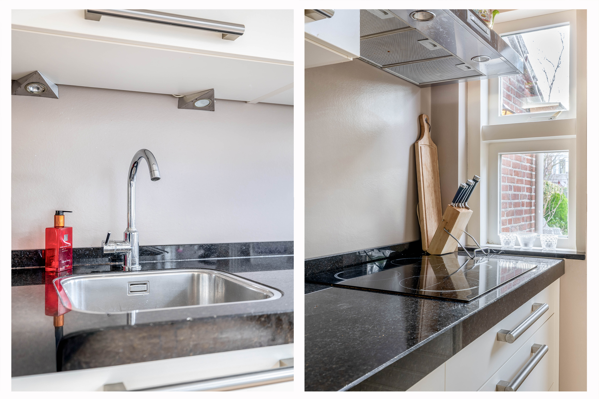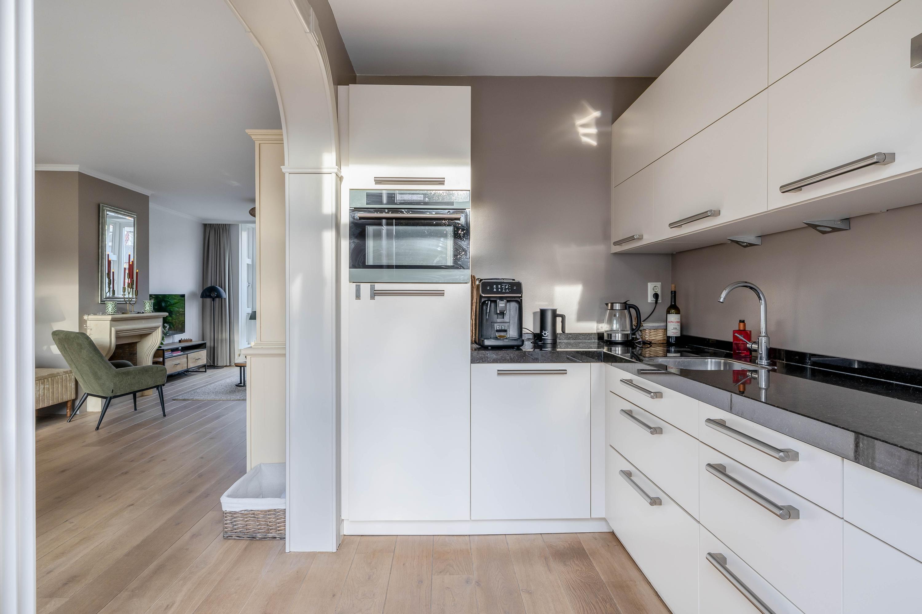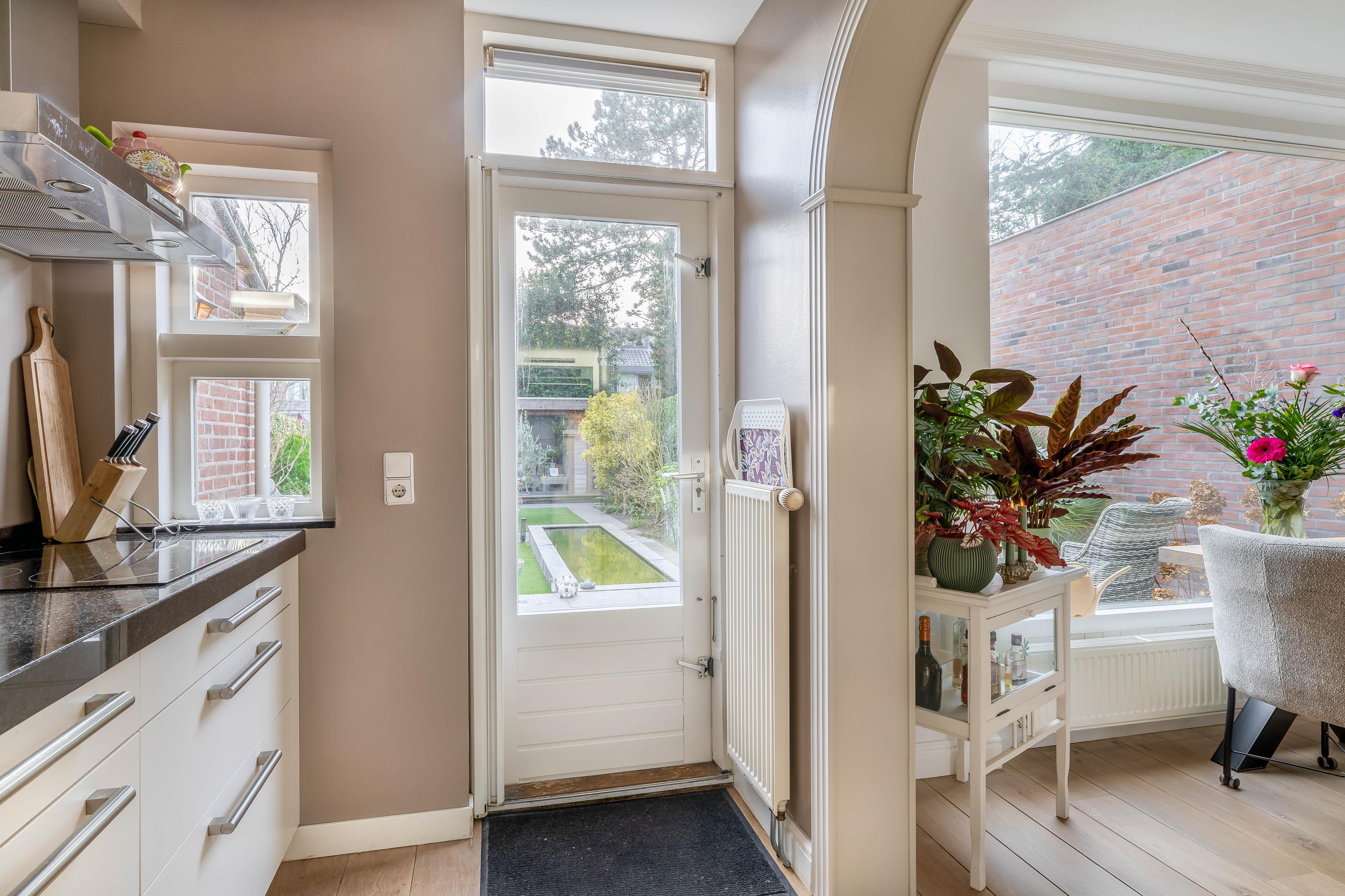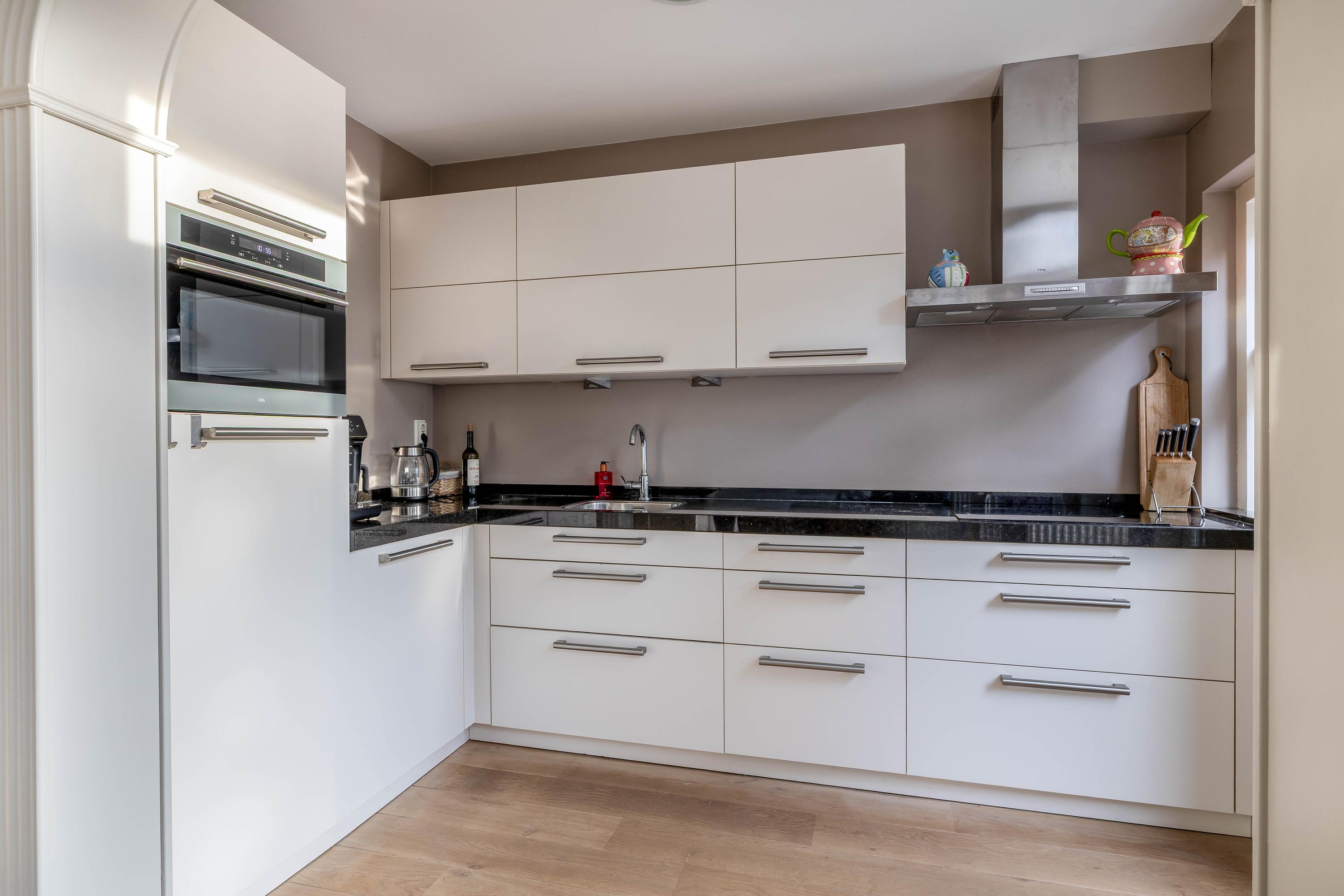 De keuken is aan de achterzijde van de woning gesitueerd en uitgevoerd in een praktische opstelling met diverse inbouwapparatuur, waaronder een kookplaat, afzuigkap, combi-oven, koelkast en vaatwasser. Vanuit de keuken is er directe toegang tot de achtertuin.