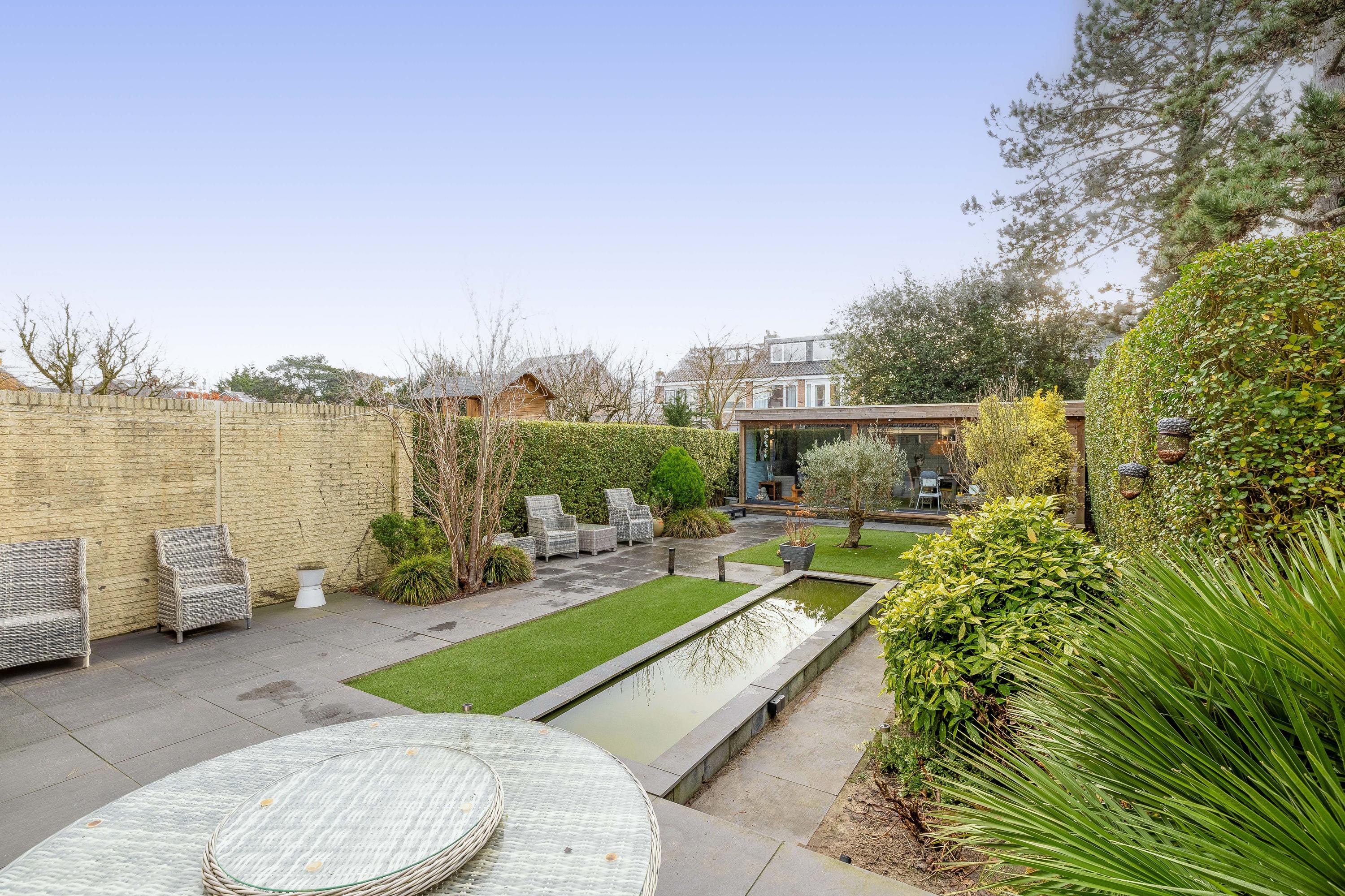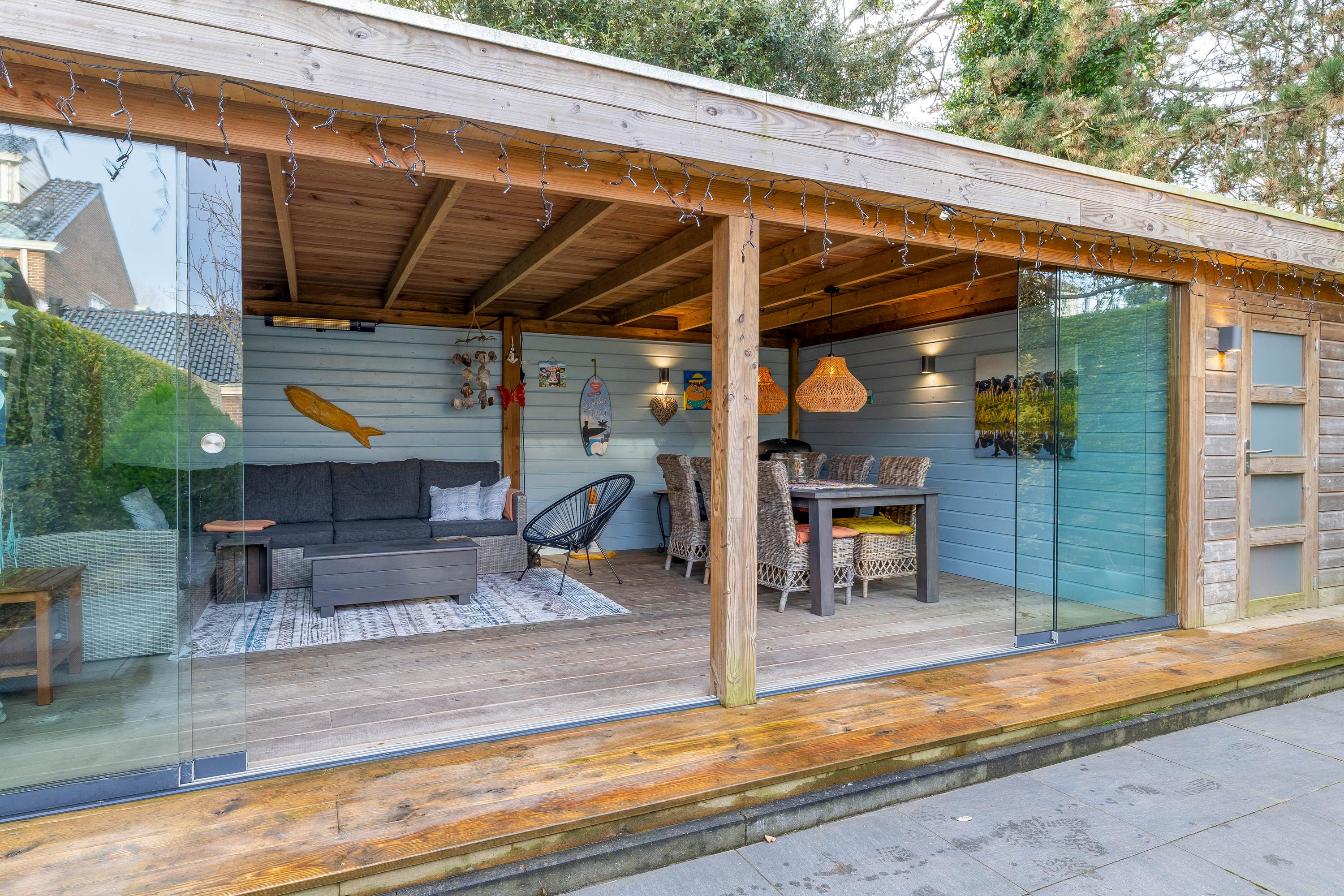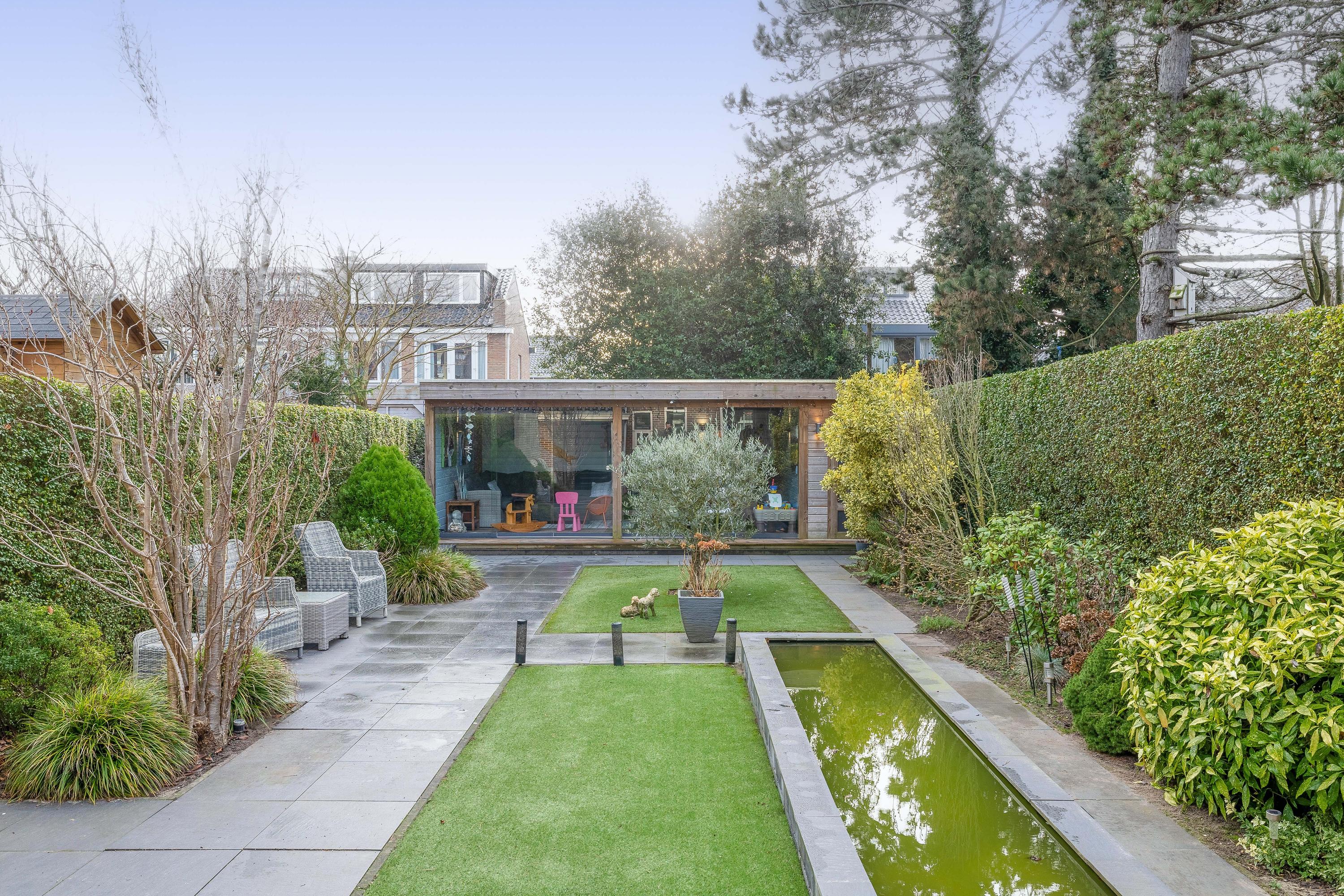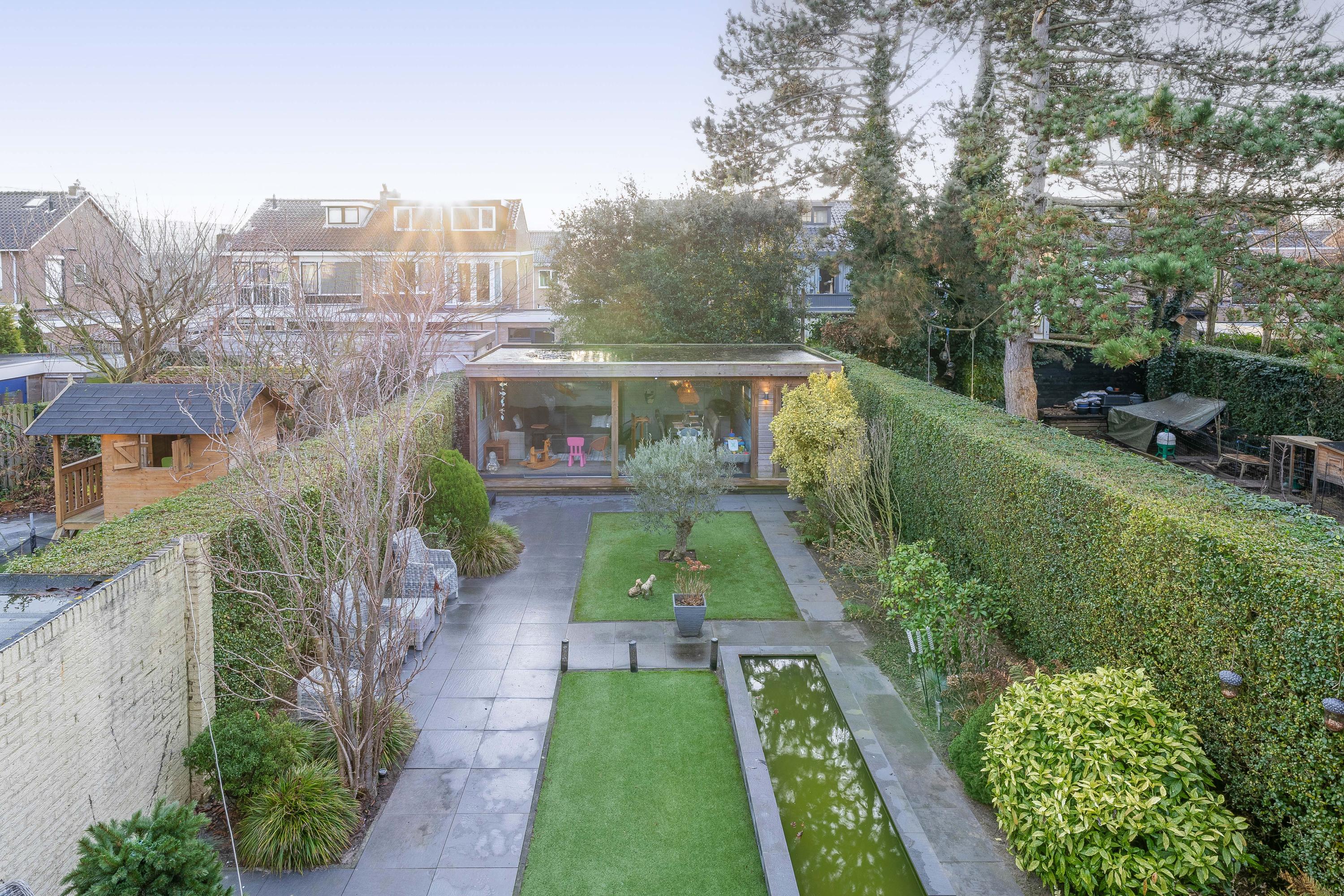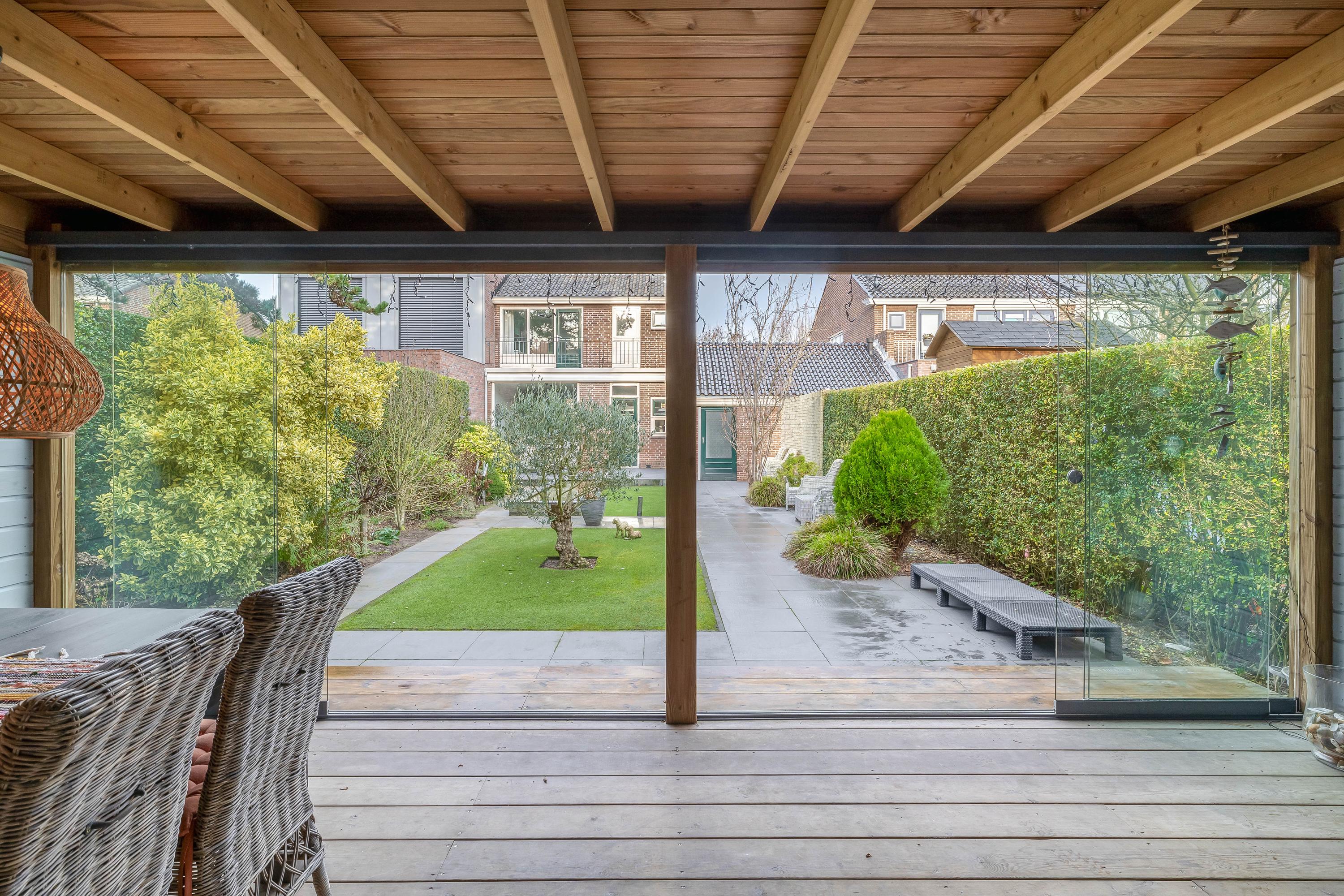 De woning beschikt over een diepe en fraai aangelegde achtertuin, aangelegd met bestrating, gazon en diverse beplanting. De tuin biedt meerdere zitmogelijkheden en een goede mate van privacy. Achterin de tuin bevindt zich een prachtige veranda, voorzien van glazen schuifwanden, waardoor deze ruimte gedurende een groot deel van het jaar te gebruiken is. Aan de woning is tevens een ruime garage beschikbaar waar de opstelplaats van de wasmachine/droger en CV ketel zijn.