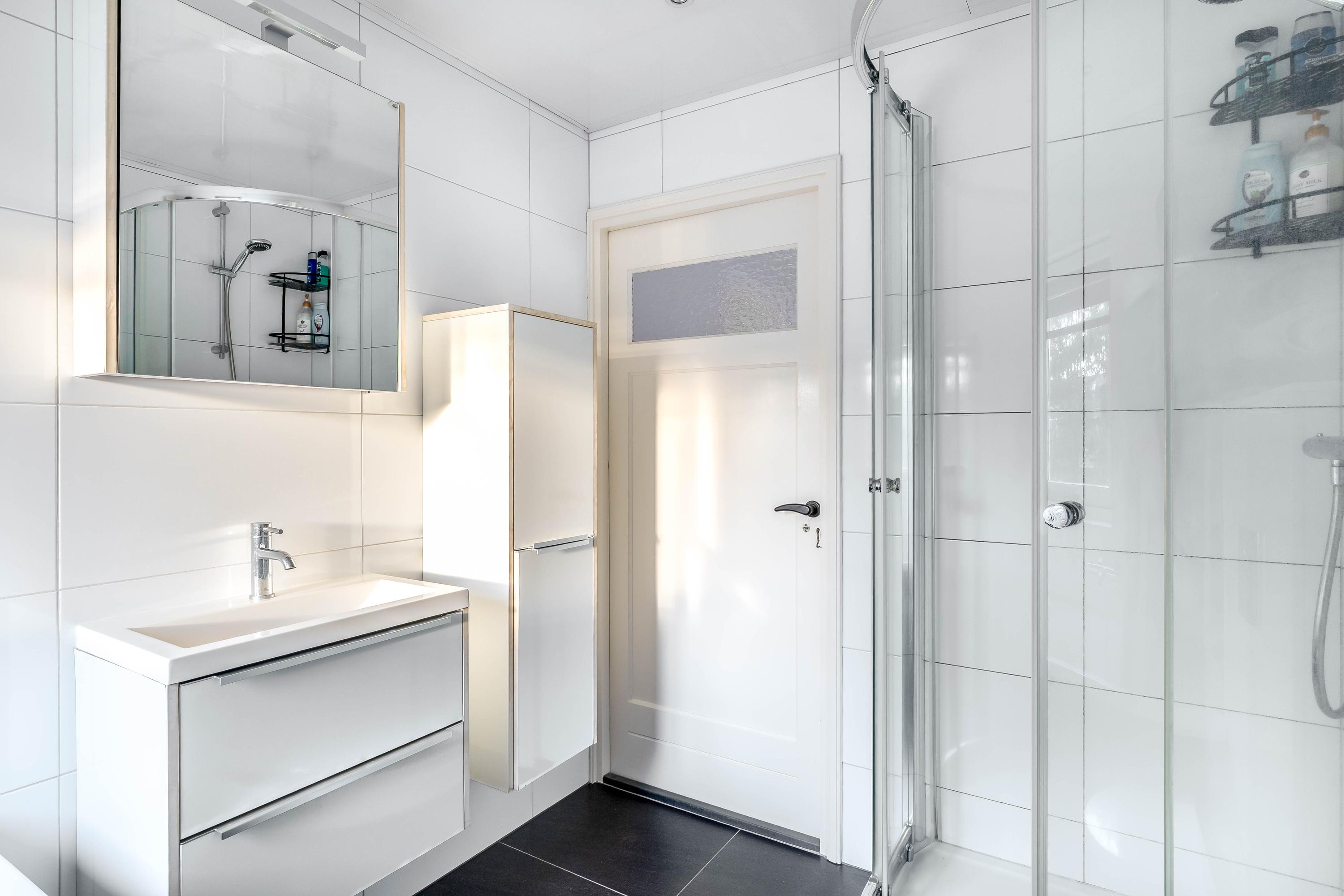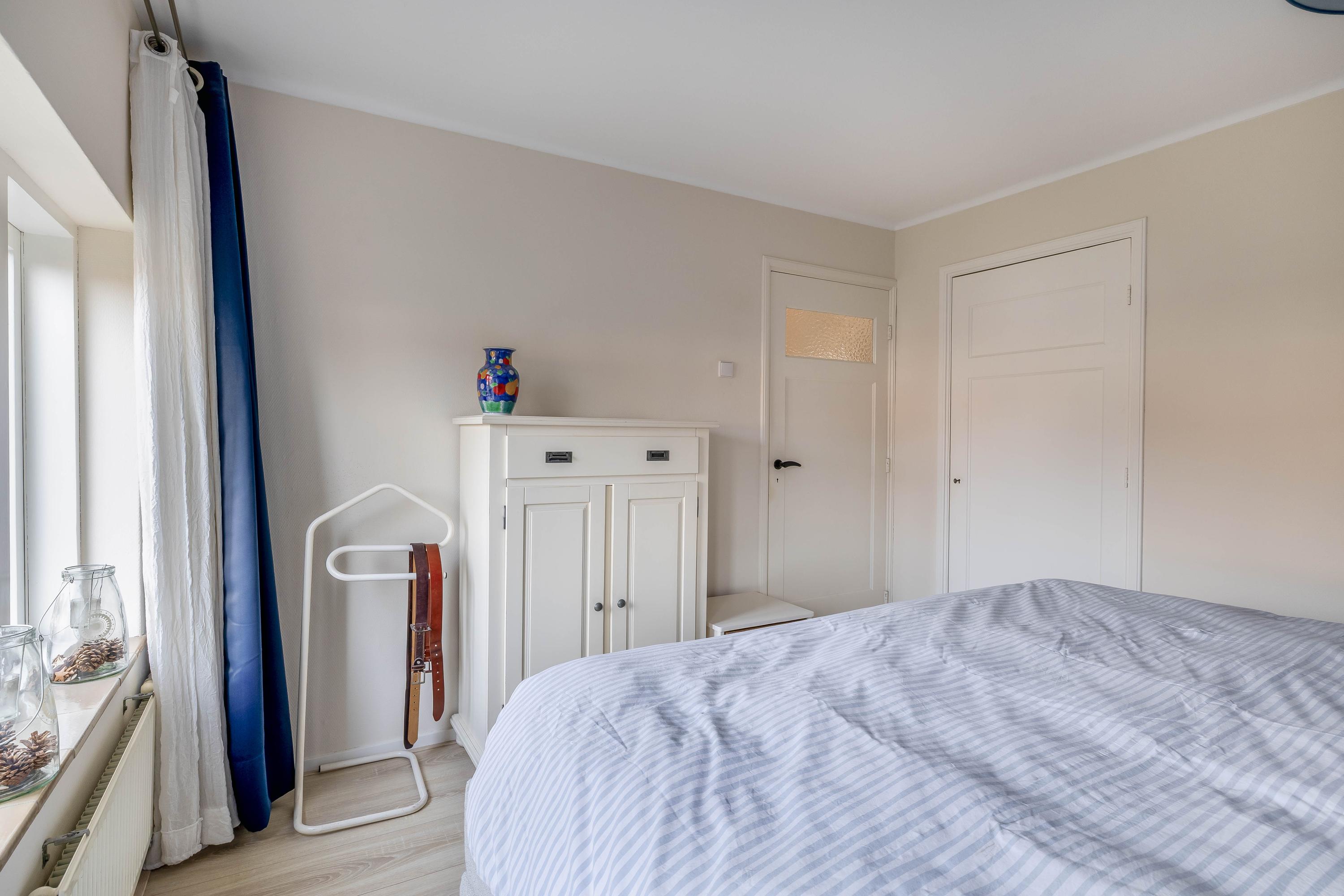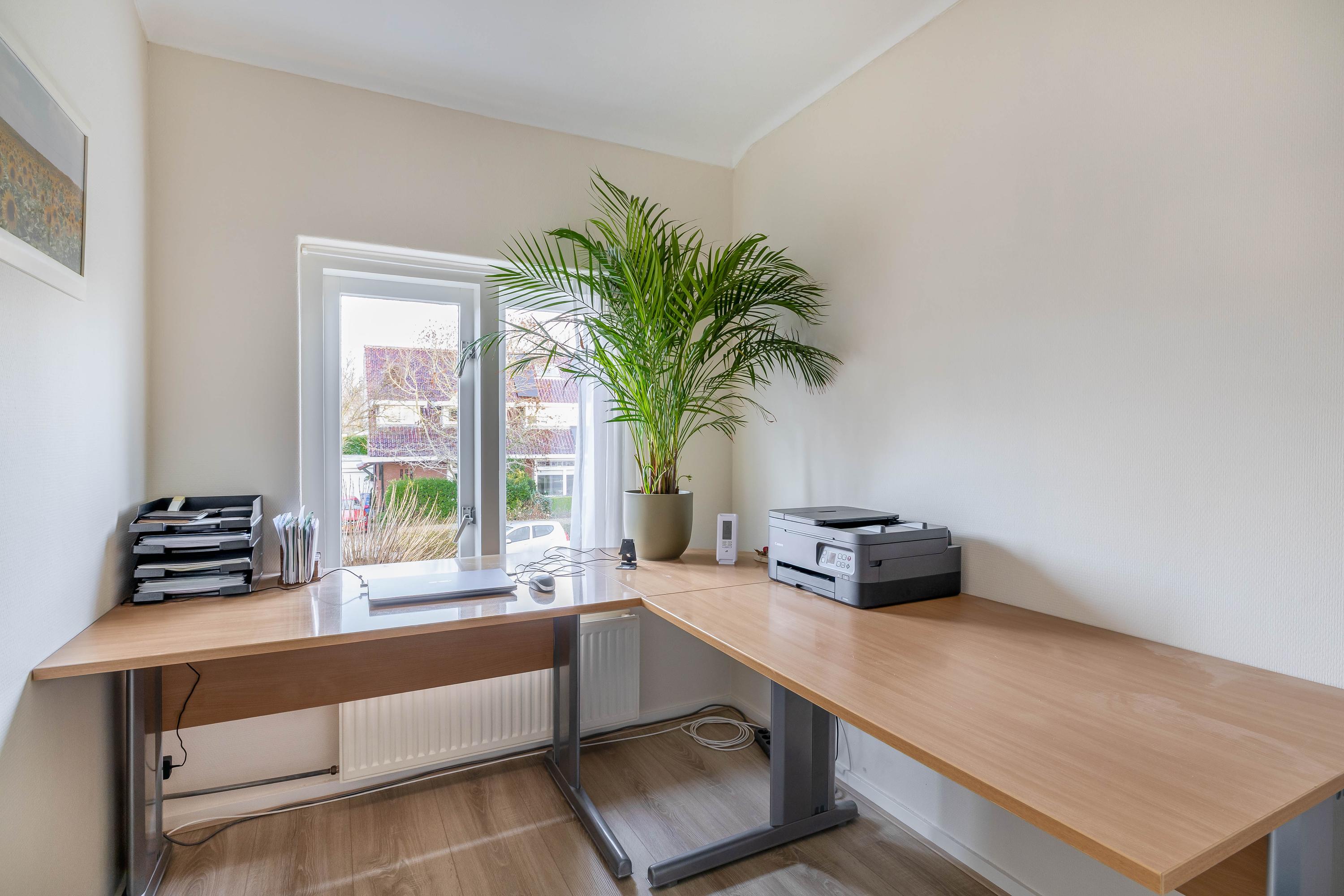 Trap naar de eerste verdieping, overloop met toegang tot 3 slaapkamers waarvan één slaapkamer toegang biedt tot het balkon en een kamer welke nu ingericht is als werkkamer. De slaapkamers zijn functioneel ingedeeld en voorzien van vaste kastruimte. De badkamer is uitgevoerd met een ligbad, douchecabine, wastafelmeubel en toilet.