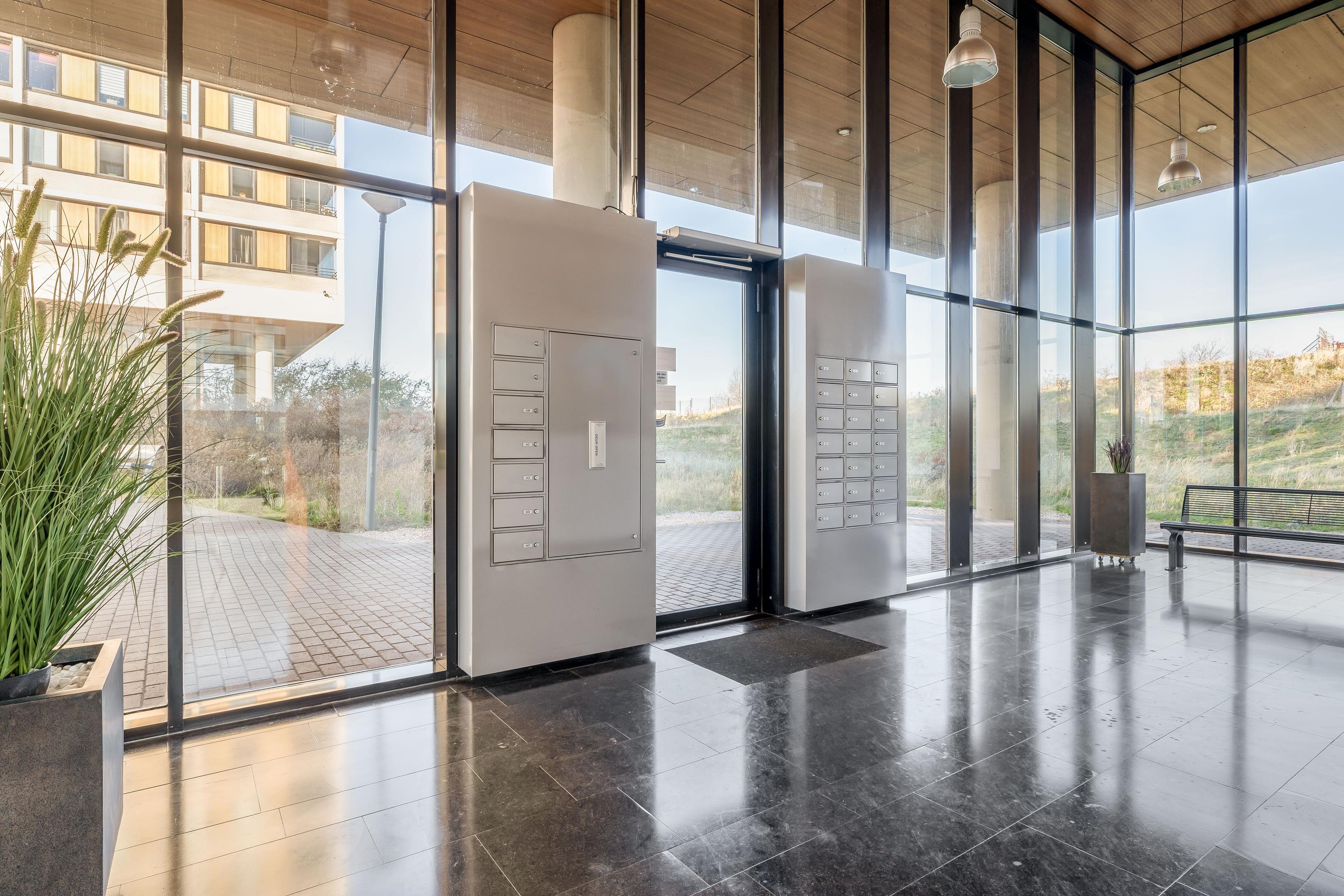 De afgesloten entree van het complex is voorzien van videofooninstallatie en lift. Op de vijfde verdieping bevindt zich de entree van het appartement.