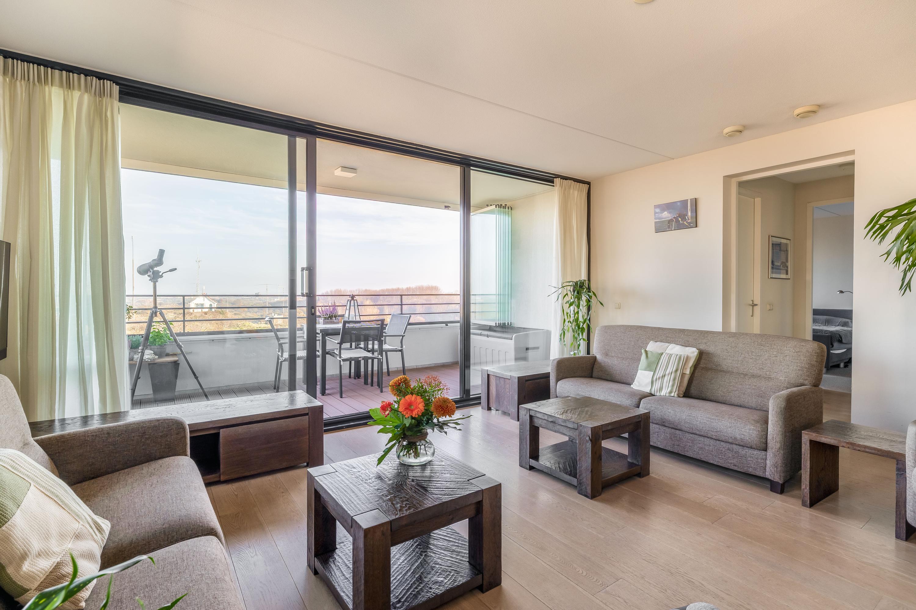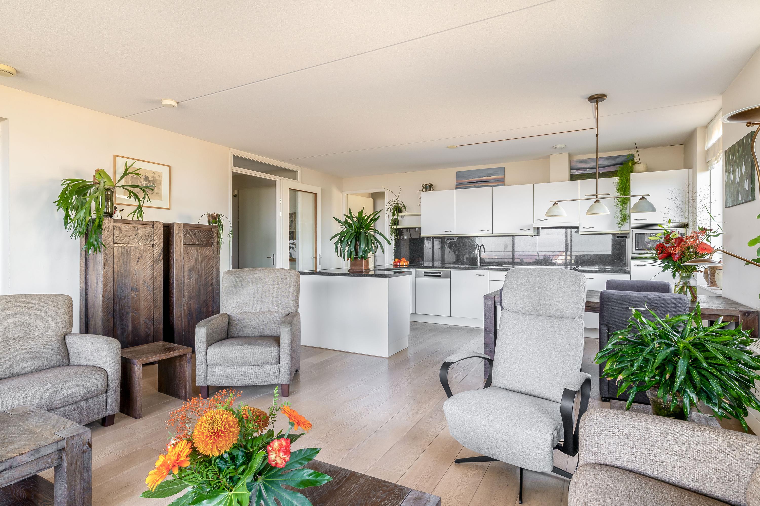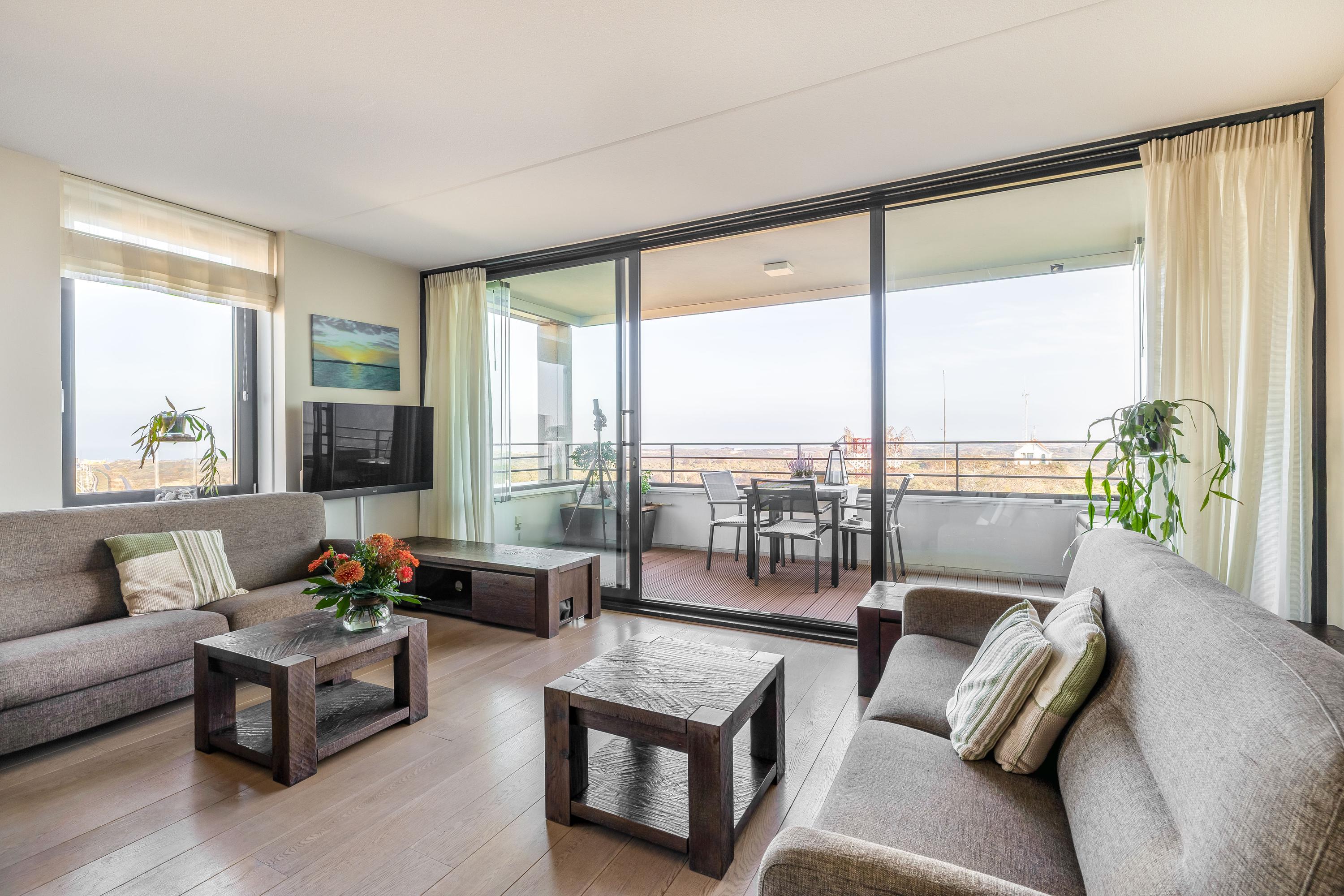 De woonkamer is een heerlijke, lichte leefruimte met panoramisch uitzicht over de duinen. Dankzij de grote schuifpui naar het balkon en de vele ramen voelt de ruimte bijzonder ruimtelijk aan. De kamer is afgewerkt met een lichte houten (lamelparket) vloer en neutrale wanden, wat zorgt voor een rustgevende uitstraling.