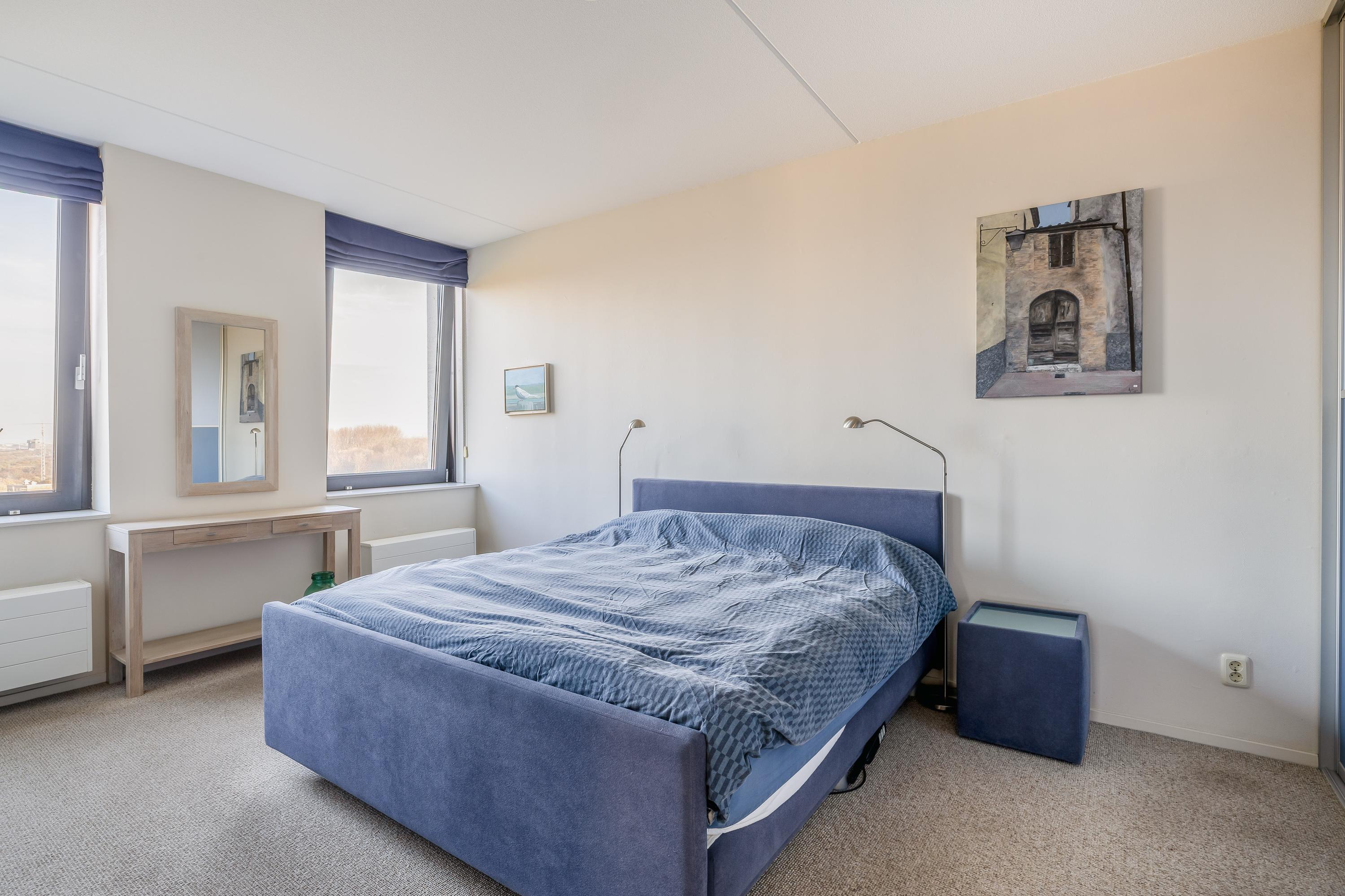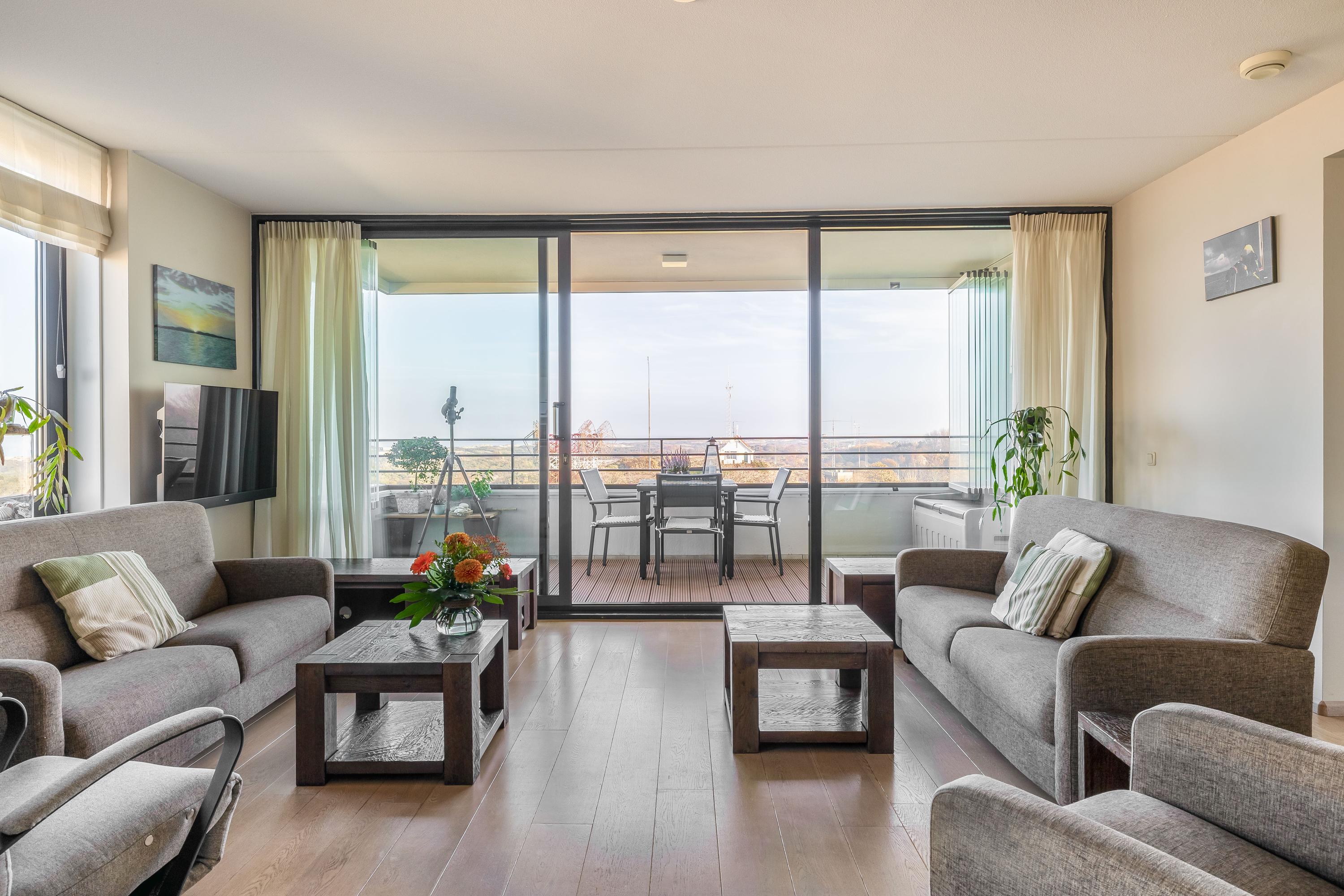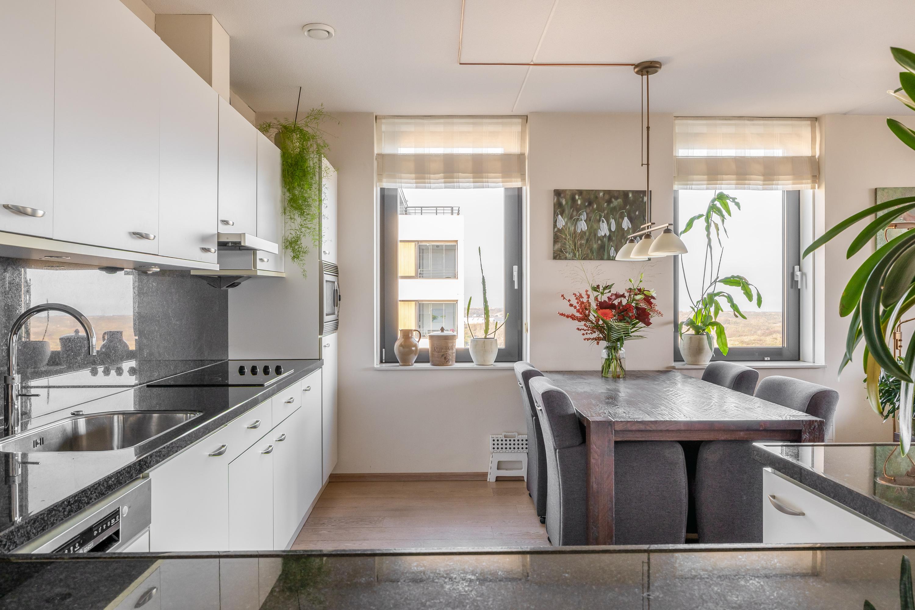 De woonkamer is een heerlijke, lichte leefruimte met panoramisch uitzicht over de duinen. Dankzij de grote schuifpui naar het balkon en de vele ramen voelt de ruimte bijzonder ruimtelijk aan. De kamer is afgewerkt met een lichte houten (lamelparket) vloer en neutrale wanden, wat zorgt voor een rustgevende uitstraling.