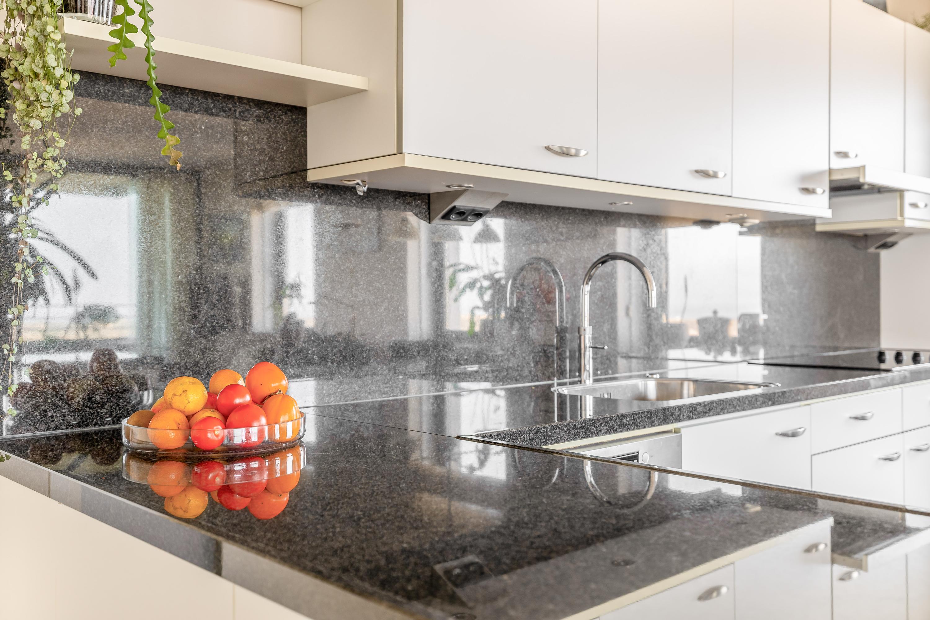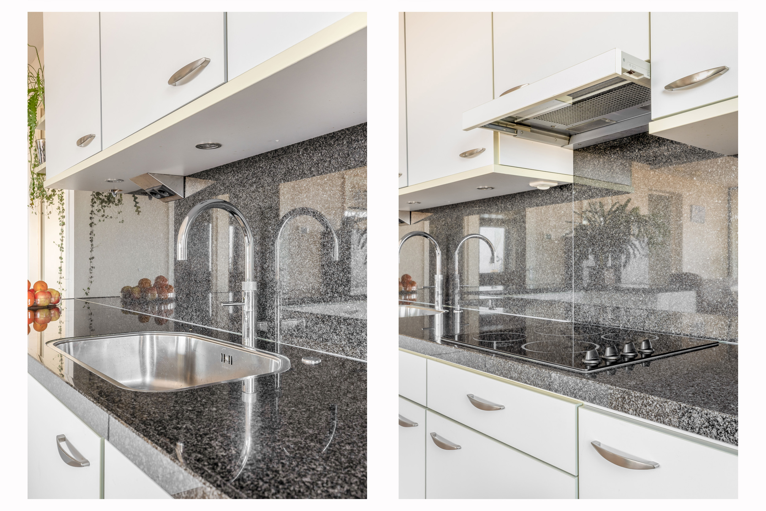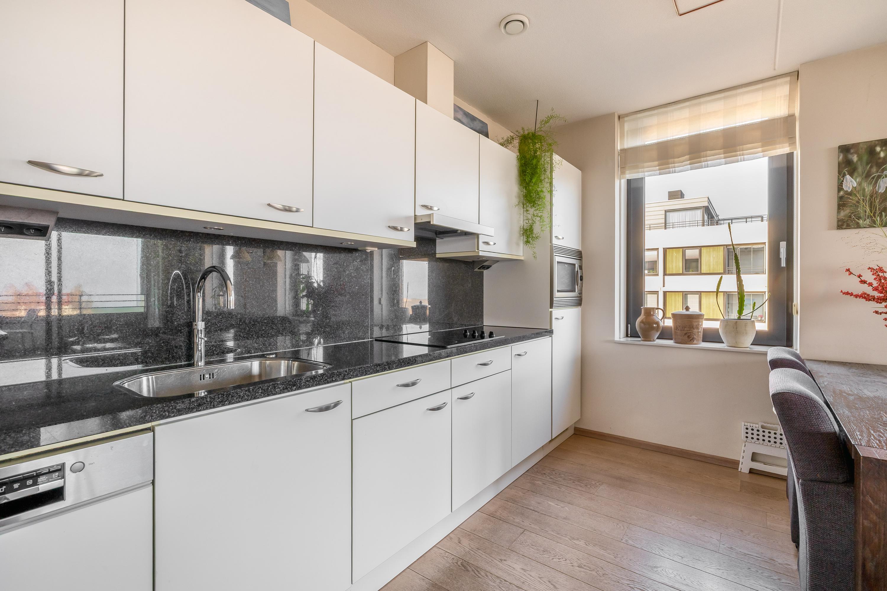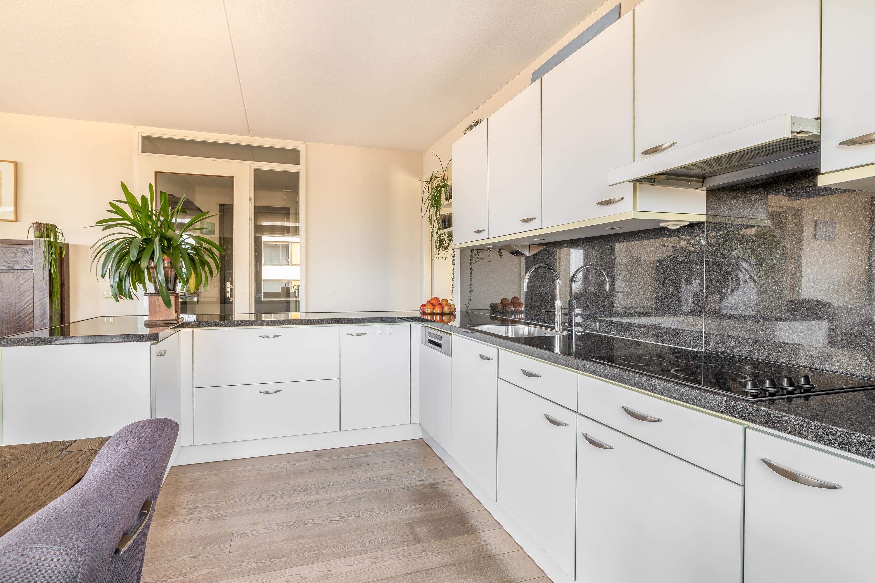 De open keuken (2007) is uitgevoerd in een tijdloze witte kleurstelling met granieten aanrechtblad en voorzien van diverse inbouwapparatuur, waaronder een inductiekookplaat, oven, magnetron, koelkast, vriezer en vaatwasser.