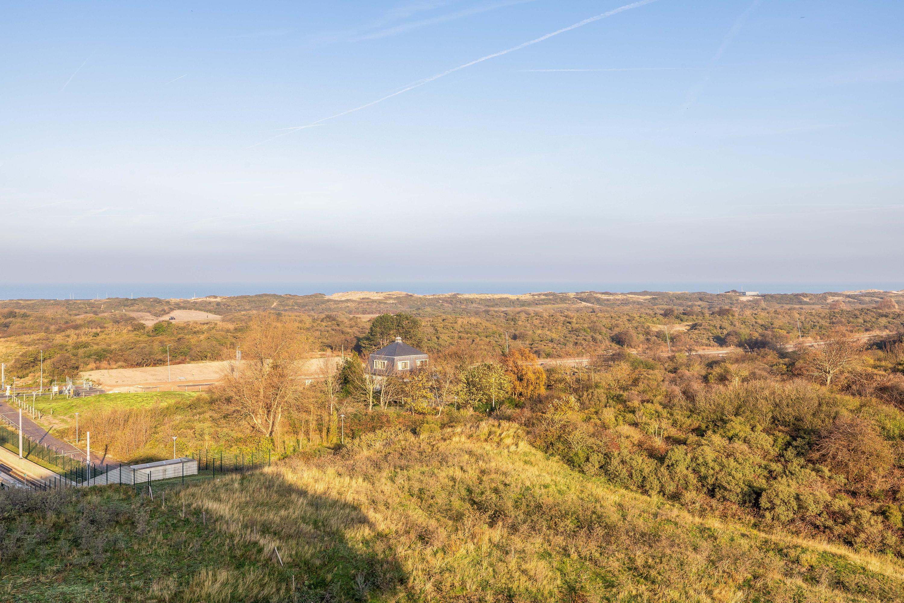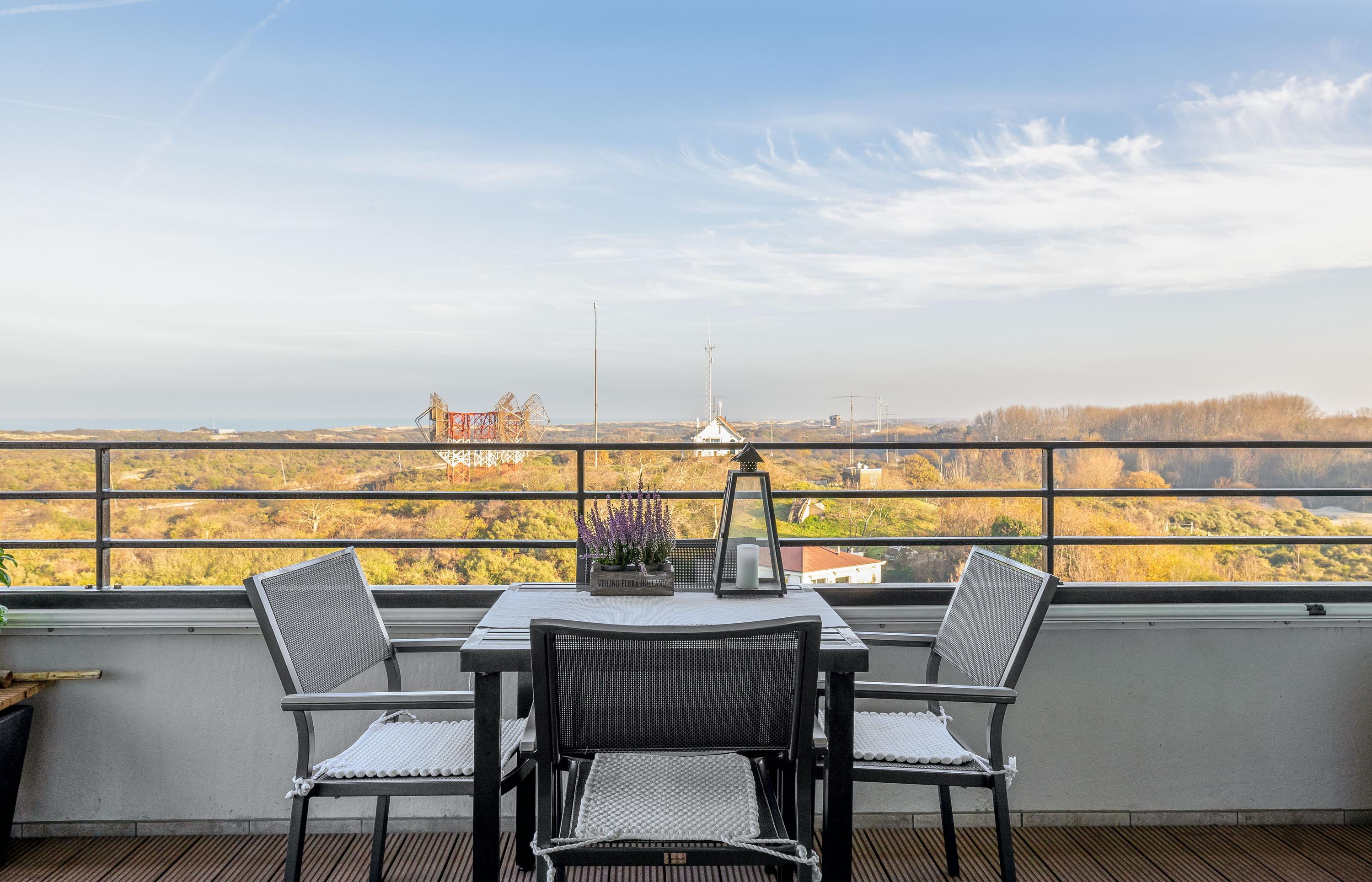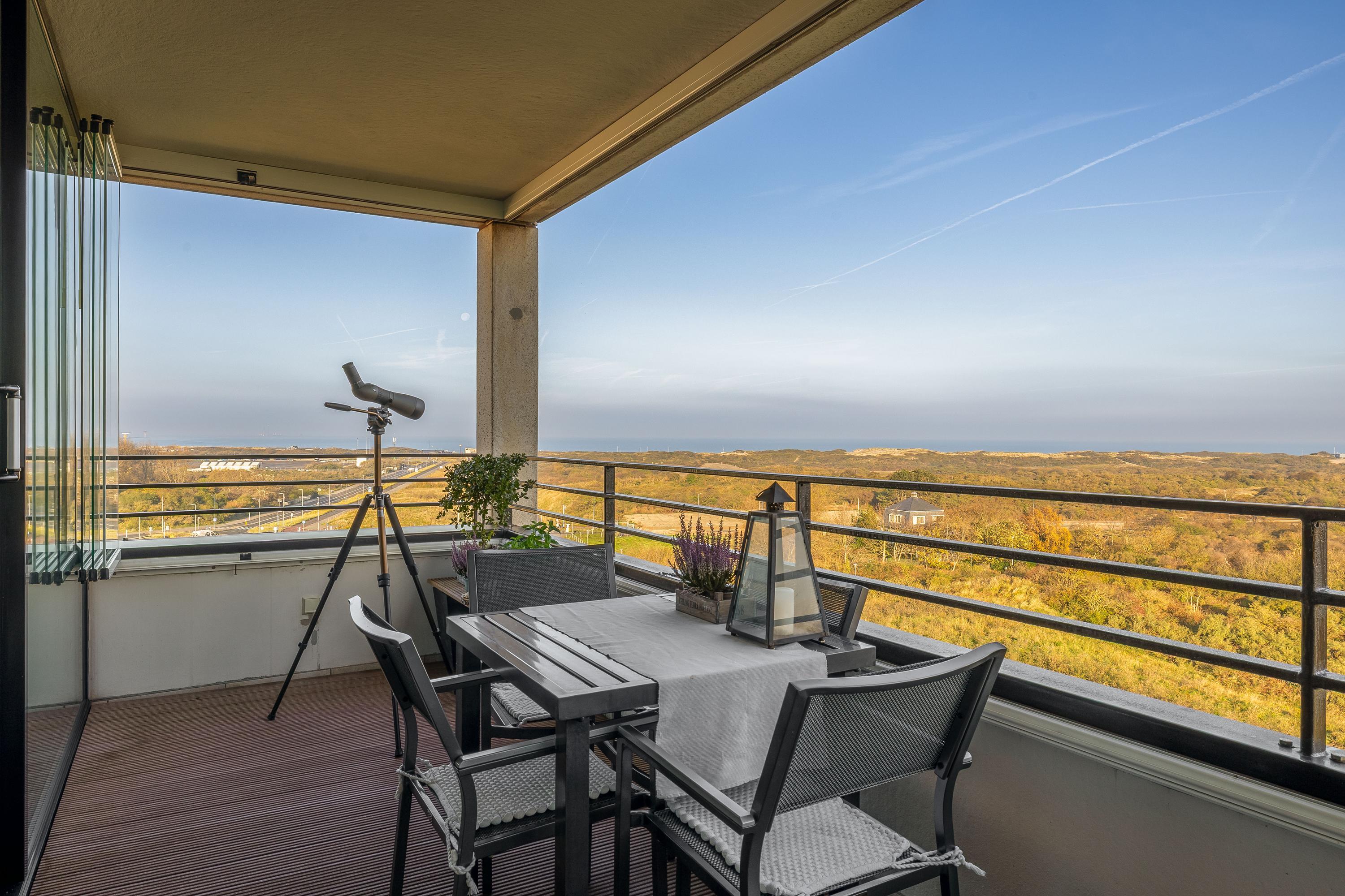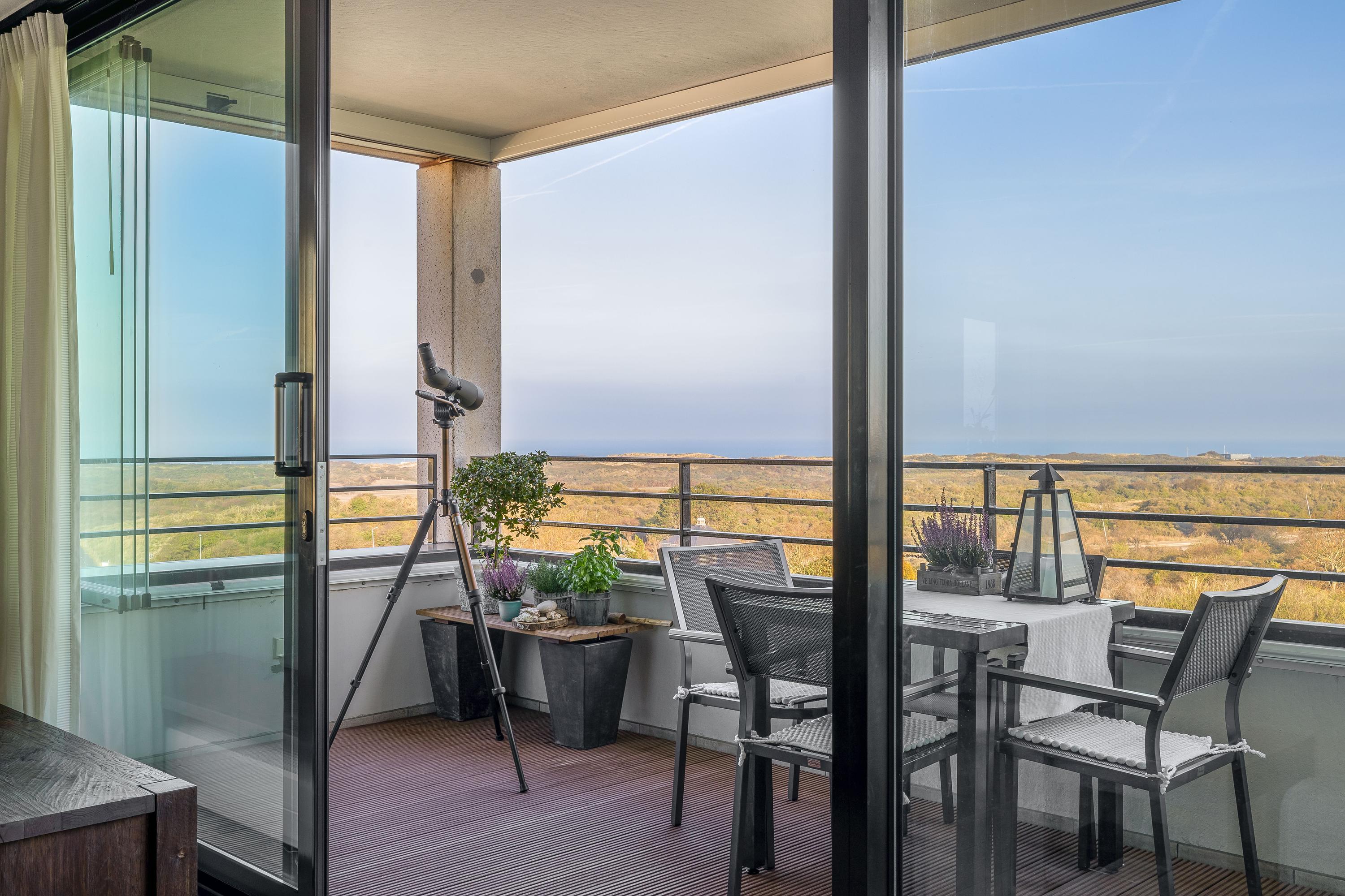Grenzend aan de woonkamer bevindt zich het ruime balkon op het westen, waar u van de middag zon én het adembenemende uitzicht kunt genieten. Dankzij de beschutte ligging en glazen windschermen zit u hier ook op koelere dagen heerlijk uit de wind. Vanaf dit punt kijkt u weids uit over het uitgestrekte duinlandschap en ziet u in de verte de zee glinsteren, een uitzicht dat nooit verveelt en elk moment van de dag een ander karakter heeft.