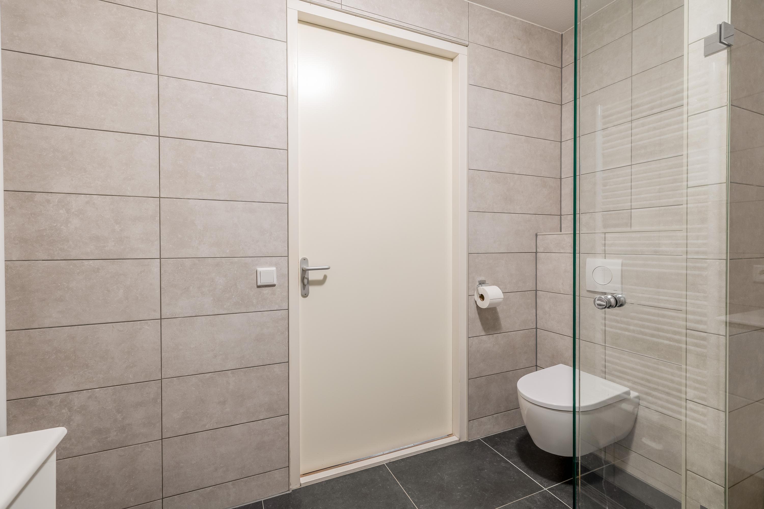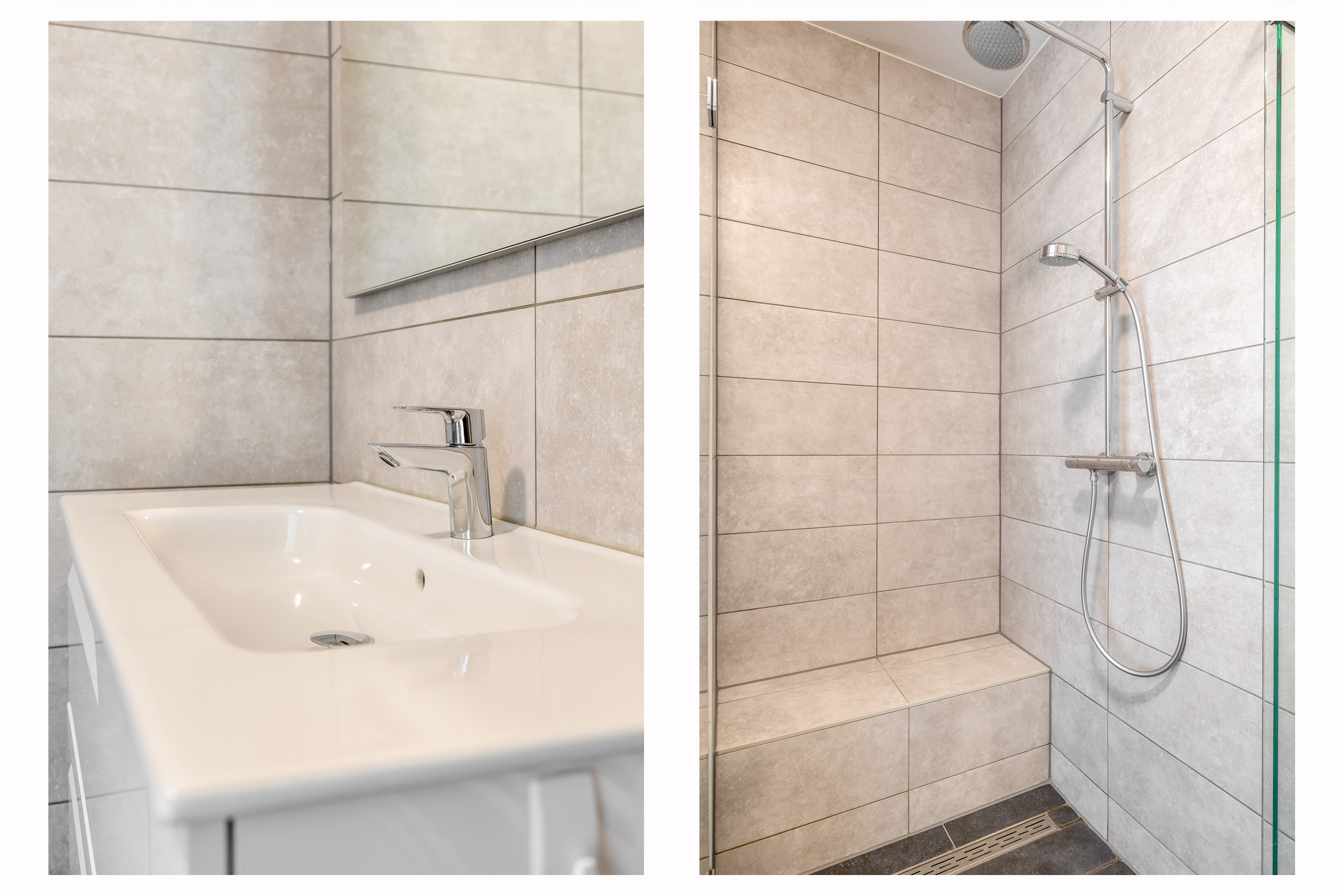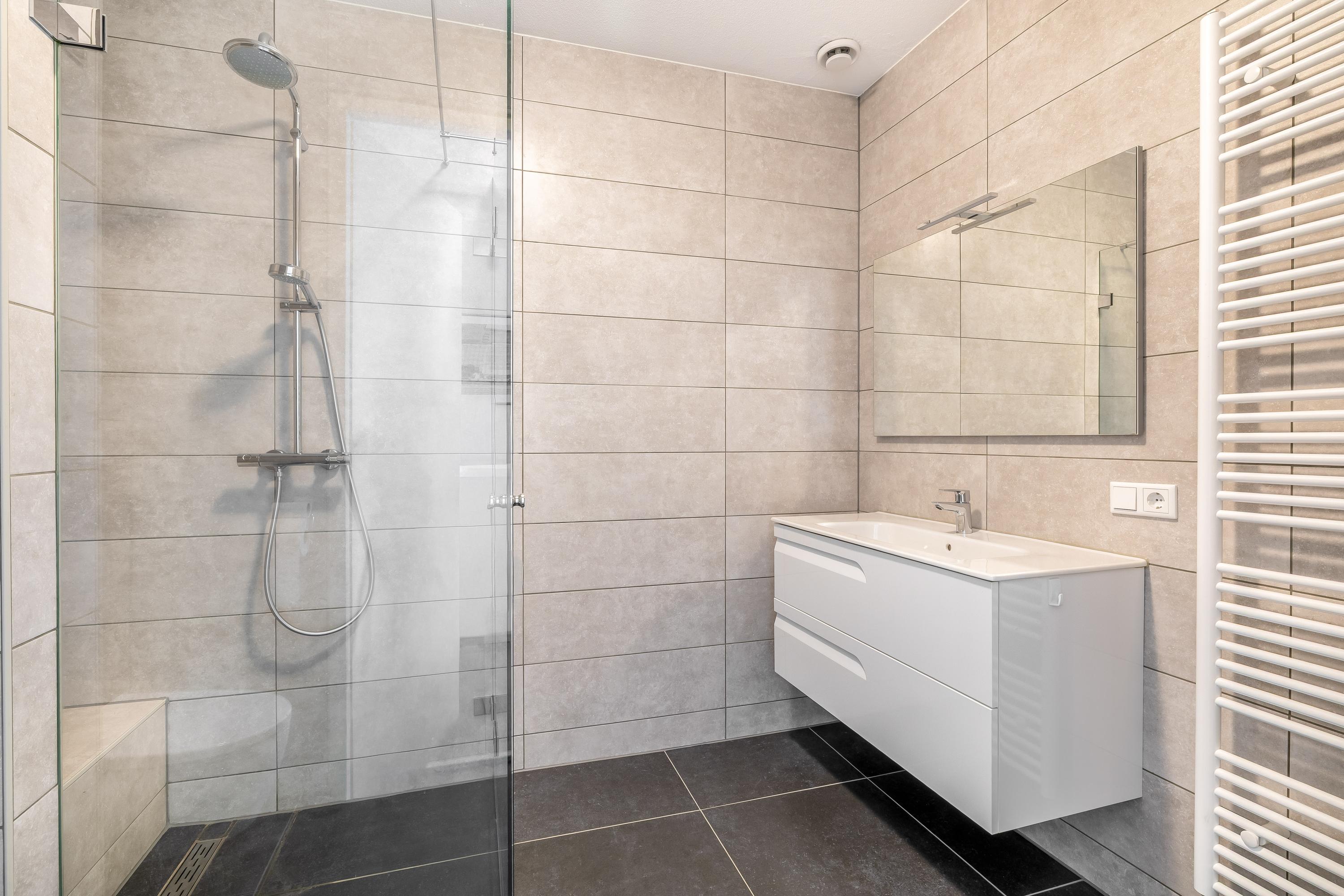 De badkamer is in 2023 volledig vernieuwd en modern afgewerkt met grote wand- en vloertegels, een royale inloopdouche met glazen scherm, een breed wastafelmeubel en tweede toilet.