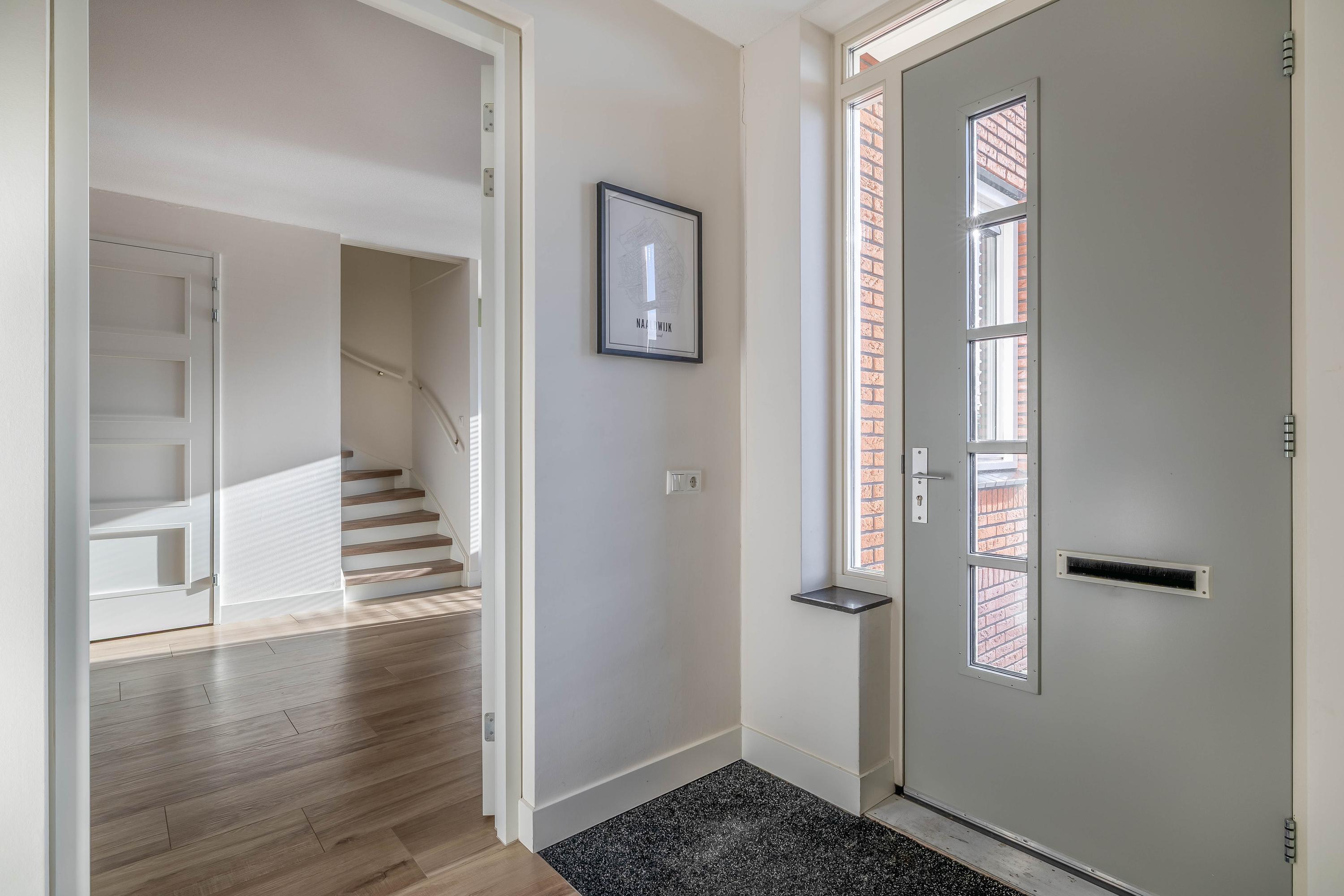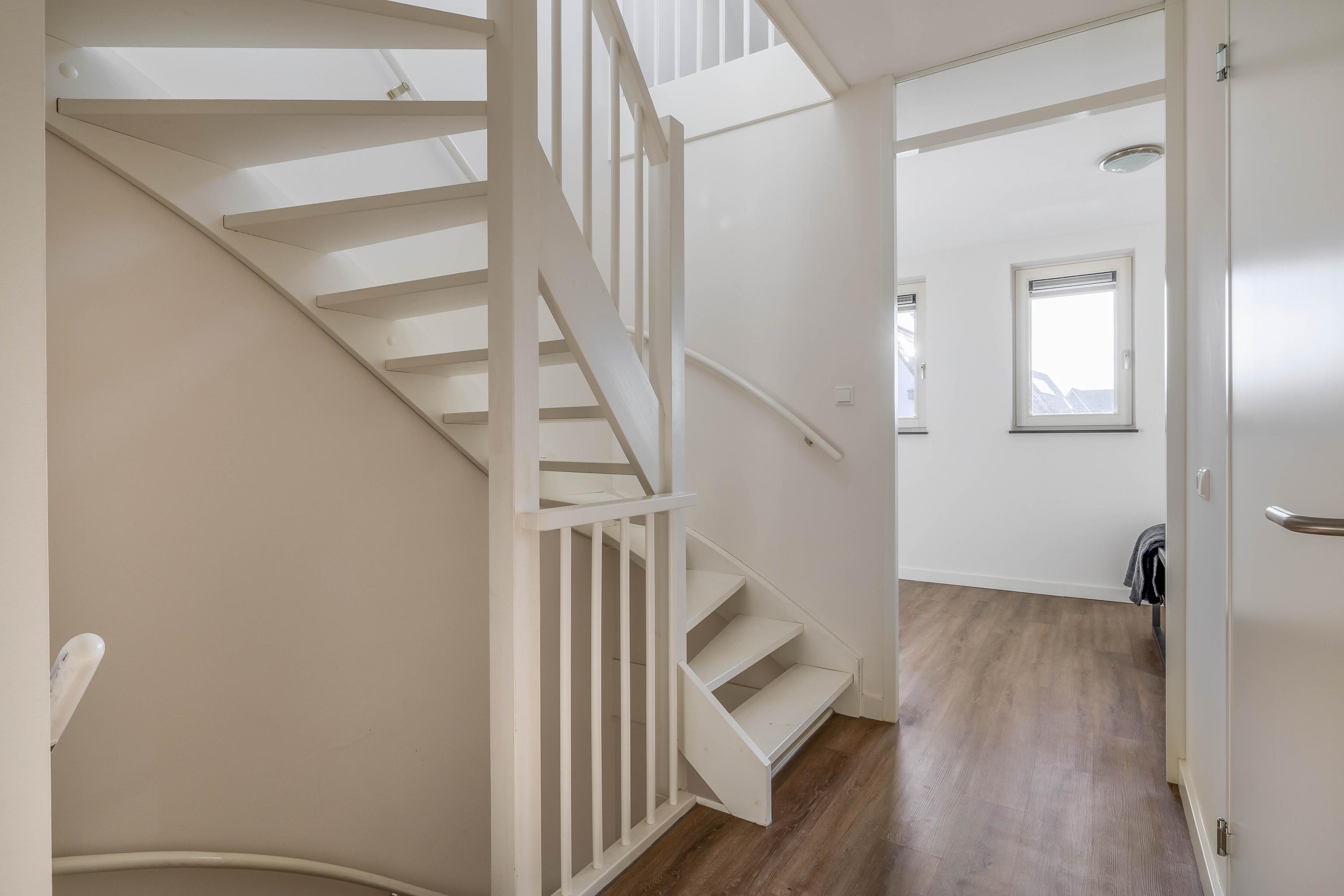 Via de voortuin en verzorgde entree kom je binnen in de hal, met ruimte voor de garderobe en het toilet. Vanuit hier is er toegang tot de woonkamer en de trap naar de verdieping. De houtlook vloer en rustige wandafwerking zorgen meteen voor een prettige eerste indruk.