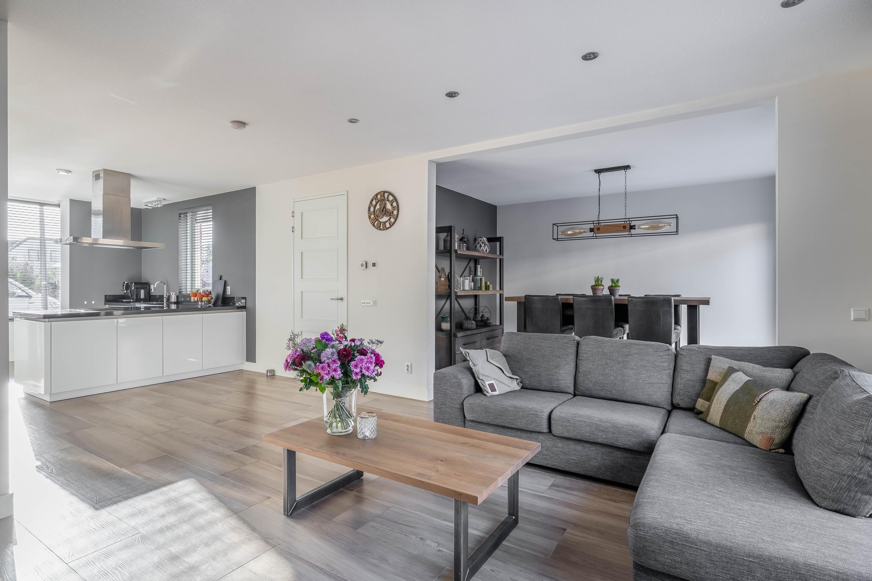 De woonkamer is ruim en speels ingedeeld, met meerdere fijne plekken om te tafelen, te borrelen of juist heerlijk te ontspannen. Een leefruimte die uitnodigt om samen te komen en waar je je direct thuis voelt.