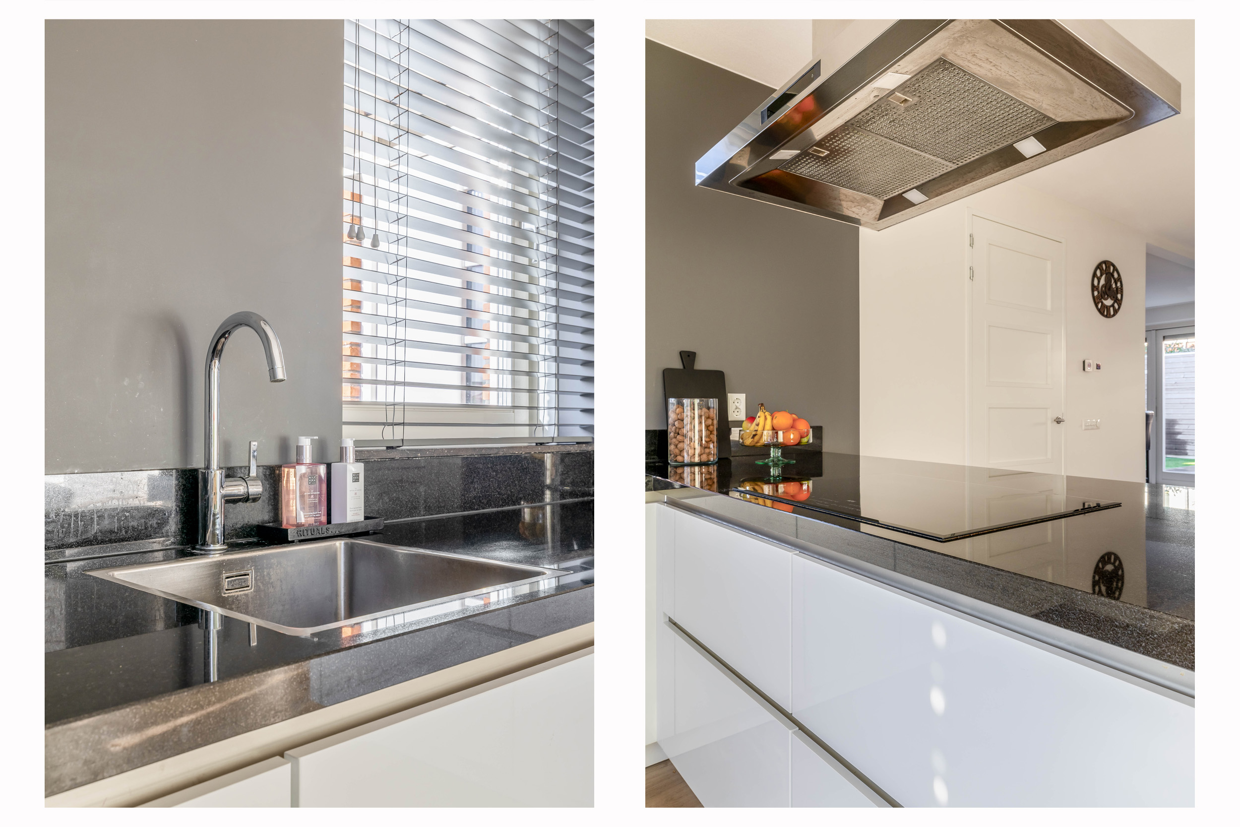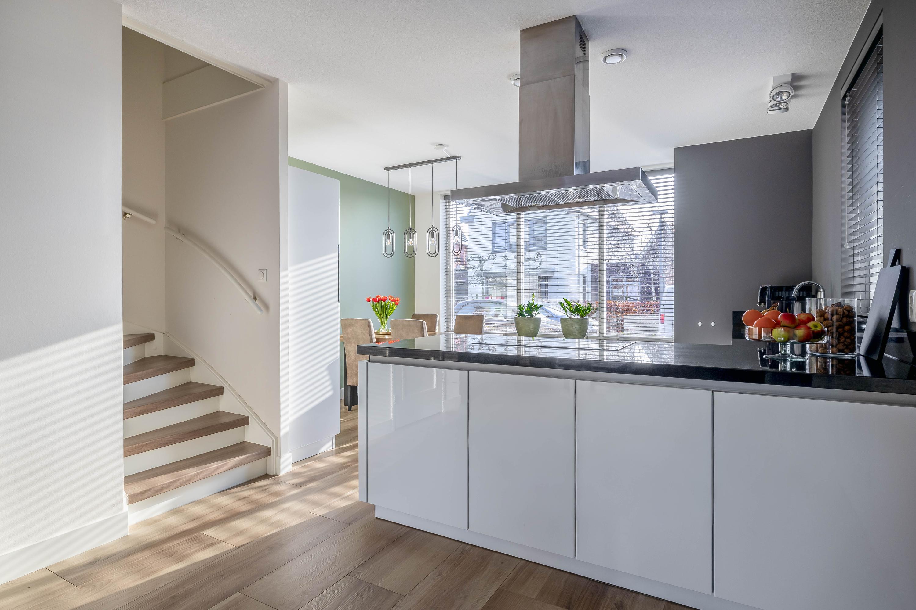 De woonkeuken (2018) sluit hier naadloos op aan en is modern uitgevoerd in een hoekopstelling met een royaal werkblad. De greeploze witte kasten in combinatie met het donkere blad geven de keuken een strakke, eigentijdse uitstraling. De keuken is compleet uitgerust met onder andere een inductiekookplaat met afzuigkap, vaatwasser, combi-magnetron, spoelbak en volop kastruimte.
