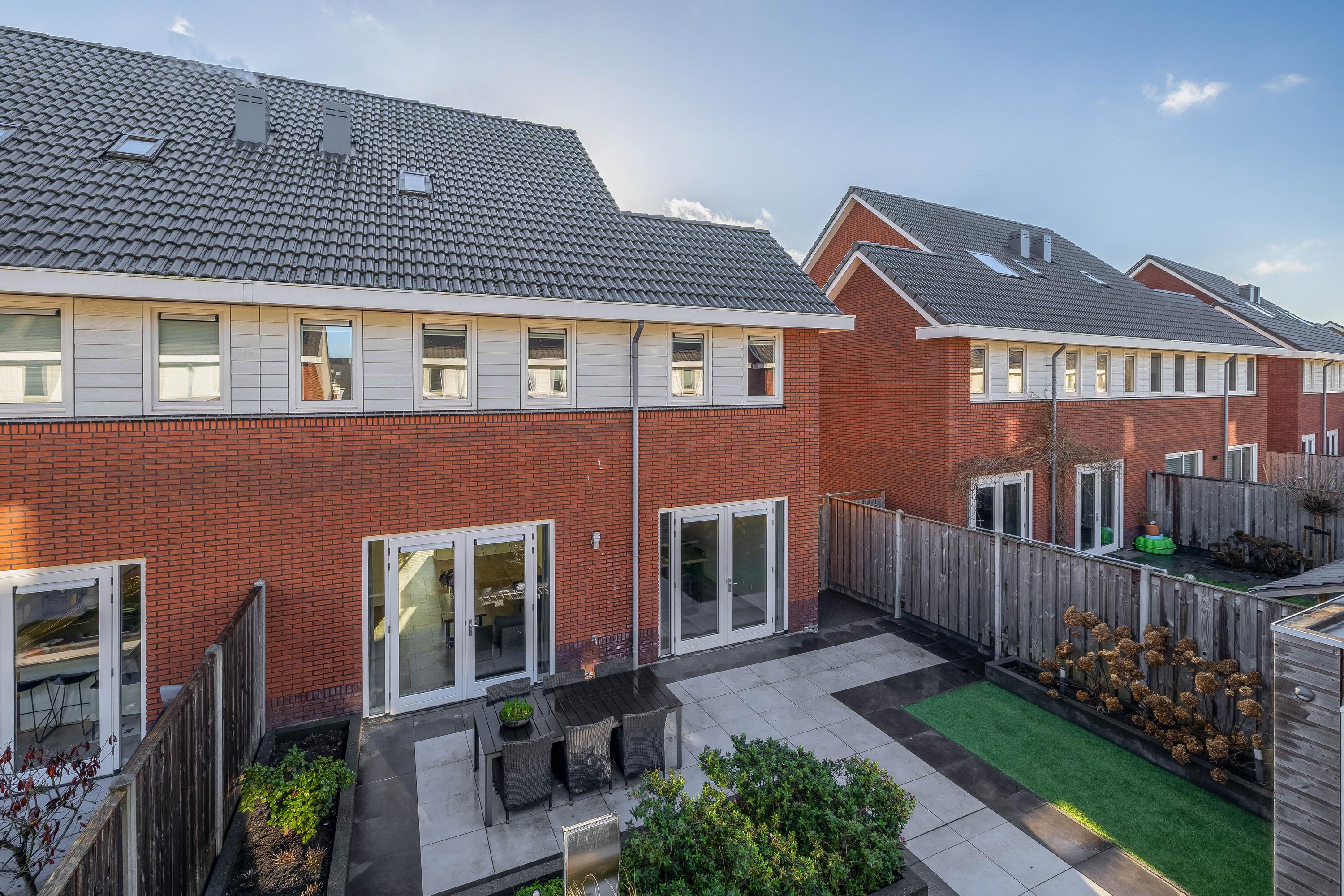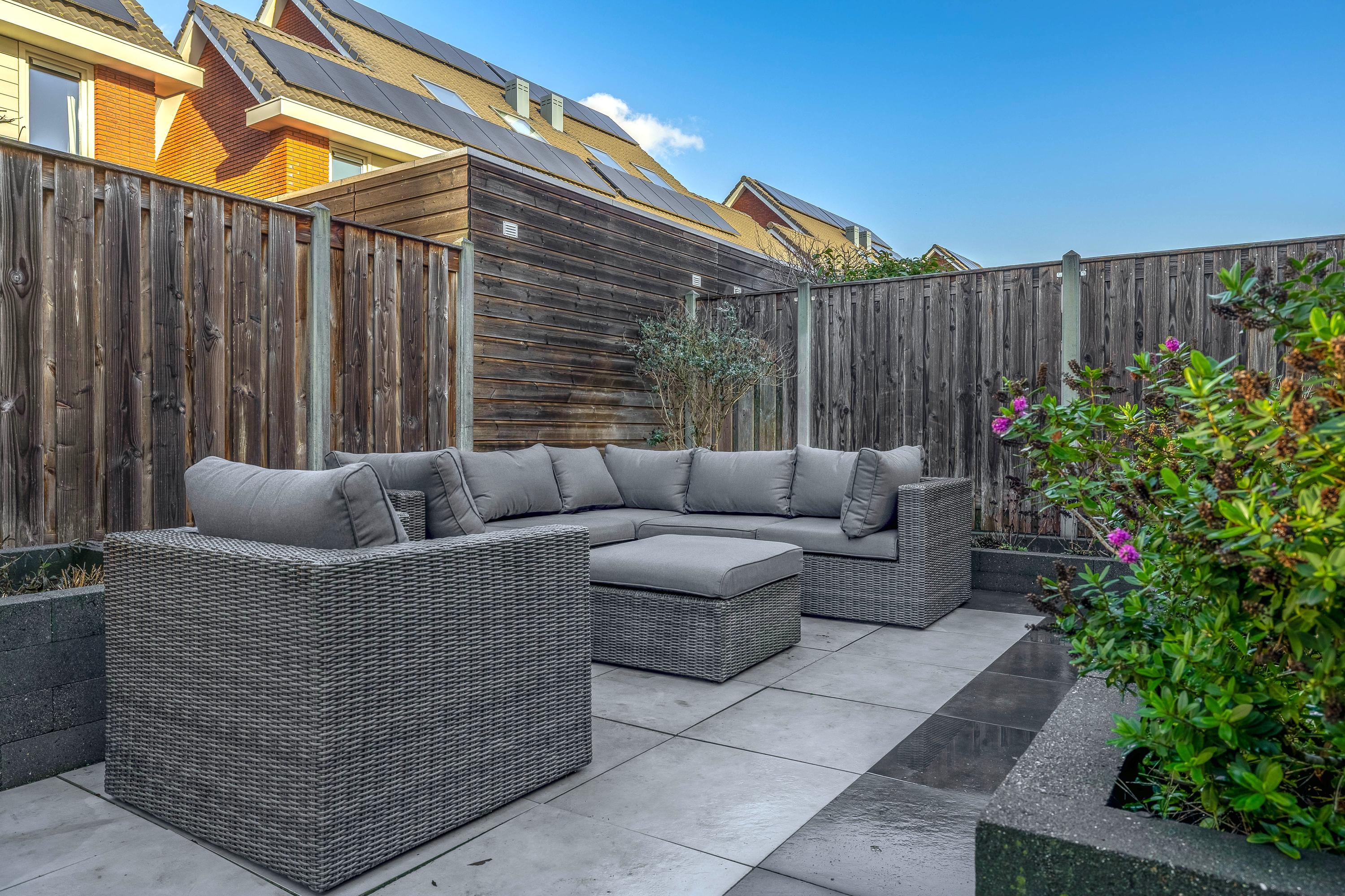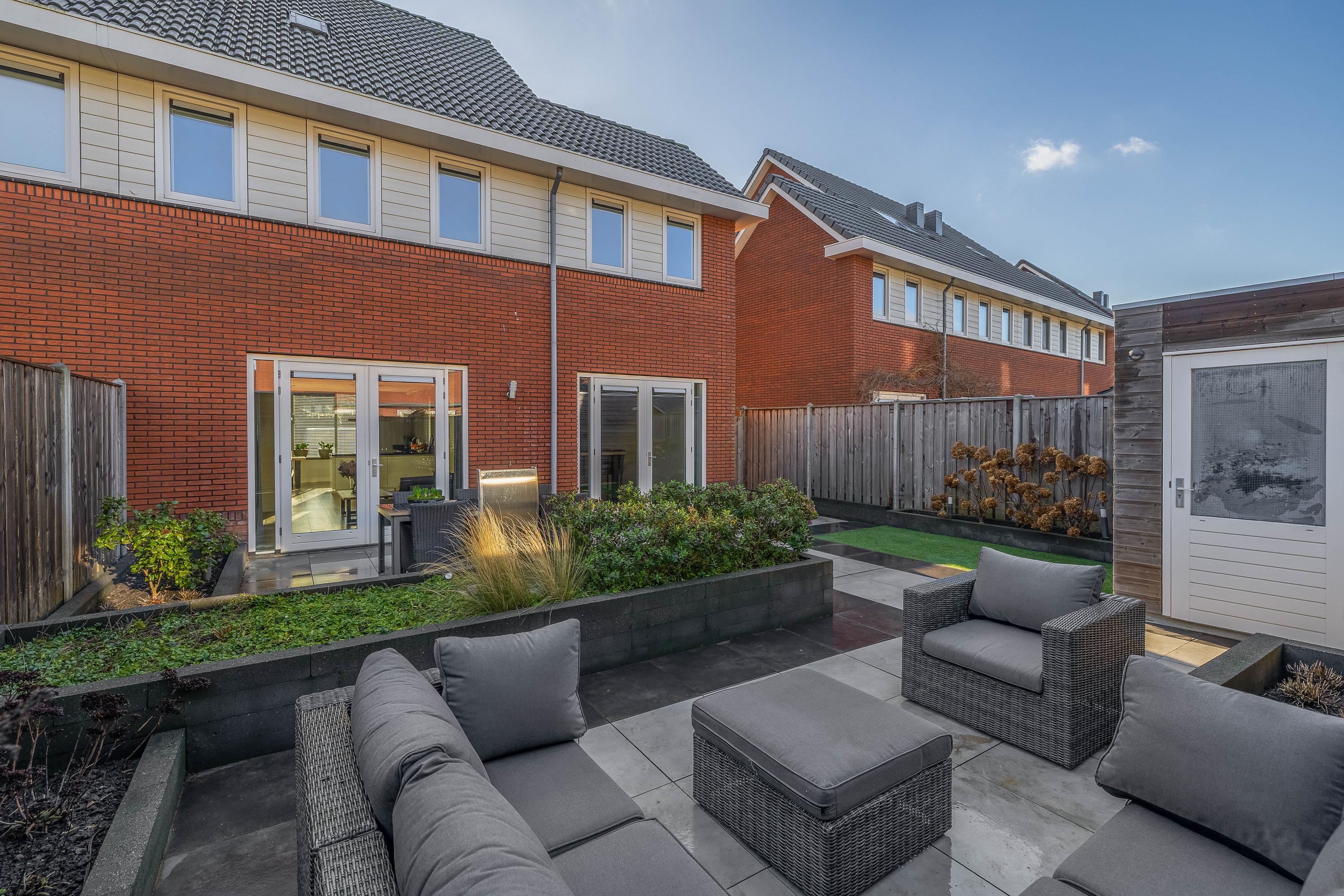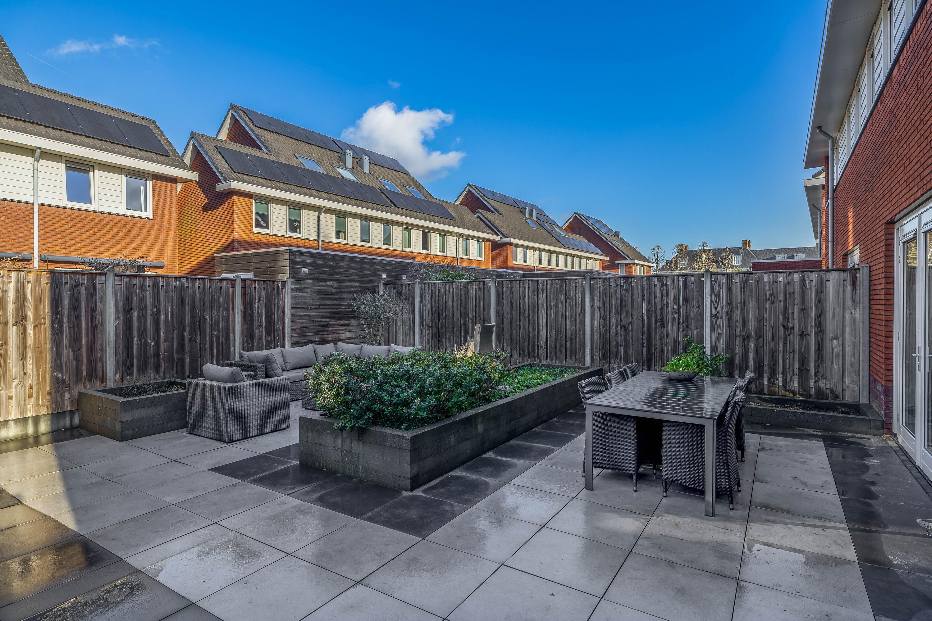 De achtertuin is fraai aangelegd en biedt volop ruimte om te ontspannen of gezellig buiten te eten. Het ruime terras, gecombineerd met de strakke plantenbakken, zorgt voor een prettige balans tussen groen en zitruimte. De tuin is onderhoudsvriendelijk opgezet en biedt voldoende privacy. De achtergevel is uitgevoerd met houten kozijnen op de begane grond en kunststof kozijnen op de andere verdiepingen. Via de openslaande deuren staat de woonkamer in directe verbinding met de tuin, waardoor binnen en buiten op een natuurlijke manier in elkaar overlopen.
