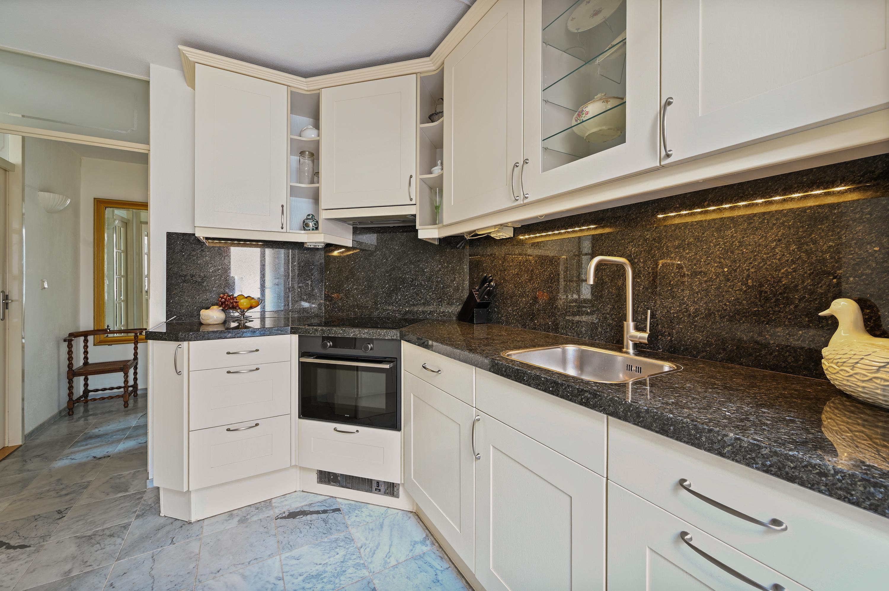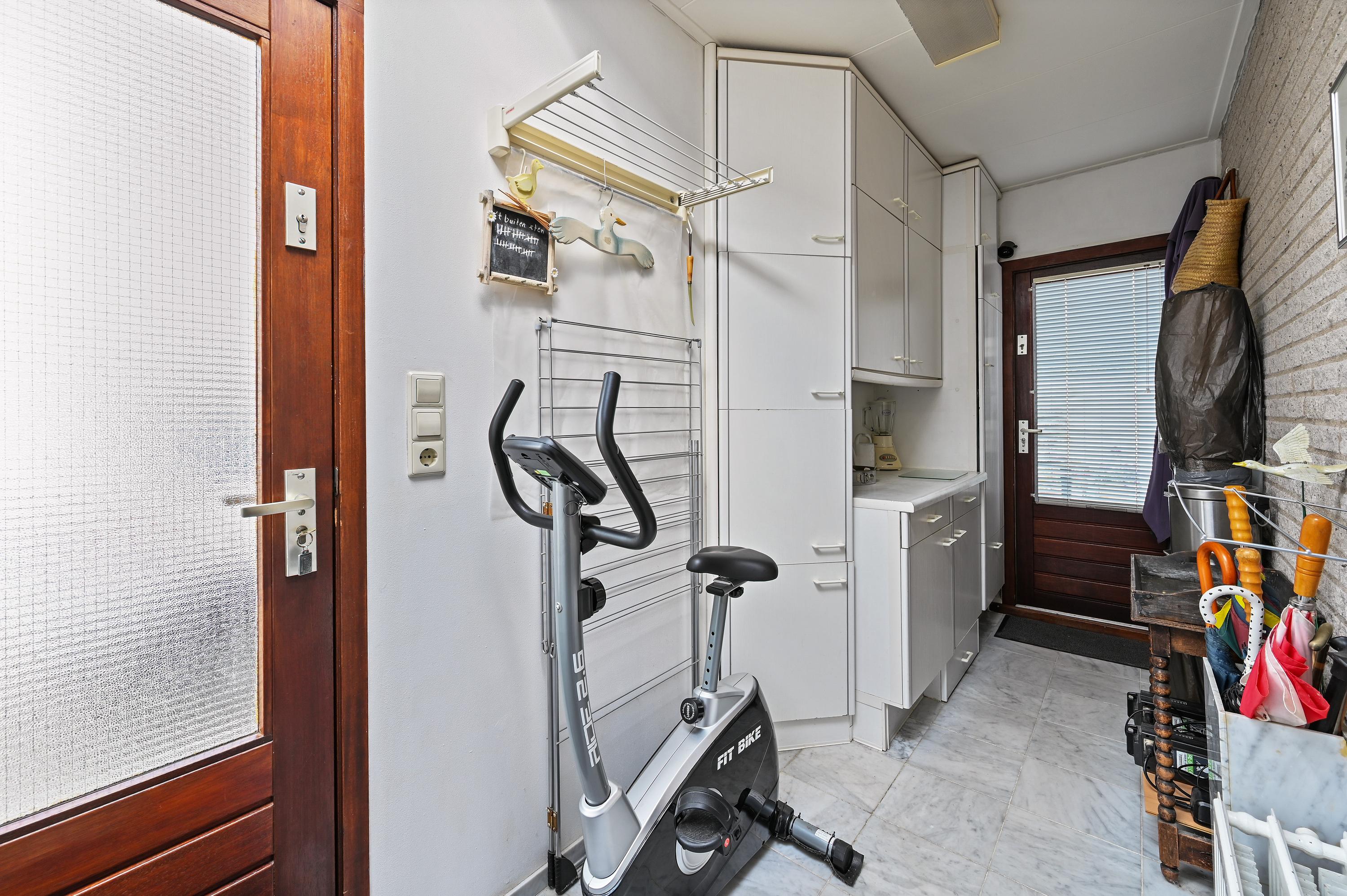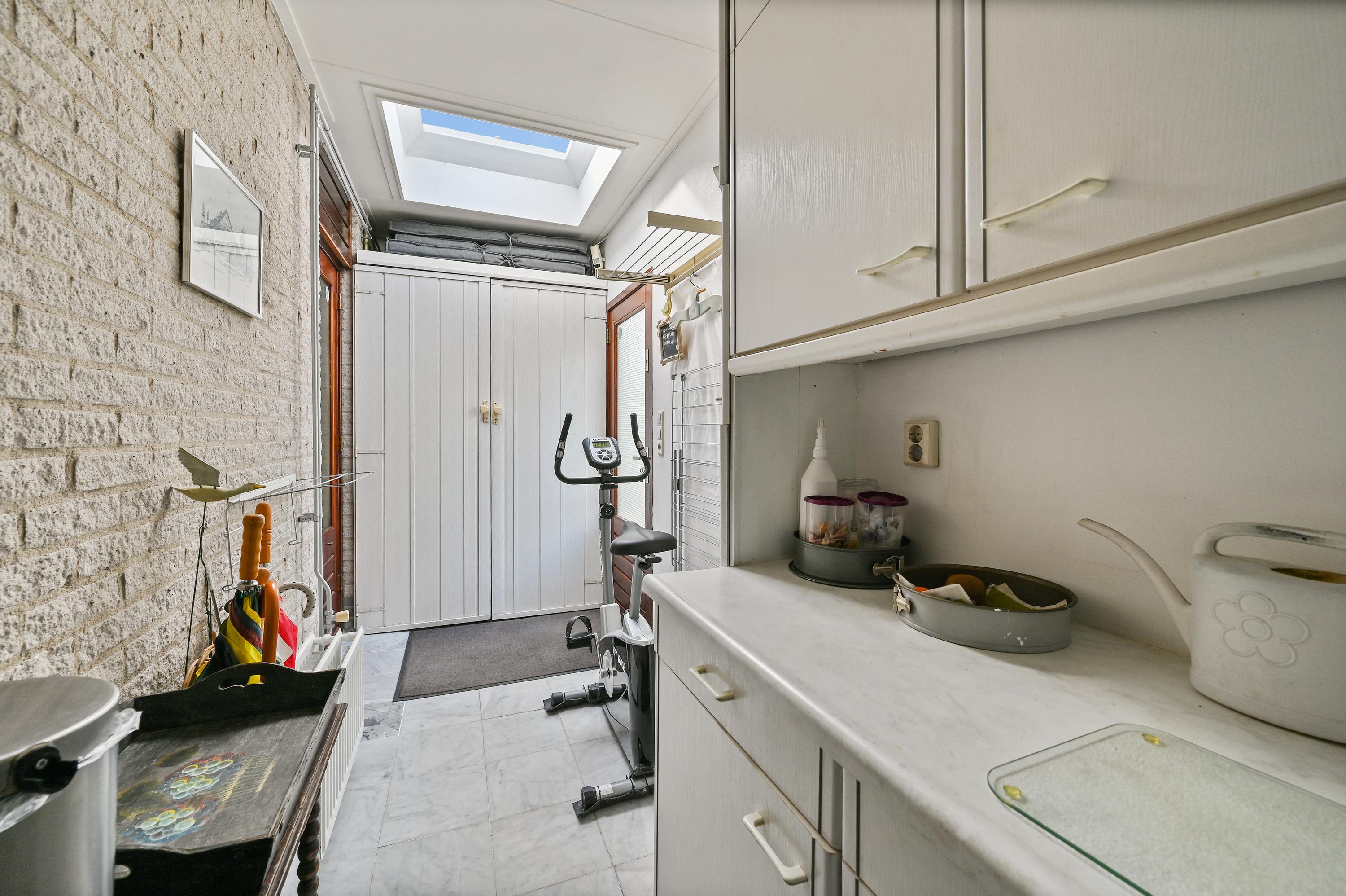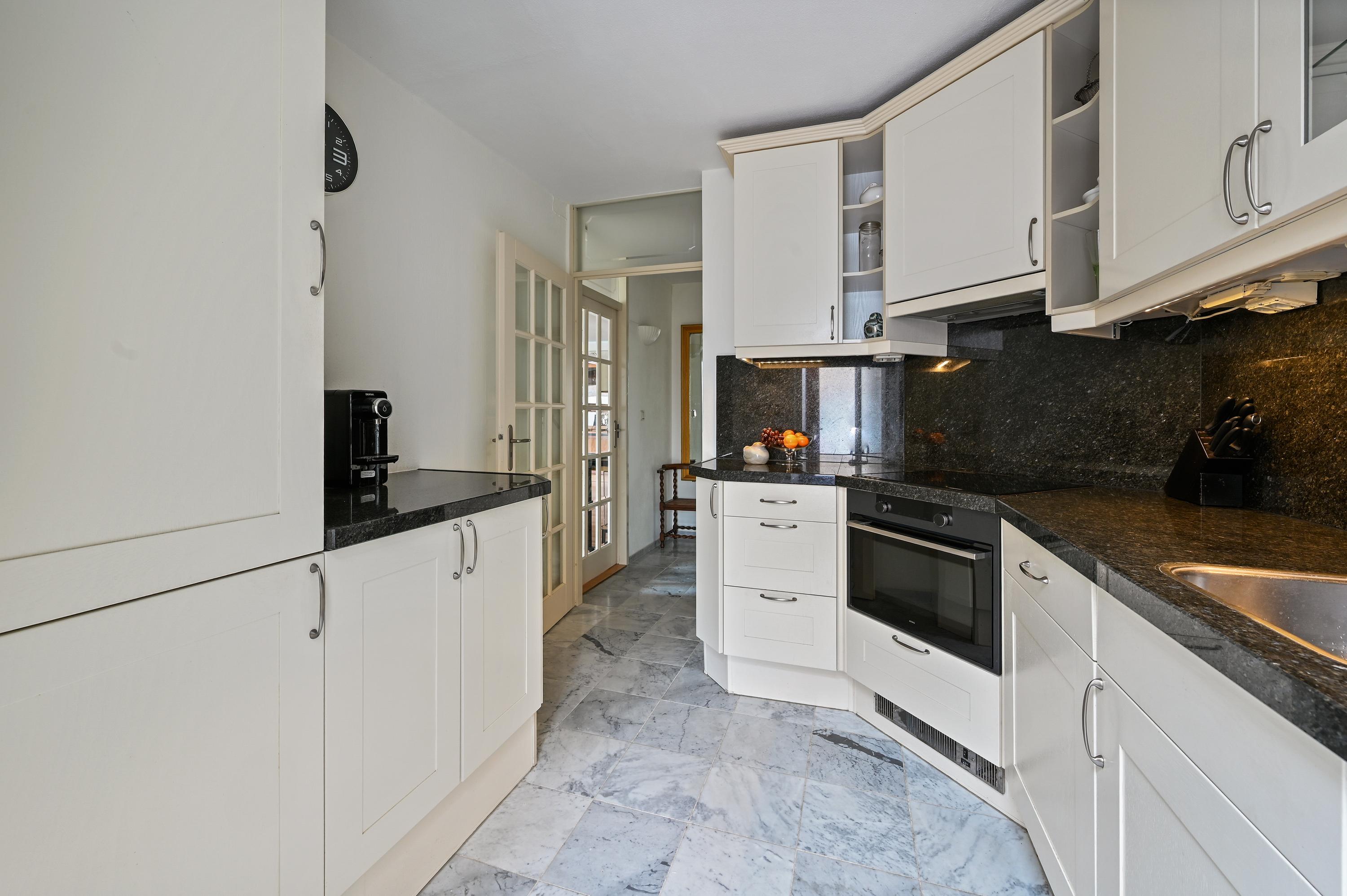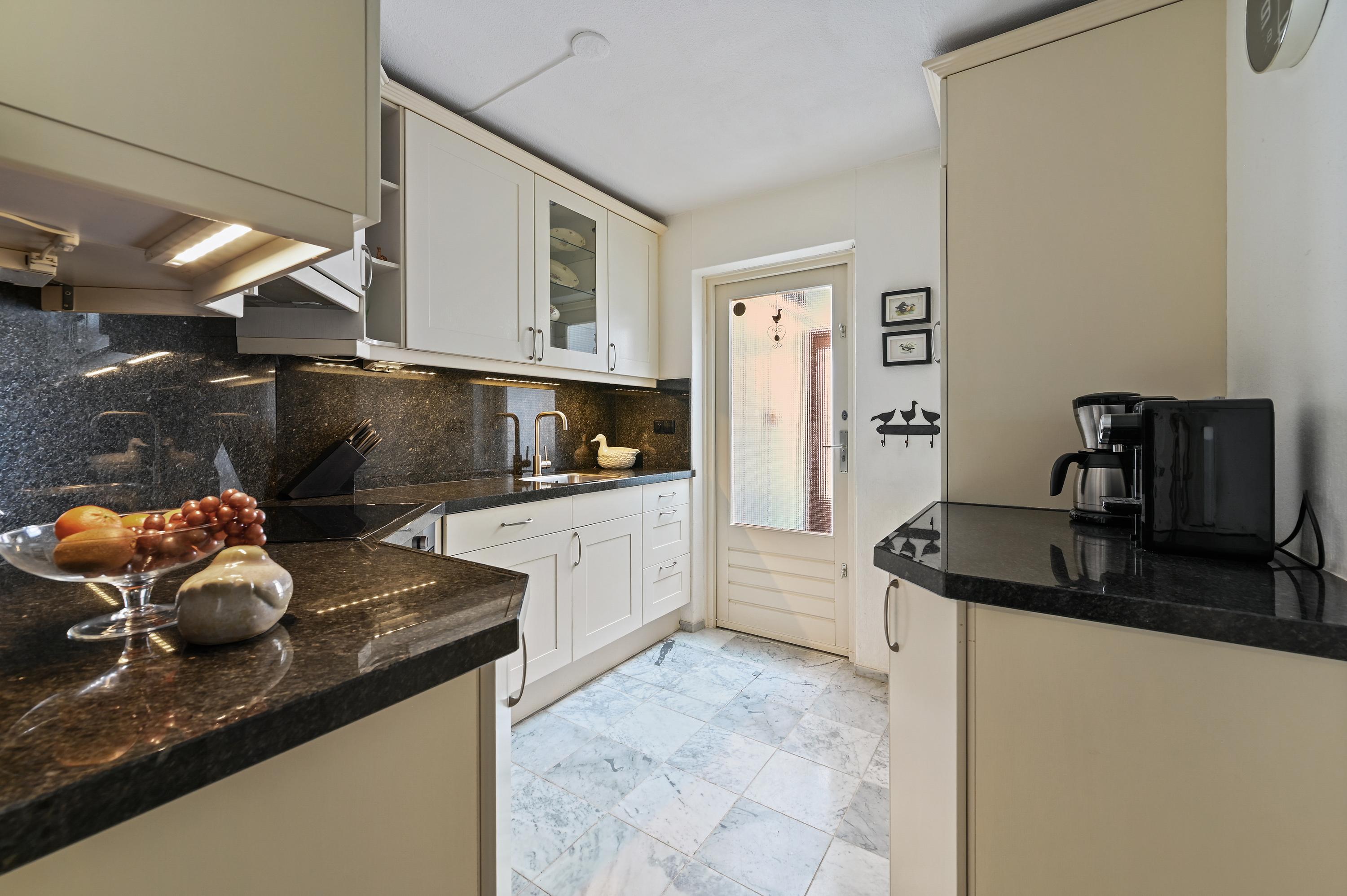 De keuken is uitgevoerd in een lichte kleurstelling en voorzien van een granieten werkblad, diverse inbouwapparatuur en voldoende kastruimte. Aansluitend bevindt zich de bijkeuken, die extra bergruimte en een praktische wasmachineaansluiting biedt. Vanuit hier is er tevens toegang tot de verzorgde voortuin met zonnige ligging en volop privacy.
