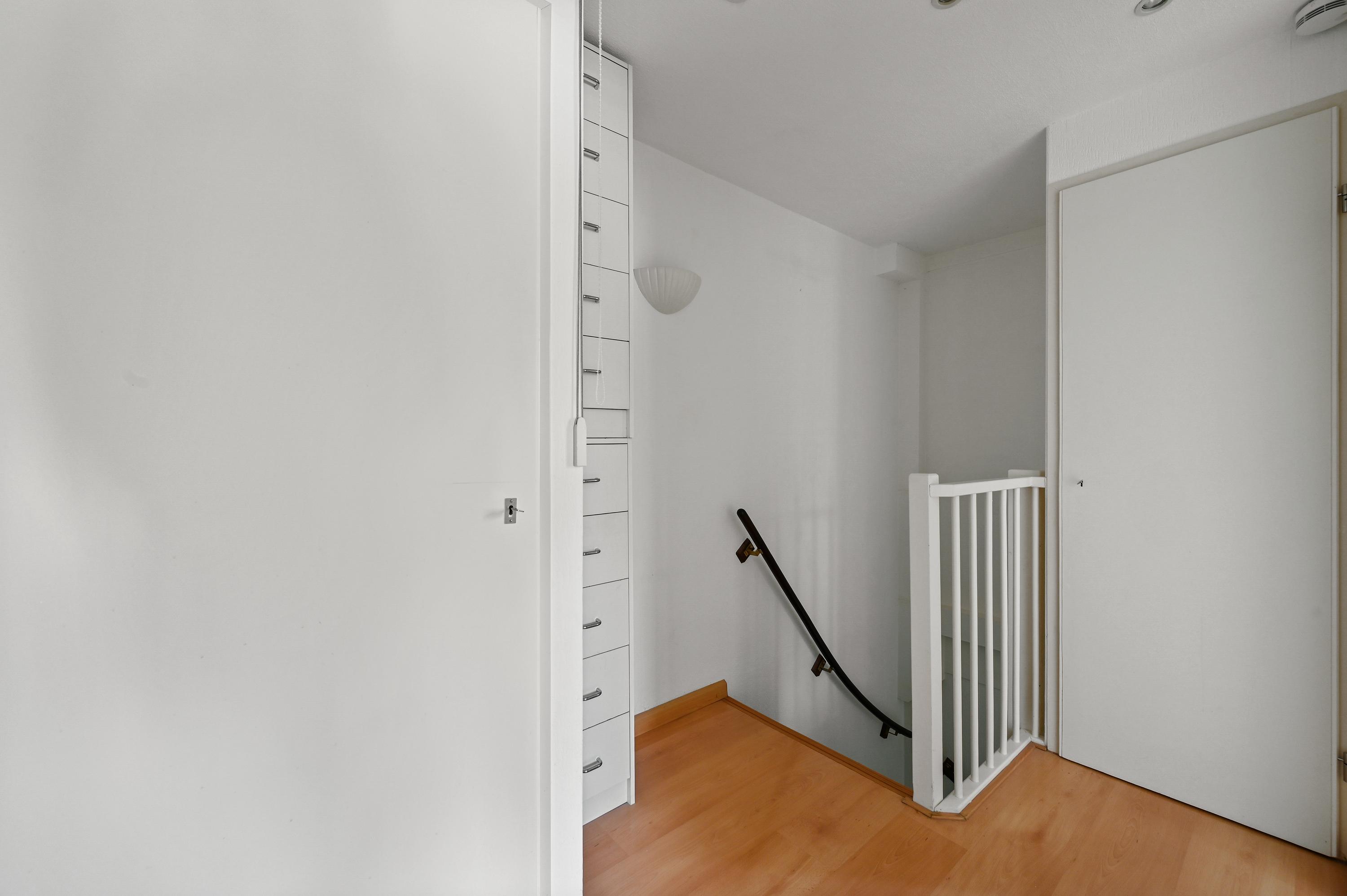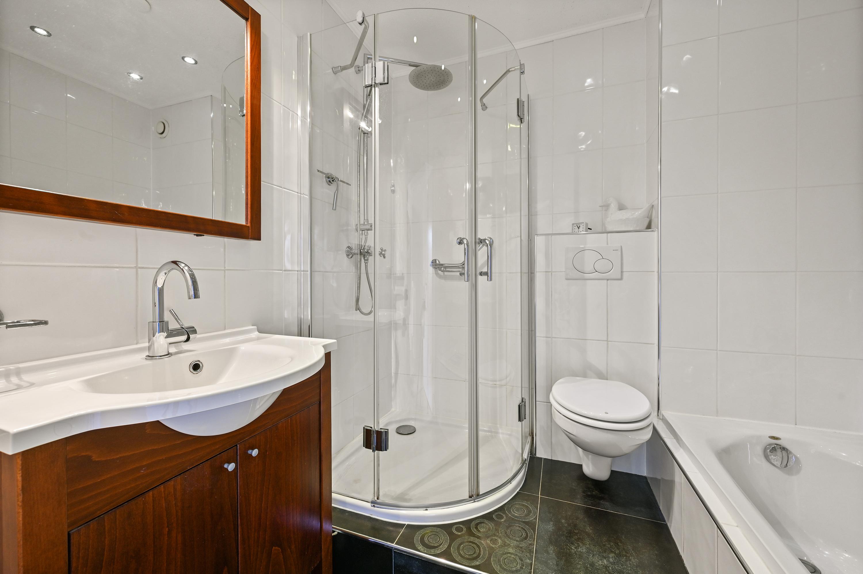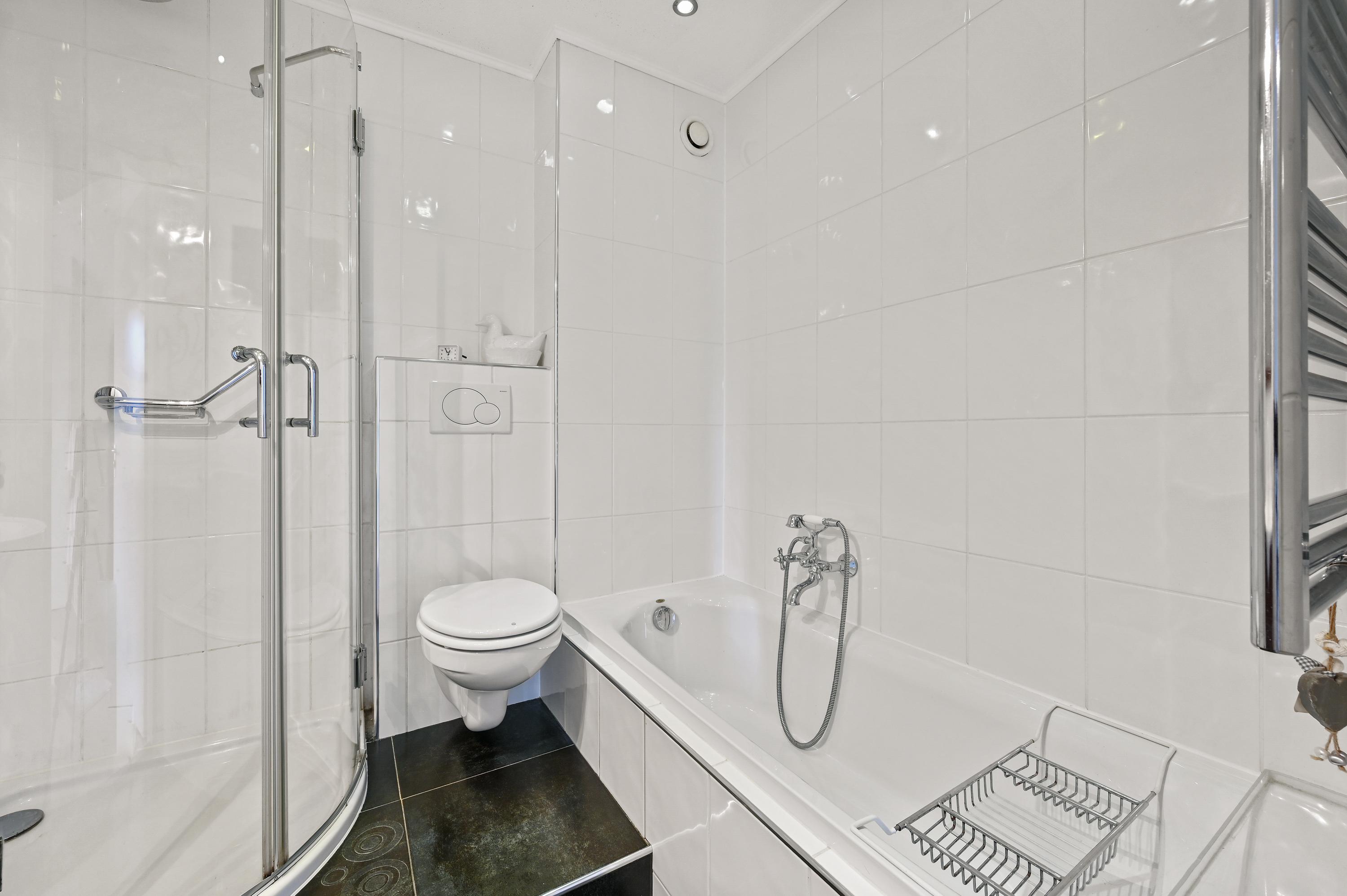 De overloop geeft toegang tot twee ruime slaapkamers, waarvan de grootste directe toegang heeft tot het royale dakterras van circa 16 m², een heerlijke plek om van de zon te genieten. De badkamer is compleet uitgerust met een douchecabine, ligbad, wastafelmeubel en tweede toilet.