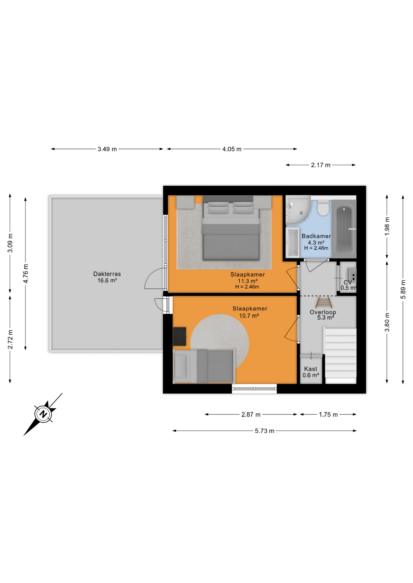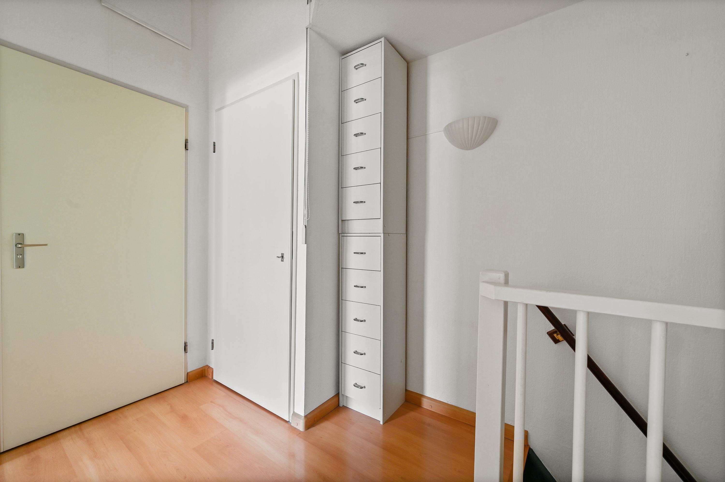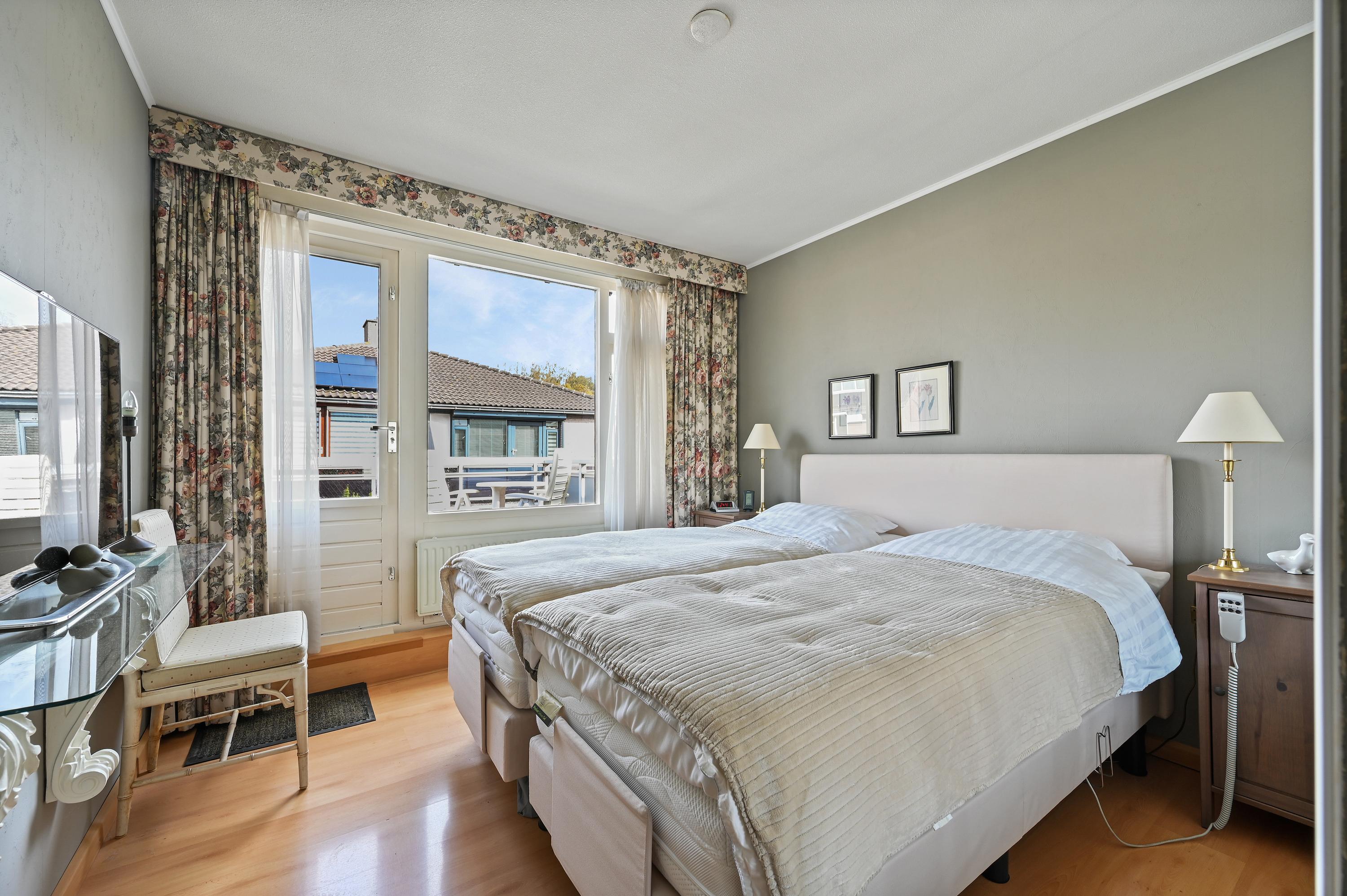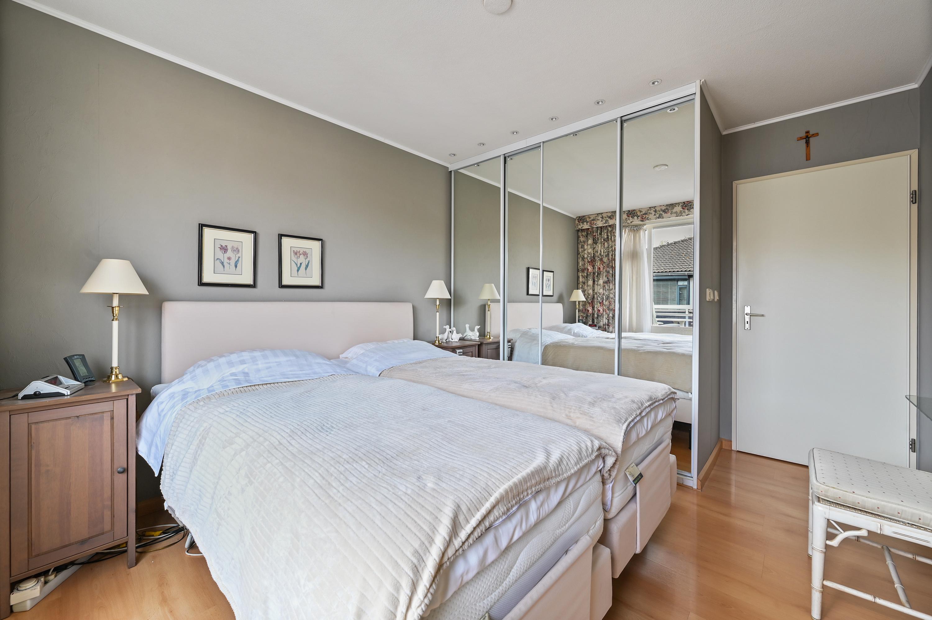De overloop geeft toegang tot twee ruime slaapkamers, waarvan de grootste directe toegang heeft tot het royale dakterras van circa 16 m², een heerlijke plek om van de zon te genieten. De badkamer is compleet uitgerust met een douchecabine, ligbad, wastafelmeubel en tweede toilet.
