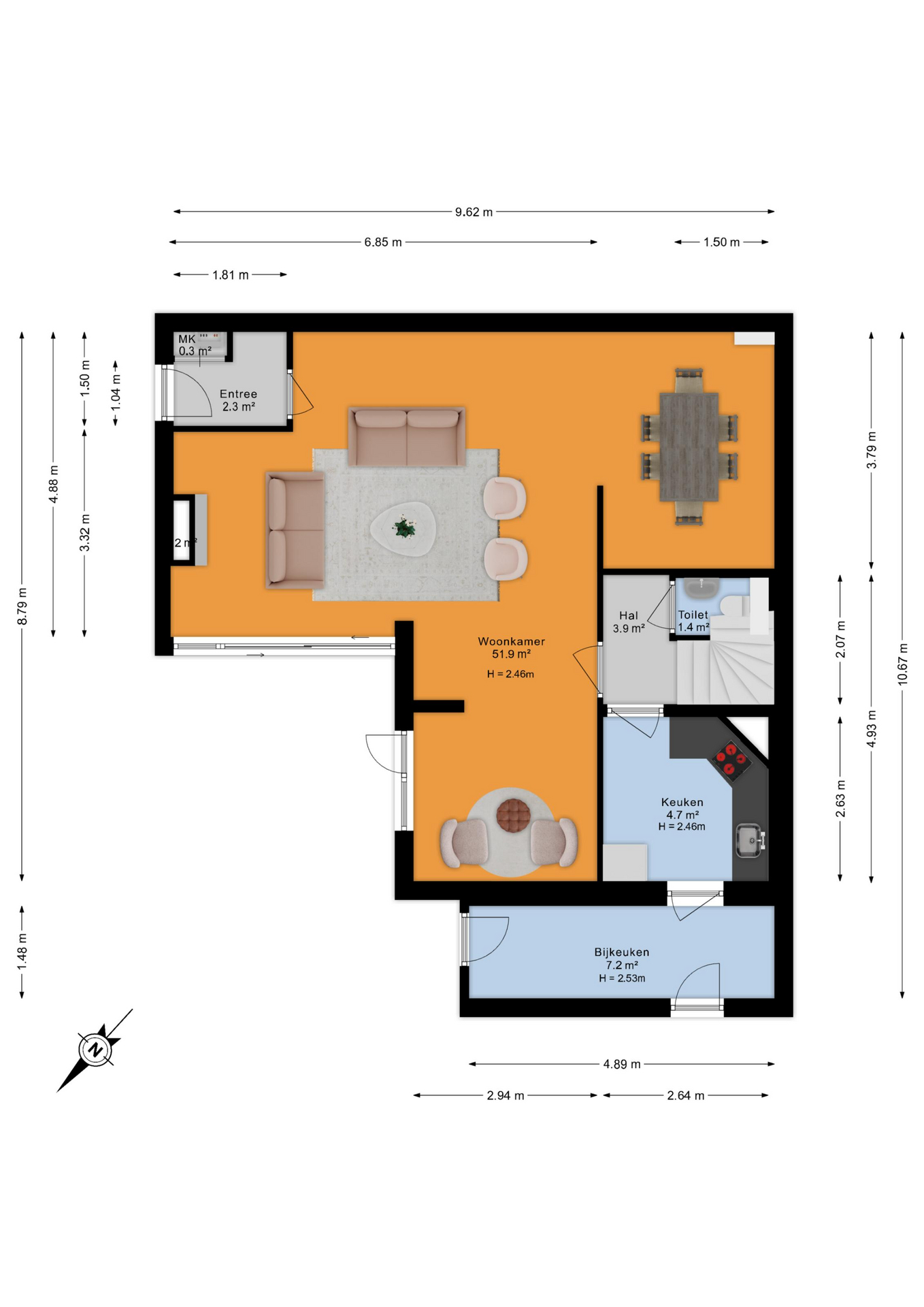 In de hal bevinden zich verder de trapopgang naar de eerste verdieping en een modern toilet met fonteintje.
