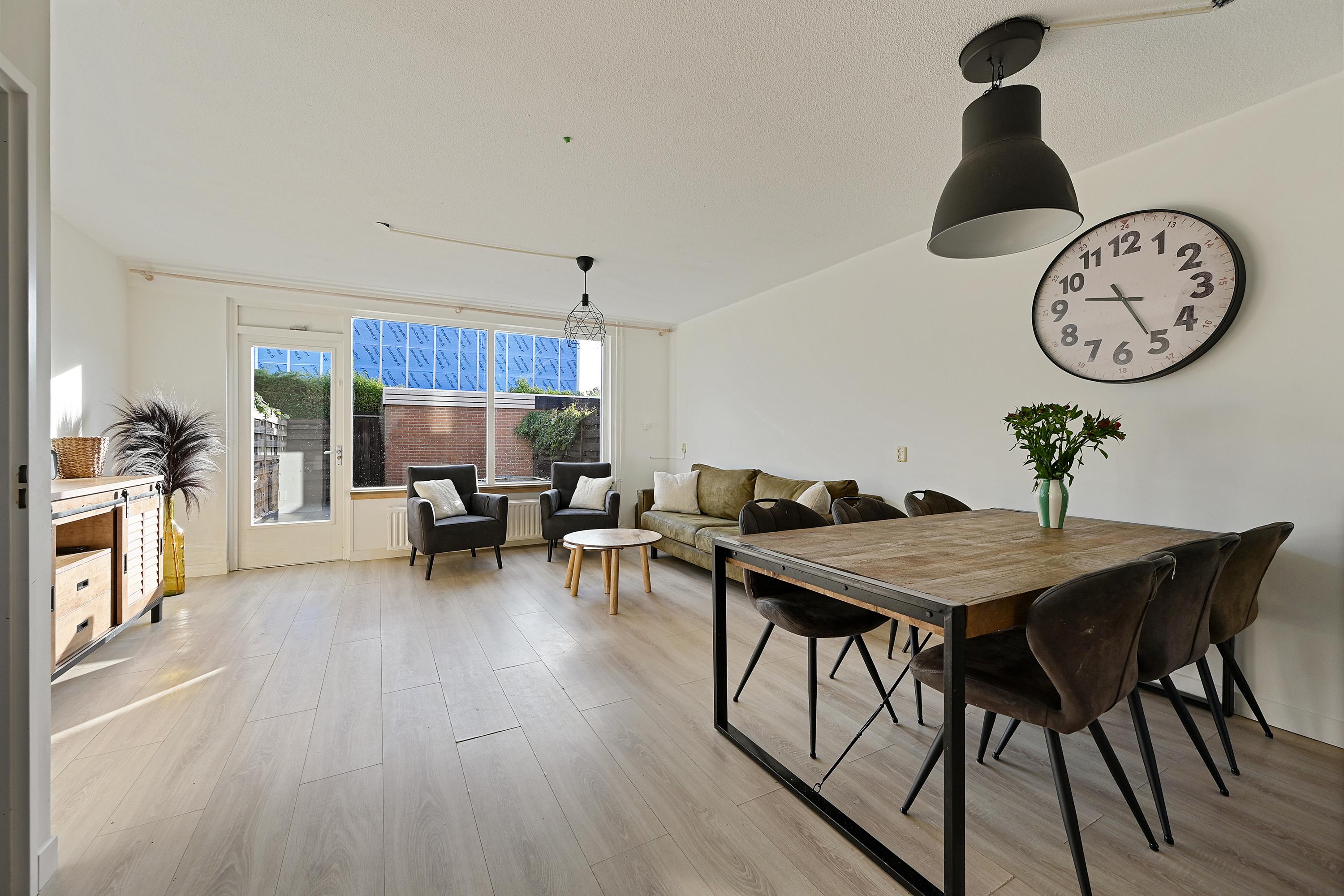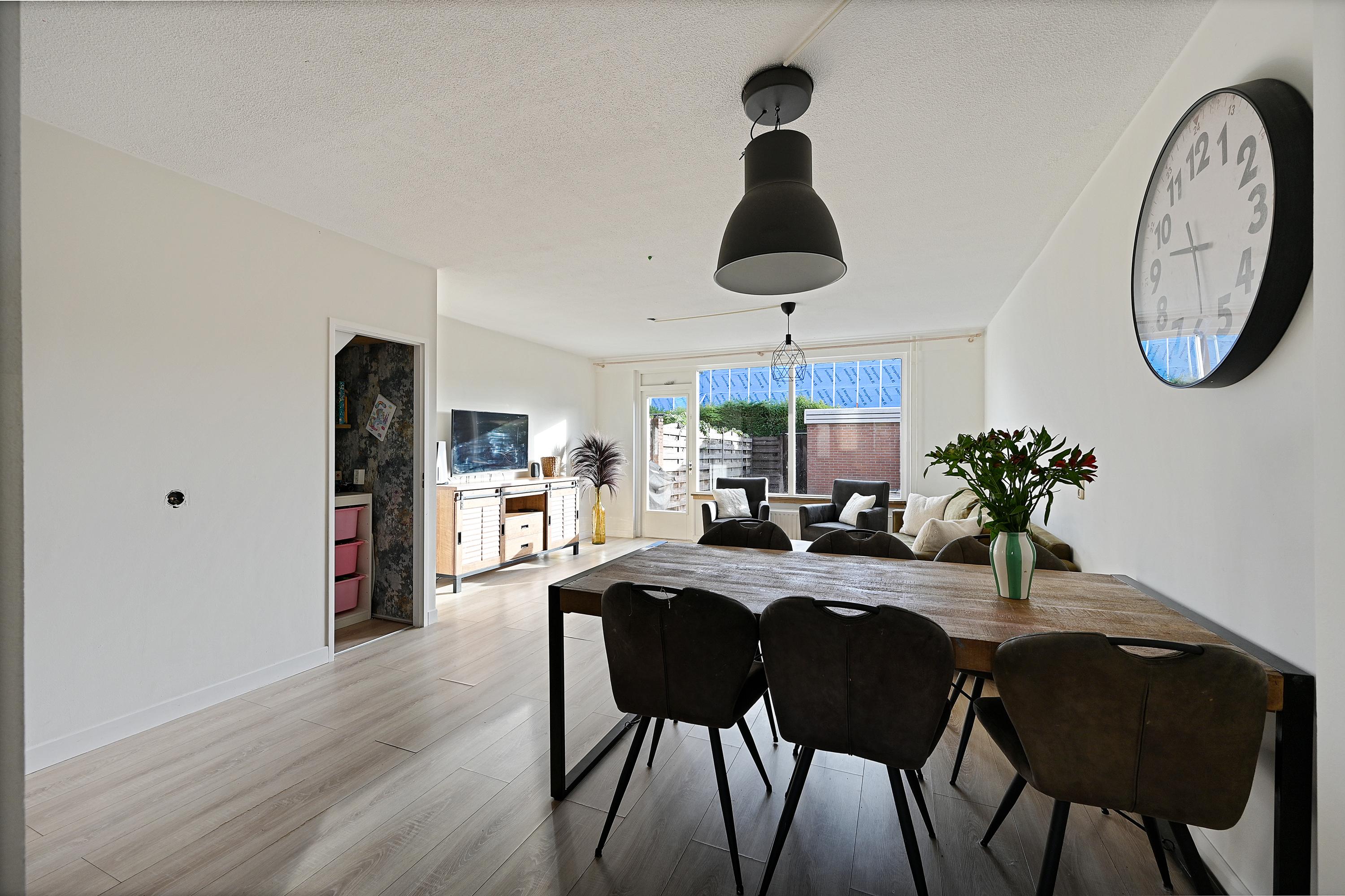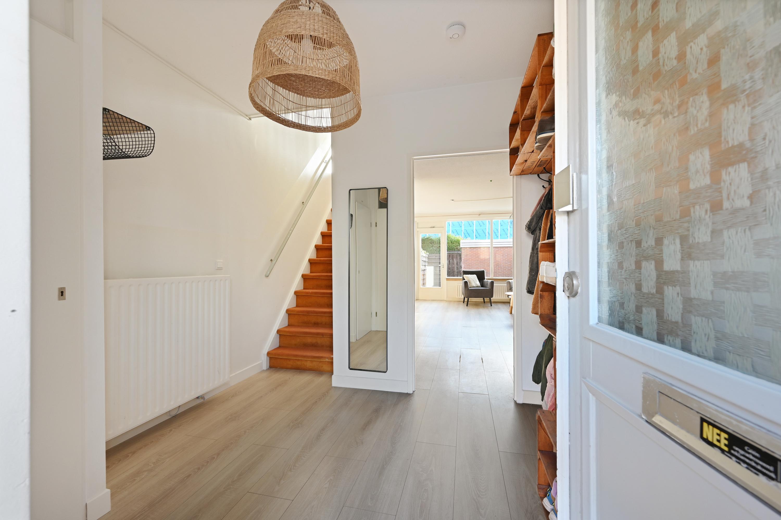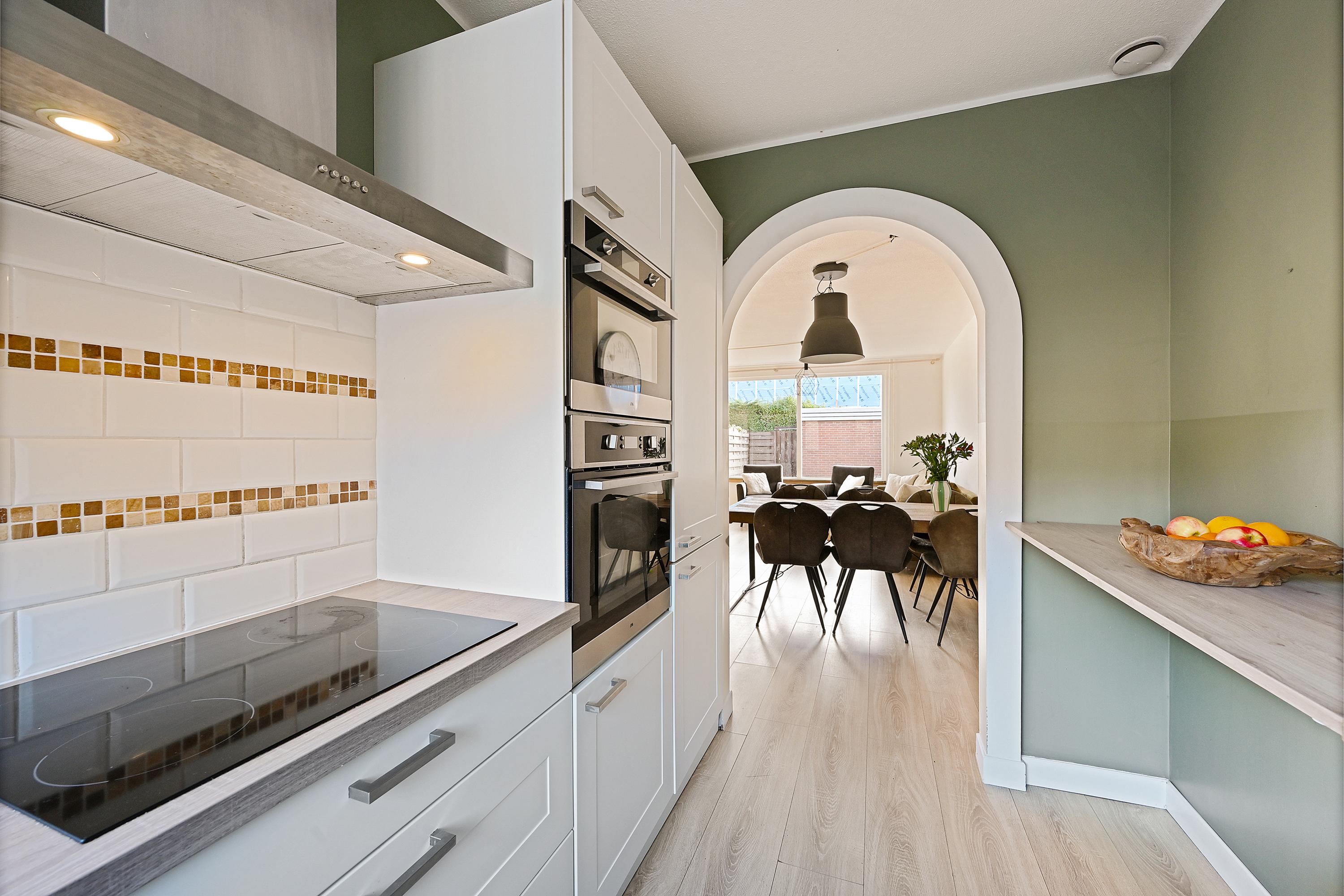 Via de onderhoudsvriendelijke voortuin bereik je de overdekte entree. De hal biedt toegang tot de meterkast, het toilet en de trapopgang. De woonkamer is licht en ruim opgezet, voorzien van een nette laminaatvloer, strak afgewerkte wanden en openslaande deuren naar de achtertuin. Aan de voorzijde bevindt zich de moderne keuken (2018), uitgerust met diverse inbouwapparatuur, waaronder een inductiekookplaat, oven, magnetron, koel-vriescombinatie en vaatwasser.