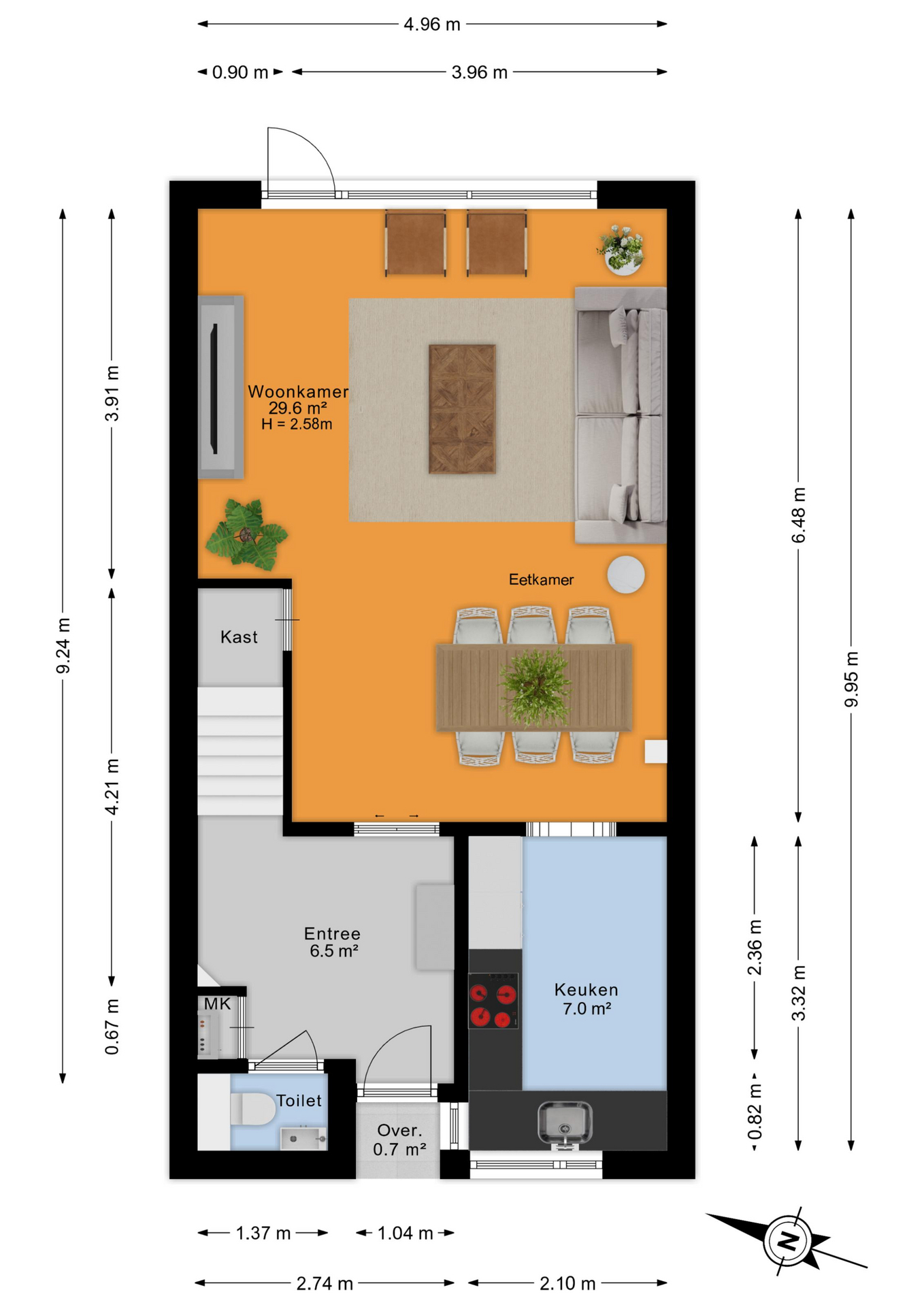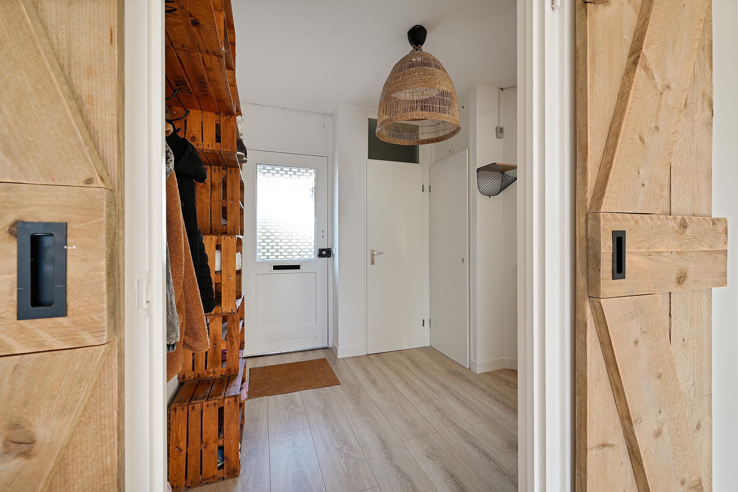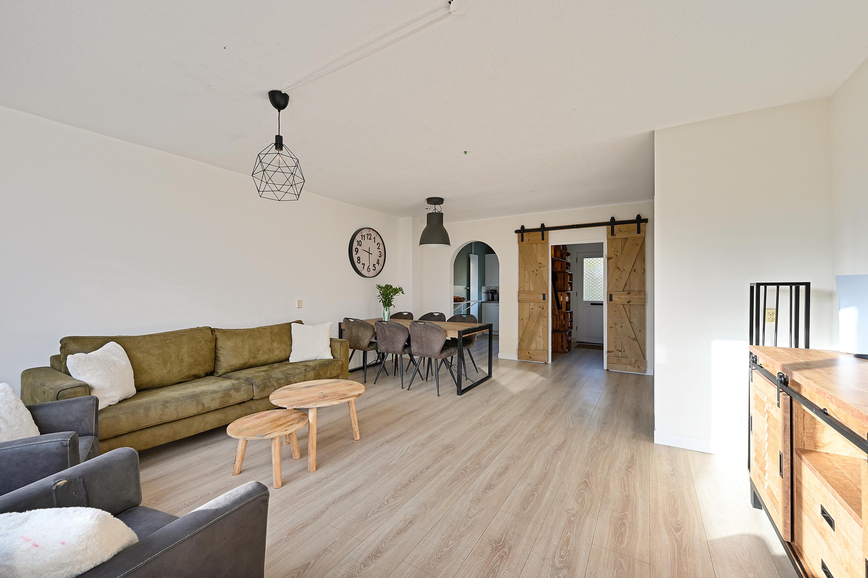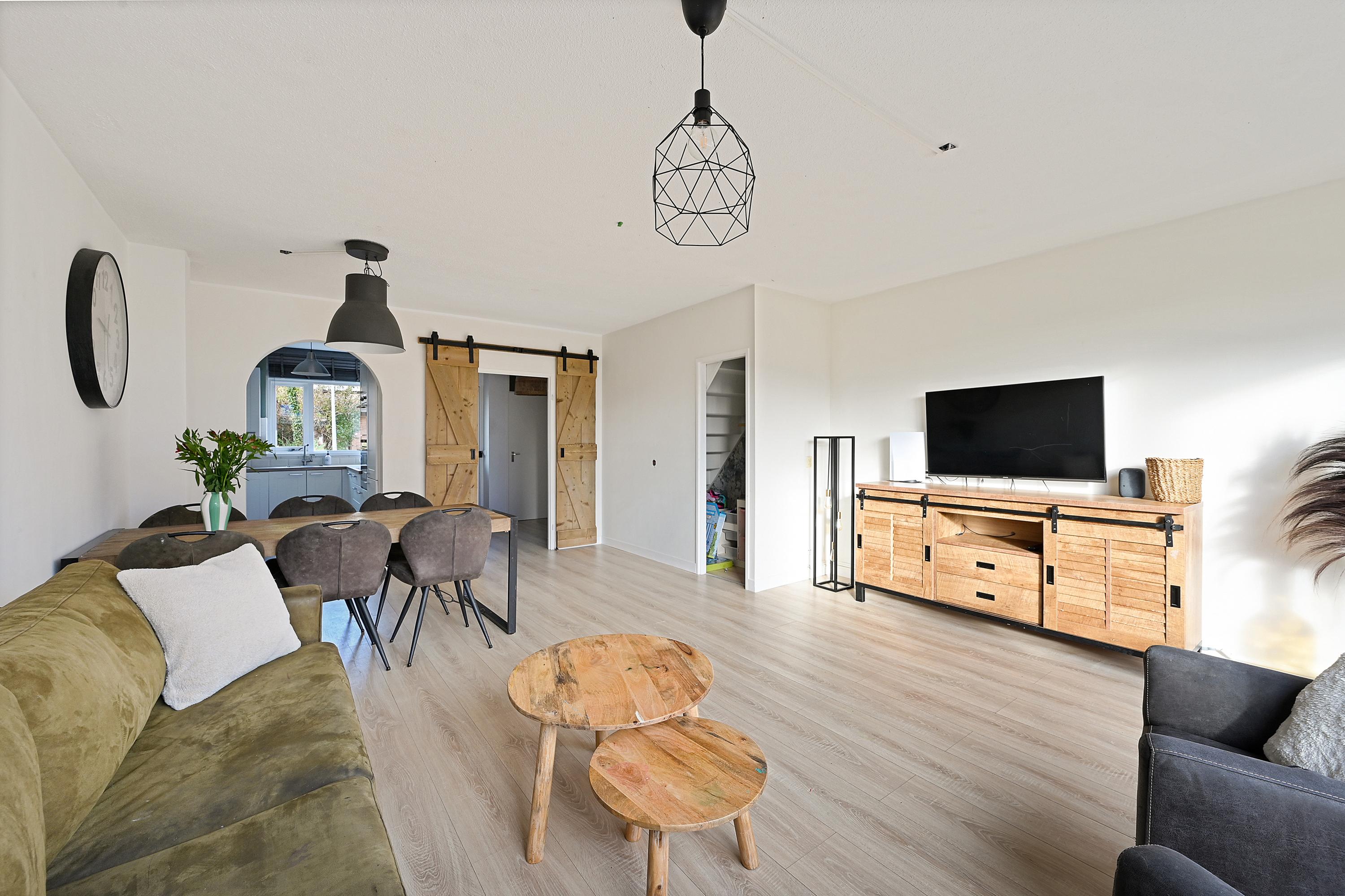 Via de onderhoudsvriendelijke voortuin bereik je de overdekte entree. De hal biedt toegang tot de meterkast, het toilet en de trapopgang. De woonkamer is licht en ruim opgezet, voorzien van een nette laminaatvloer, strak afgewerkte wanden en openslaande deuren naar de achtertuin. Aan de voorzijde bevindt zich de moderne keuken (2018), uitgerust met diverse inbouwapparatuur, waaronder een inductiekookplaat, oven, magnetron, koel-vriescombinatie en vaatwasser.