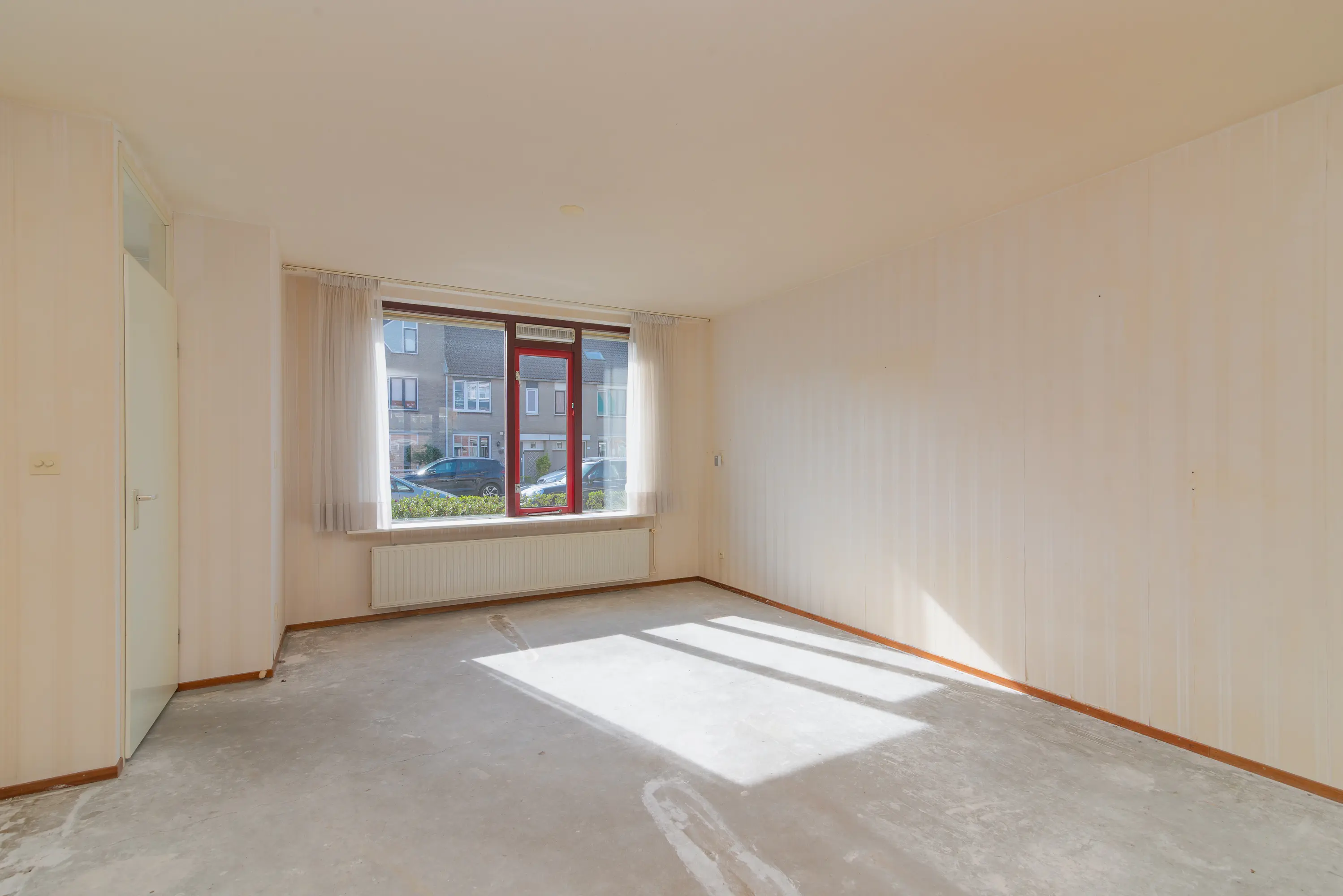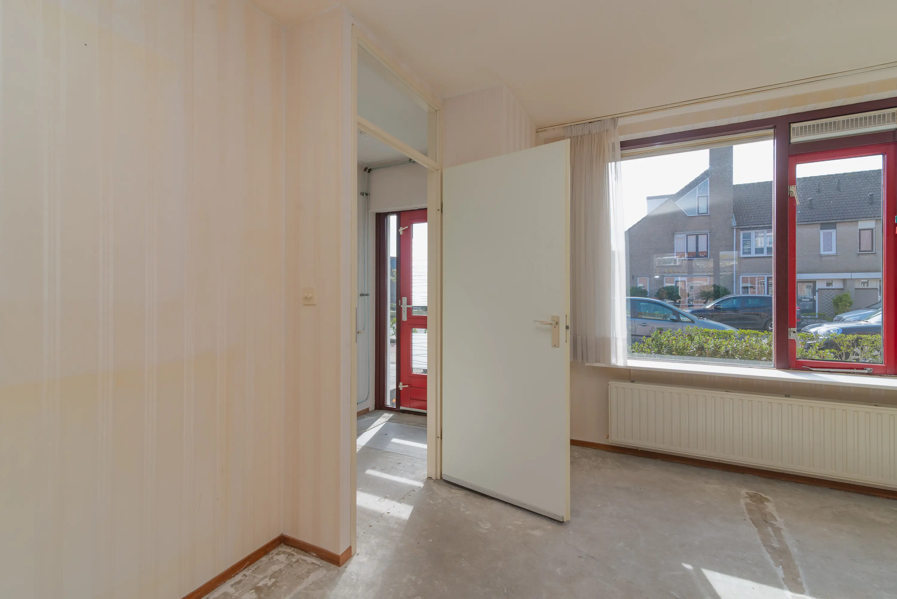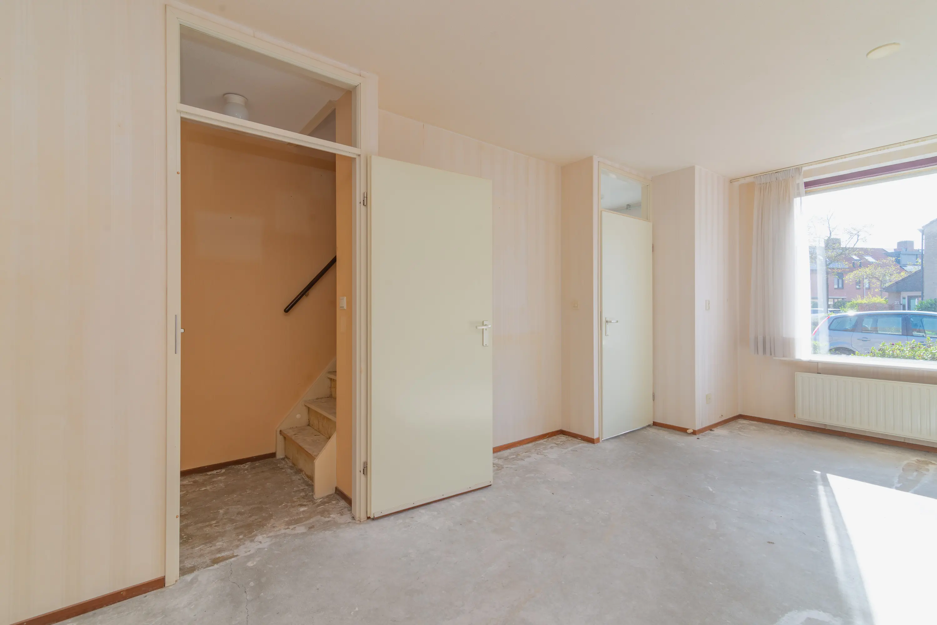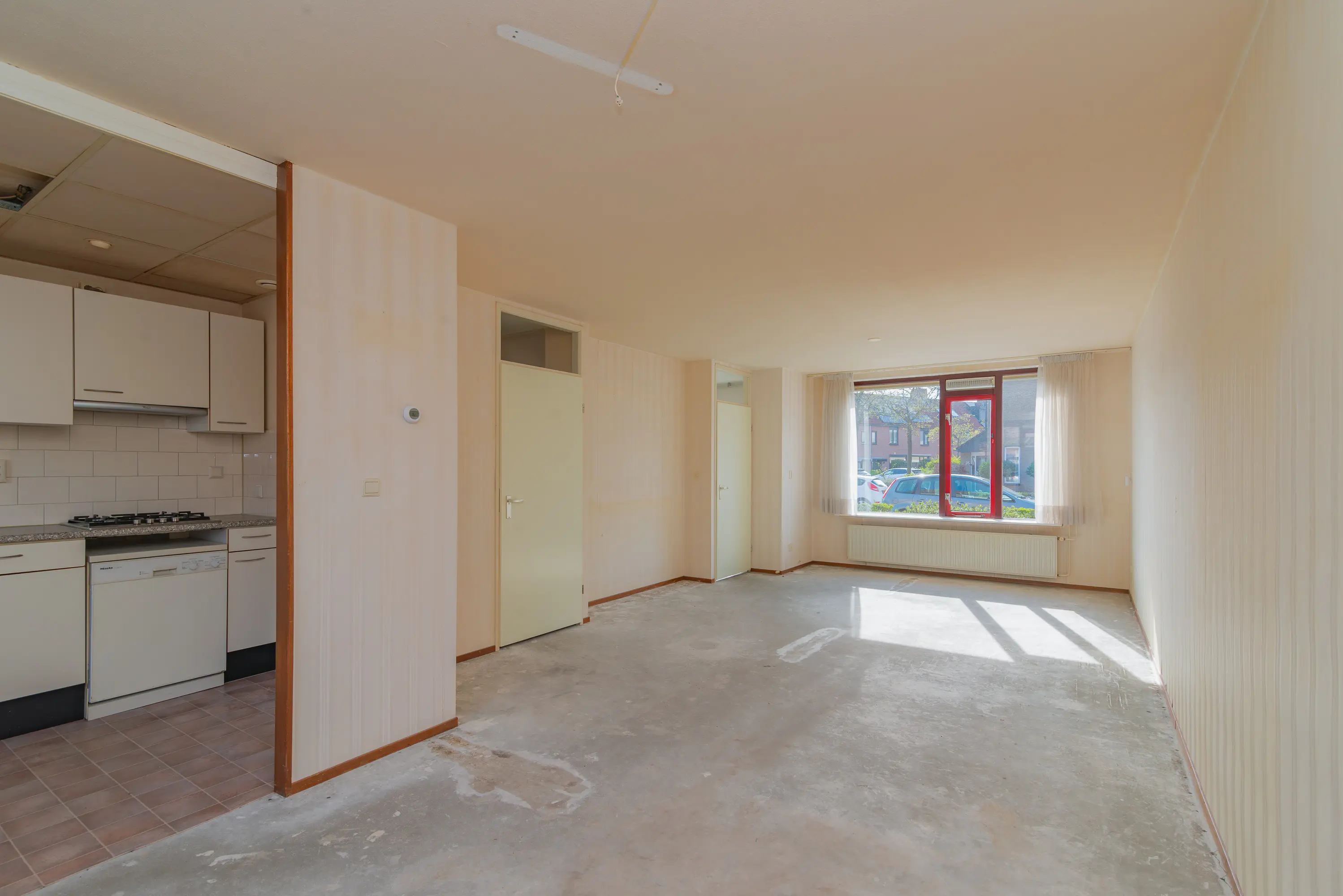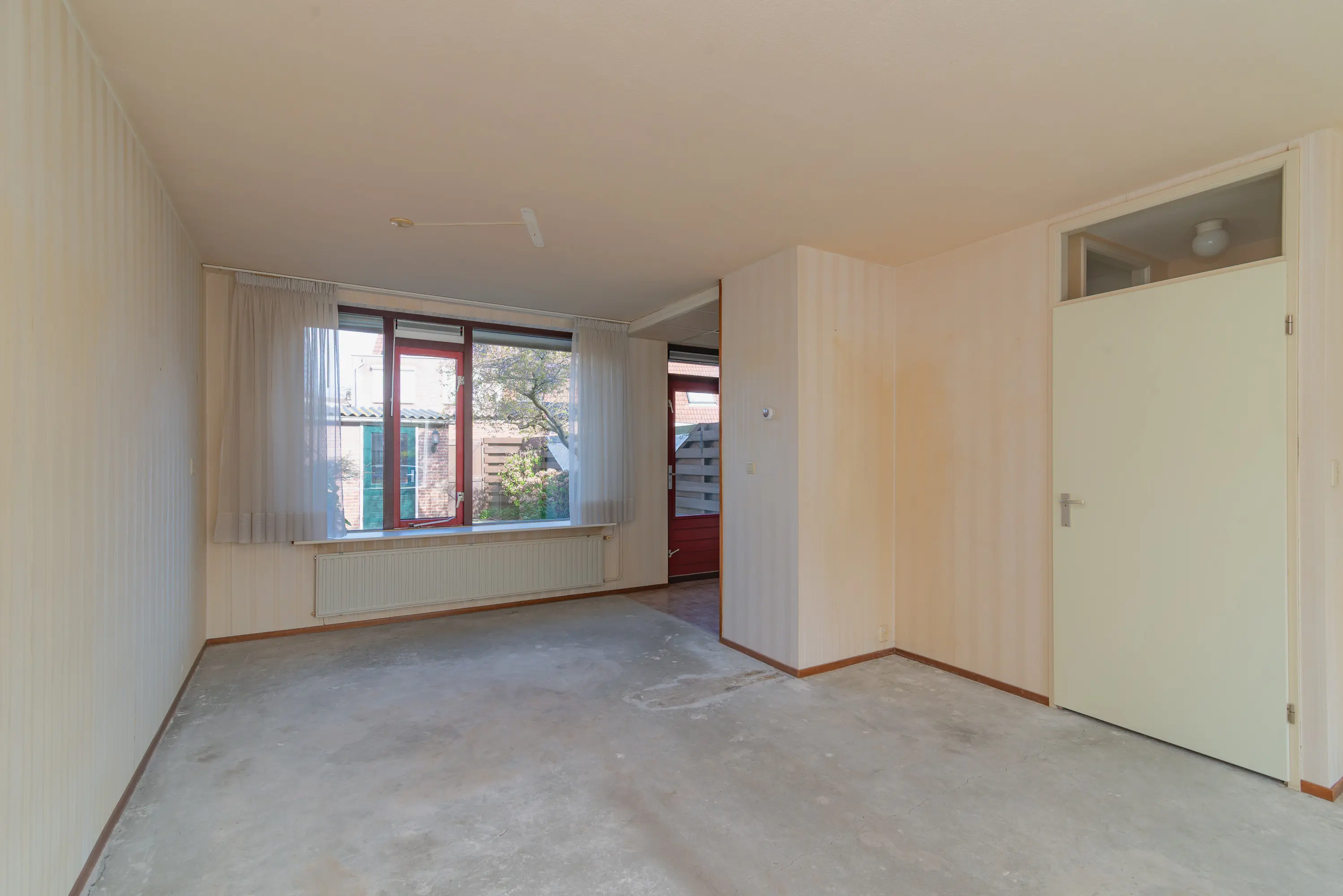 Entree via de voortuin. Binnenkomst in de hal met meterkast en toilet. Vanuit de hal bereik je de lichte doorzonwoonkamer met grote raampartijen aan zowel de voor- als achterzijde, wat zorgt voor veel natuurlijk licht en een prettige indeling.