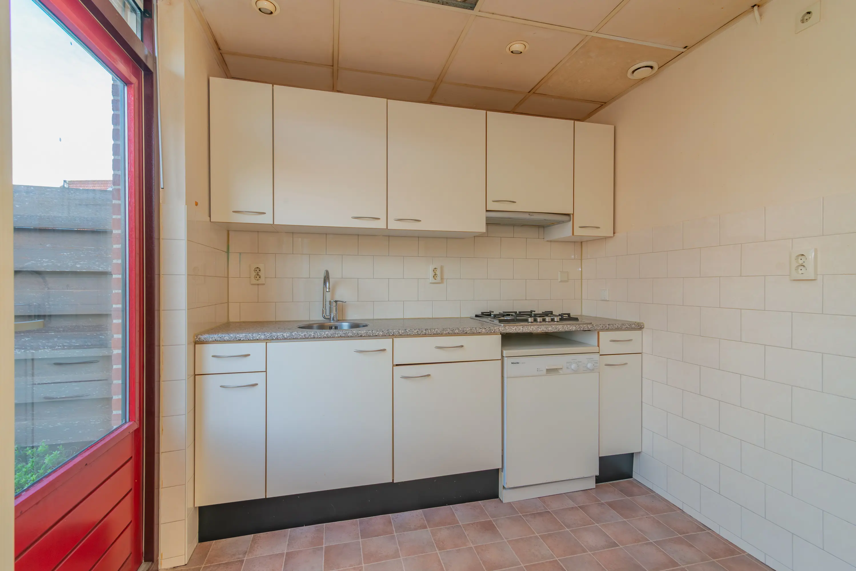 De halfopen keuken is eenvoudig uitgevoerd en voorzien van diverse onder- en bovenkasten, een spoelbak en inbouwapparatuur. De keuken biedt een goede basis en kan naar eigen wens worden vernieuwd. Vanuit de keuken is er directe toegang tot de tuin.