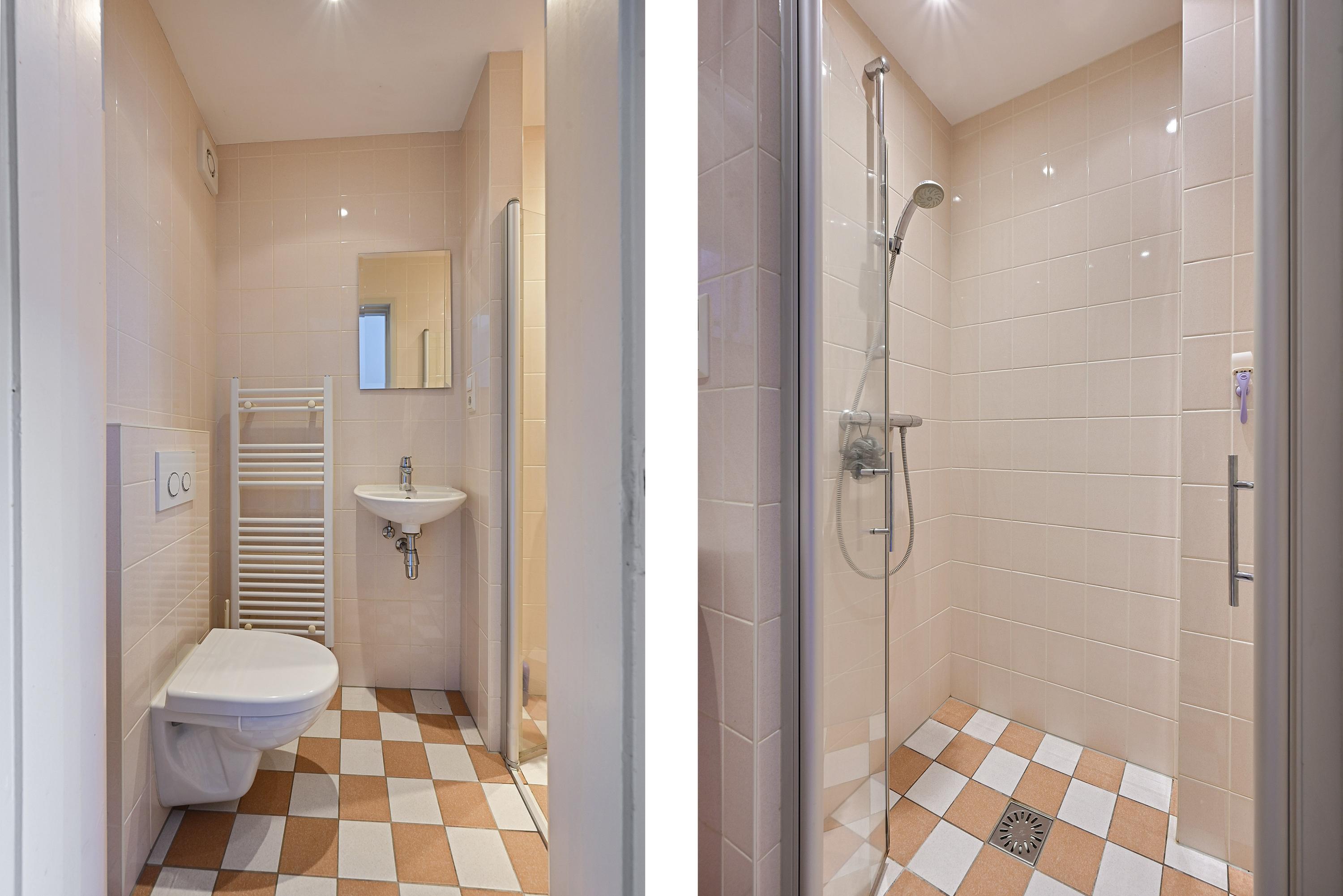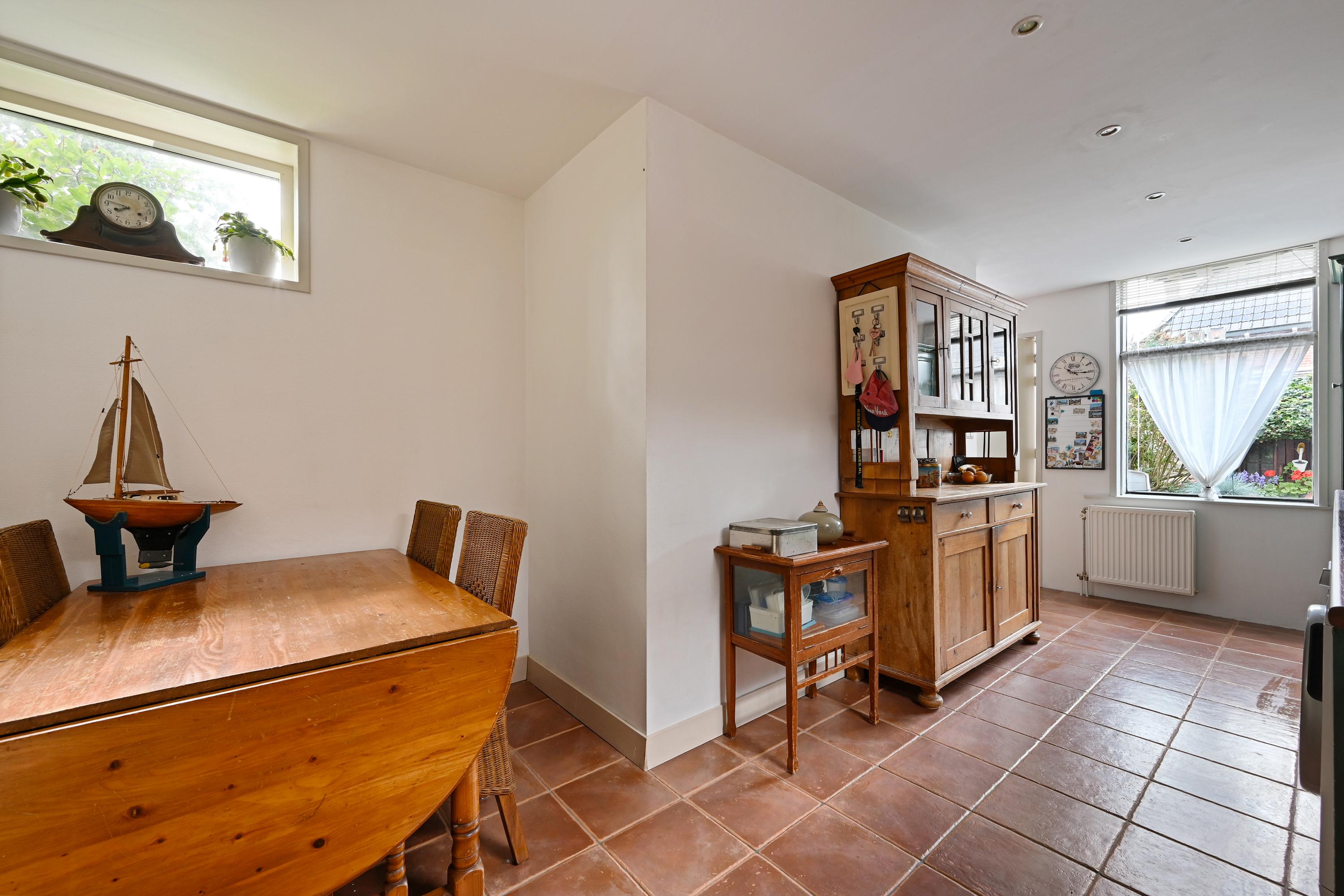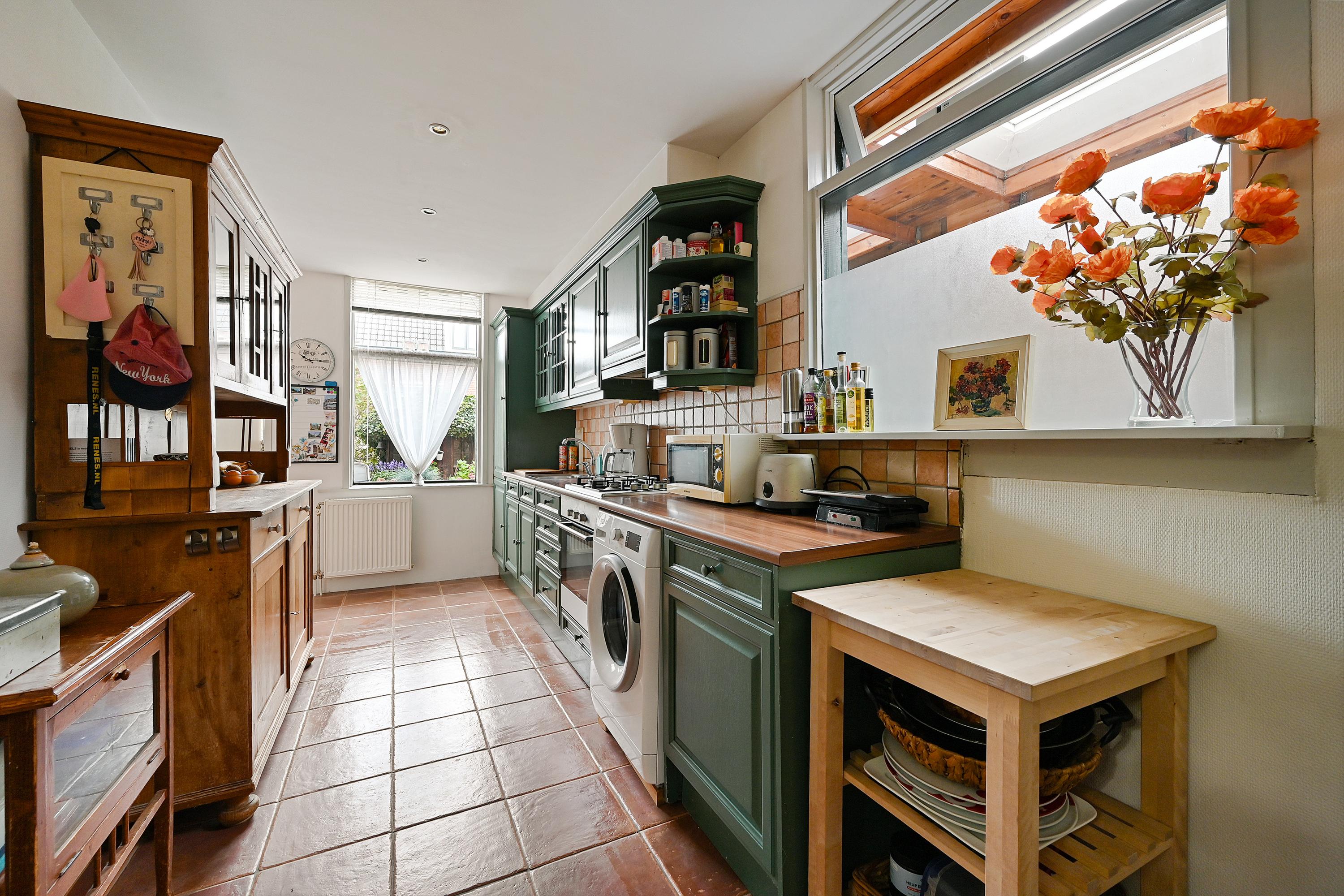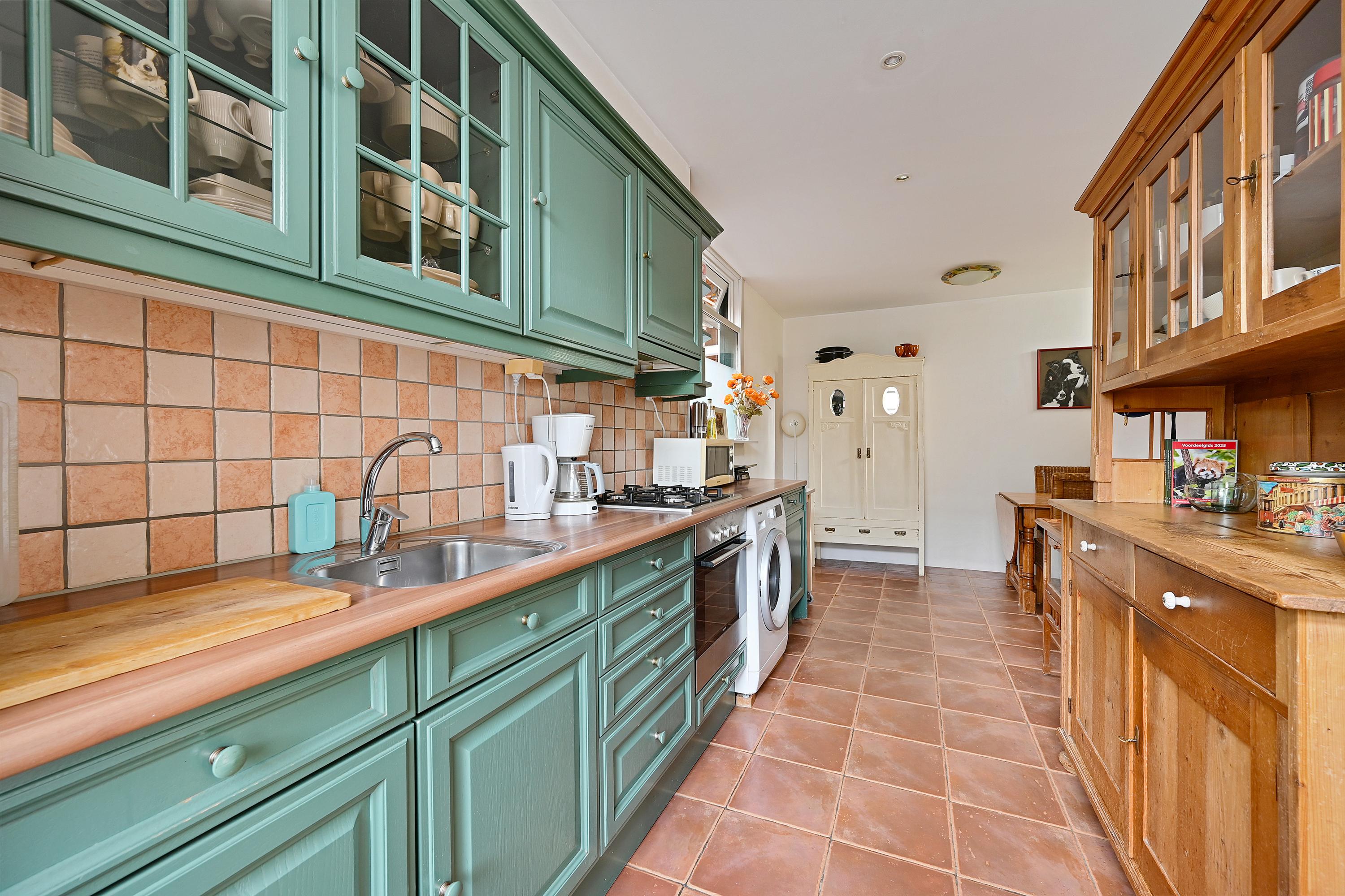 De woonkeuken bevindt zich aan de achterzijde en heeft een gezellige landelijke uitstraling. De rechte opstelling biedt veel kastruimte en is voorzien van o.a. een gaskookplaat, fornuis, afzuigkap, oven, koel-vriescombinatie en vaatwasser. De tegelvloer maakt het geheel sfeervol en praktisch. Op de begane grond bevindt zich tevens een badkamer met toilet en doucheruimte.