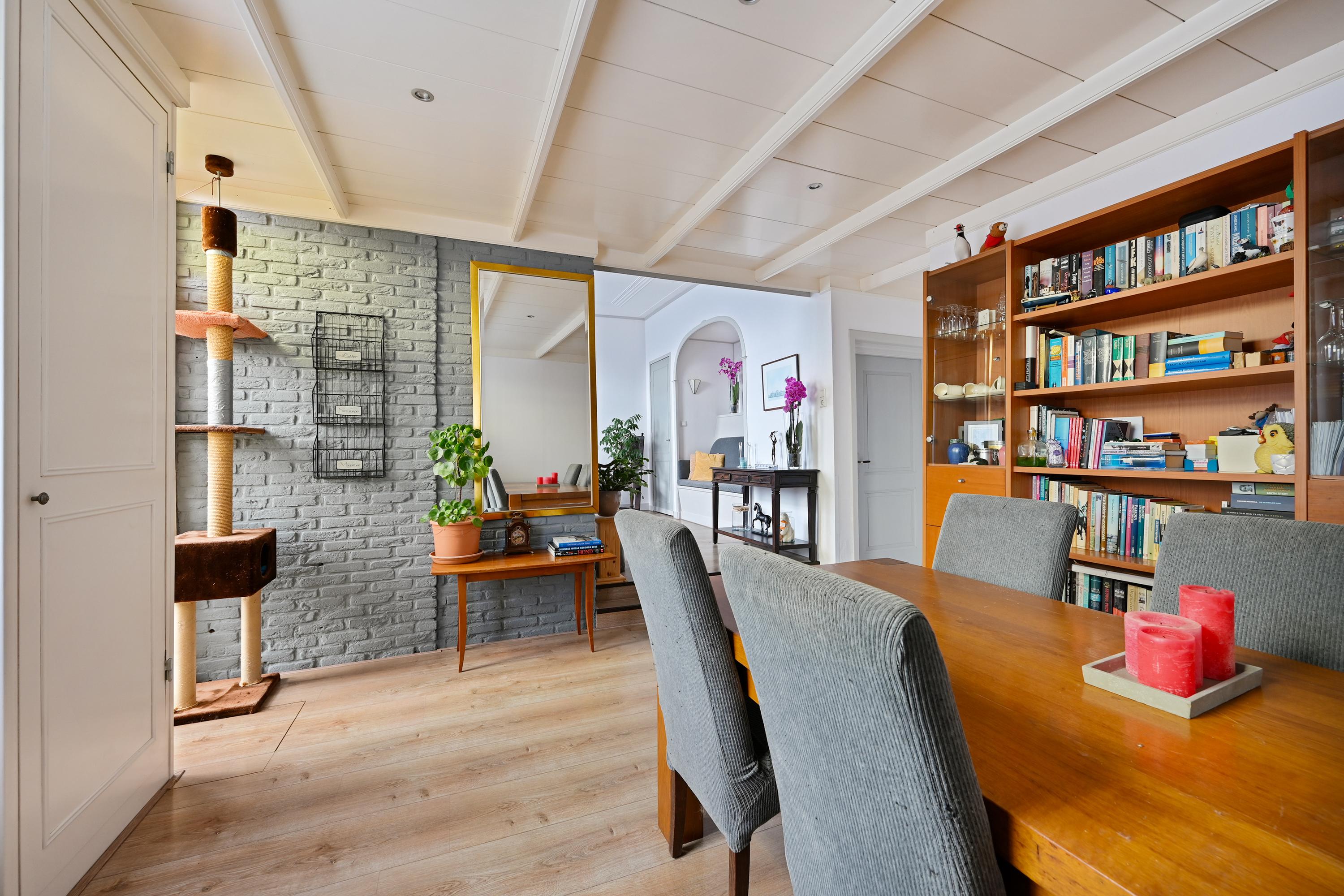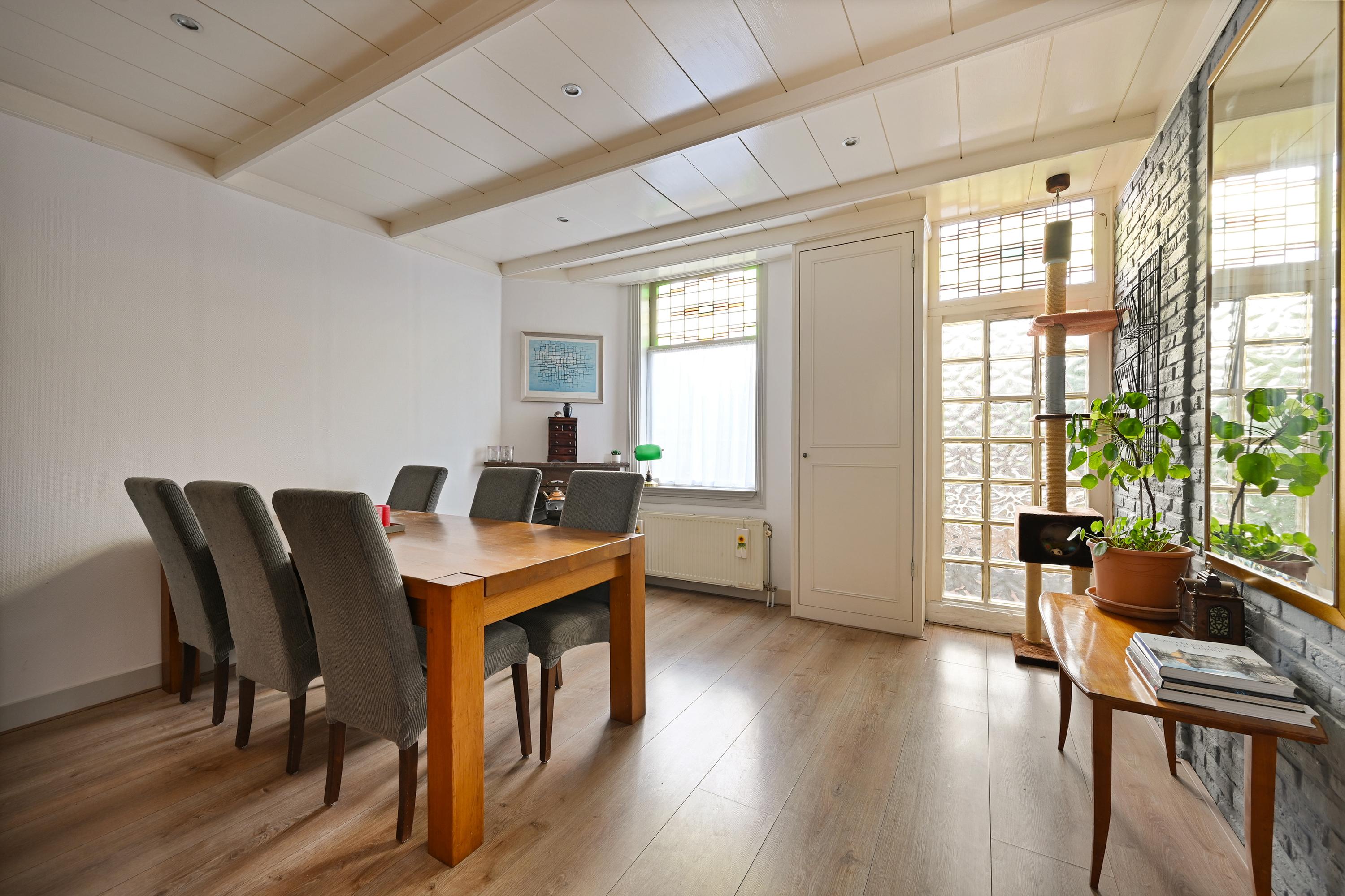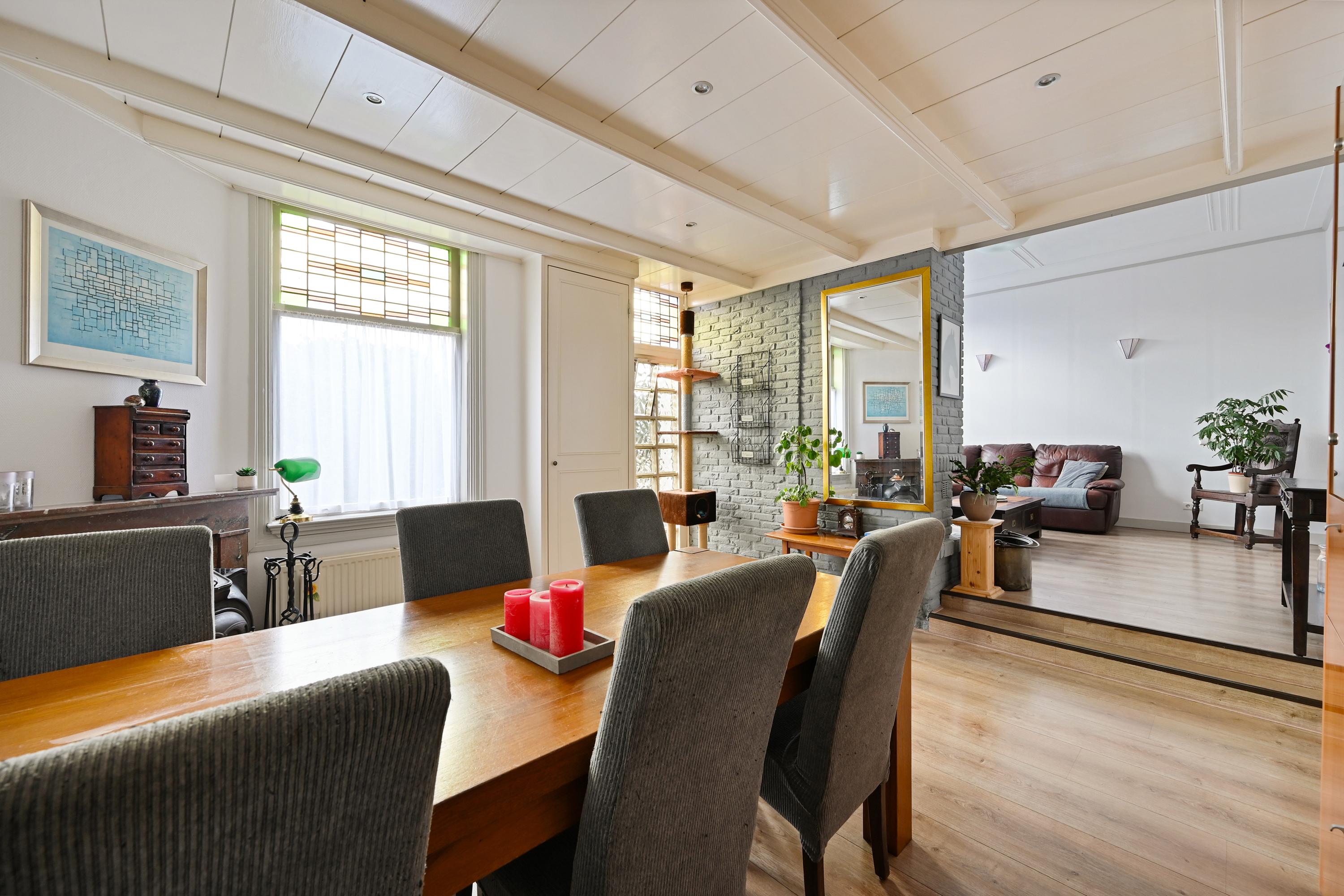 Voortuin en parkeermogelijkheid voor de deur (op gemeentegrond), toegangshek, entree woning aan de achterzijde. De woning beschikt over een sfeervolle indeling met een aparte eetkamer- en woongedeelte. In de eetkamer valt direct de authentieke schouw op, die veel karakter toevoegt aan de ruimte. Ook zijn er 2 handige bergkasten aanwezig, zowel in de eetkamer als in de woonkamer. De woonkamer is bereikbaar via een klein trappetje en biedt een knusse zithoek met centraal geplaatste open haard. Een leuk detail is de vaste bank die in de muur is geïntegreerd, wat de ruimte een unieke uitstraling geeft.