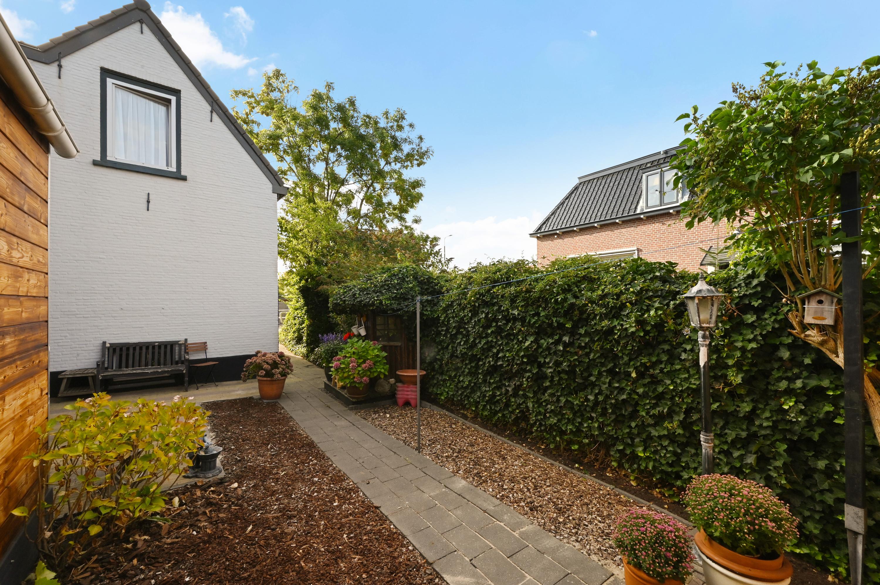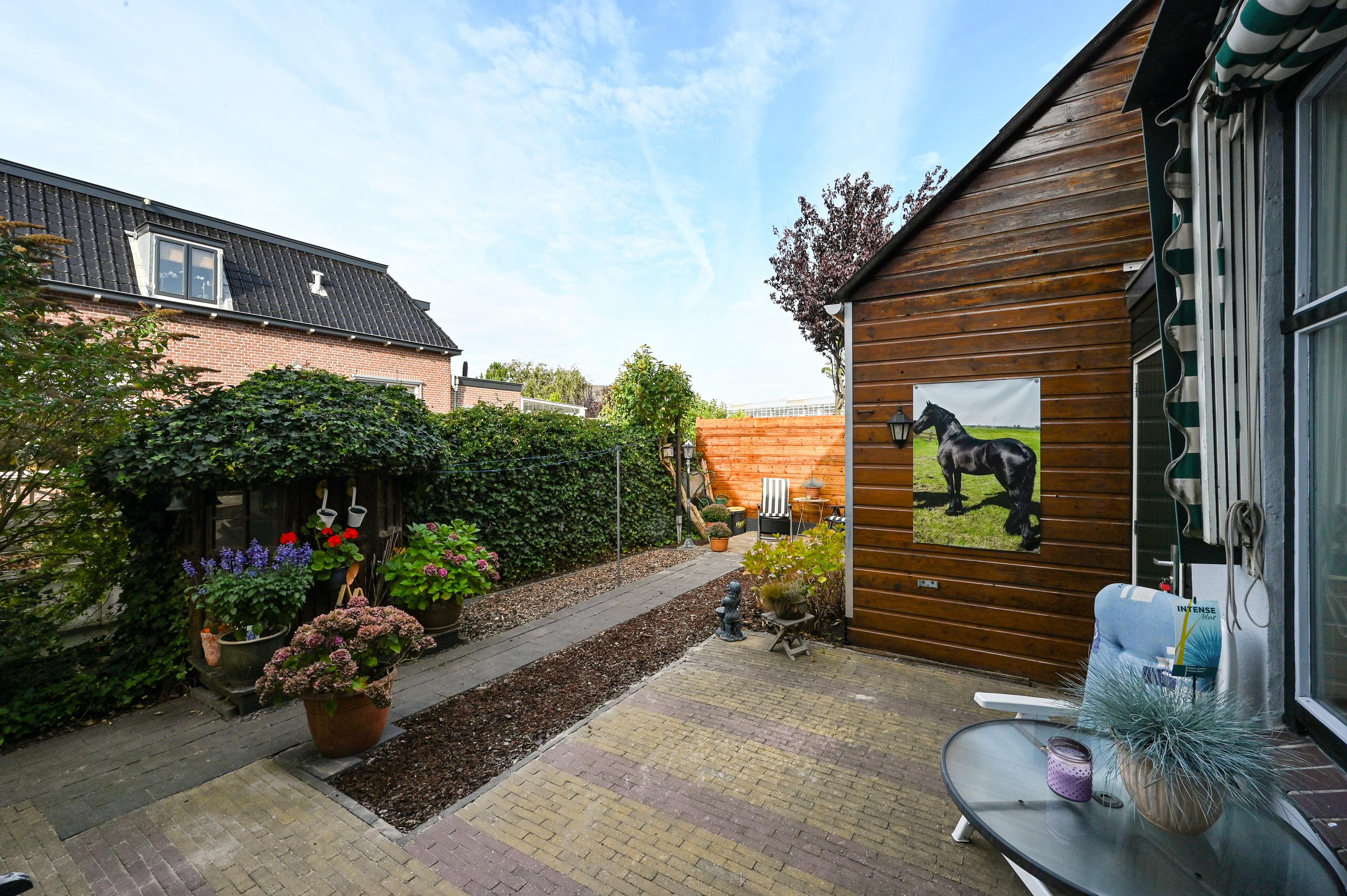De tuin is voorzien van beplanting, bestrating, buitenverlichting en een tuinhuis/berging.