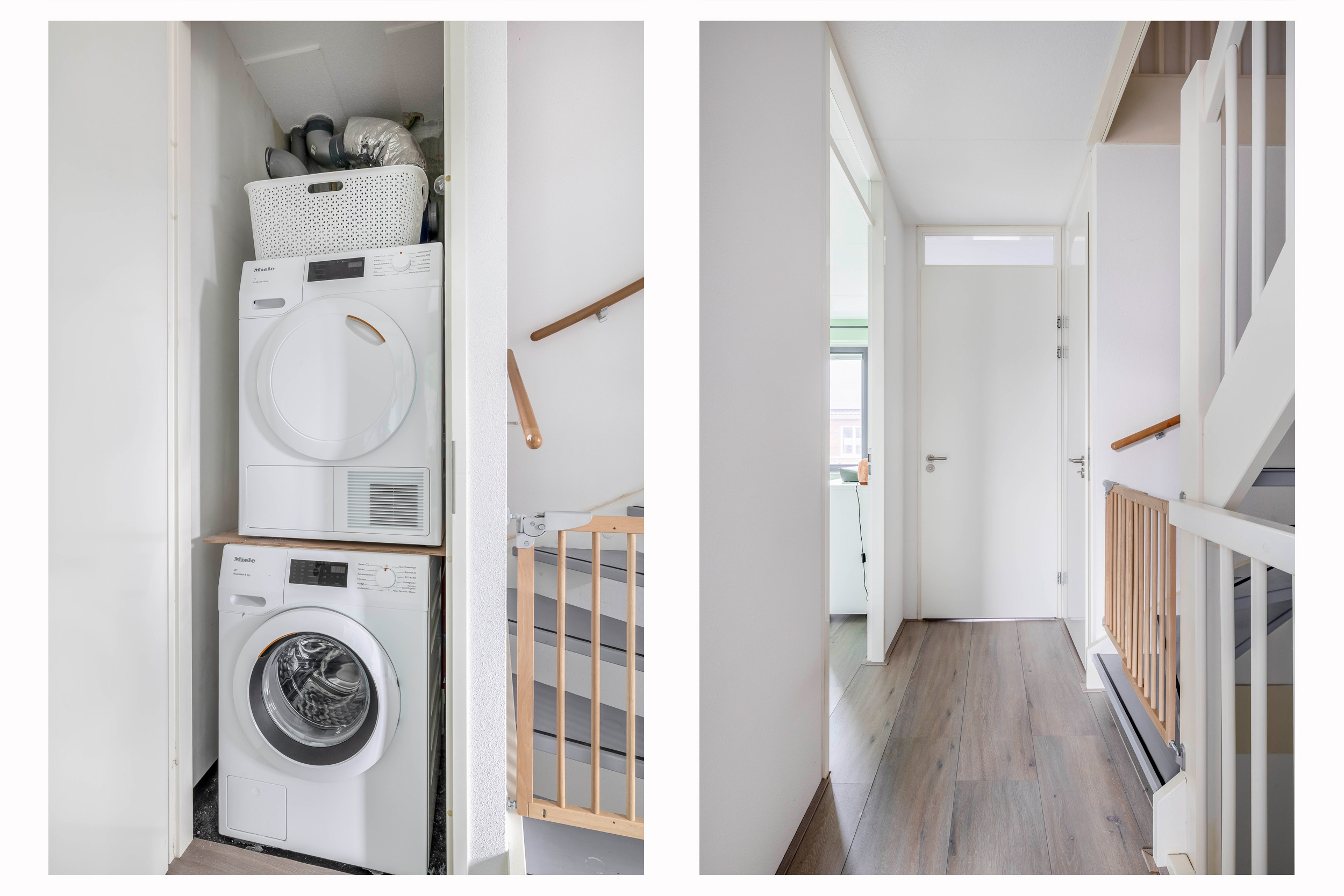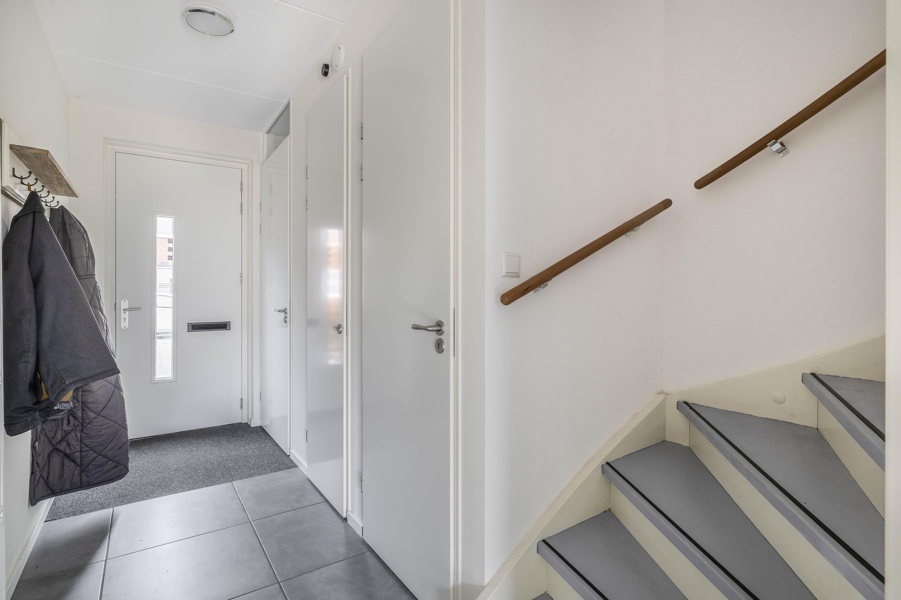 Via de voortuin bereik je de entree, waar een lichte hal toegang biedt tot het moderne toilet met fontein, de meterkast en de woonkamer. Direct bij binnenkomst valt op hoe strak en verzorgd deze verdieping is afgewerkt. De begane grond is volledig voorzien van grote, neutrale vloertegels met vloerverwarming, wat zorgt voor een warme uitstraling en optimaal wooncomfort.