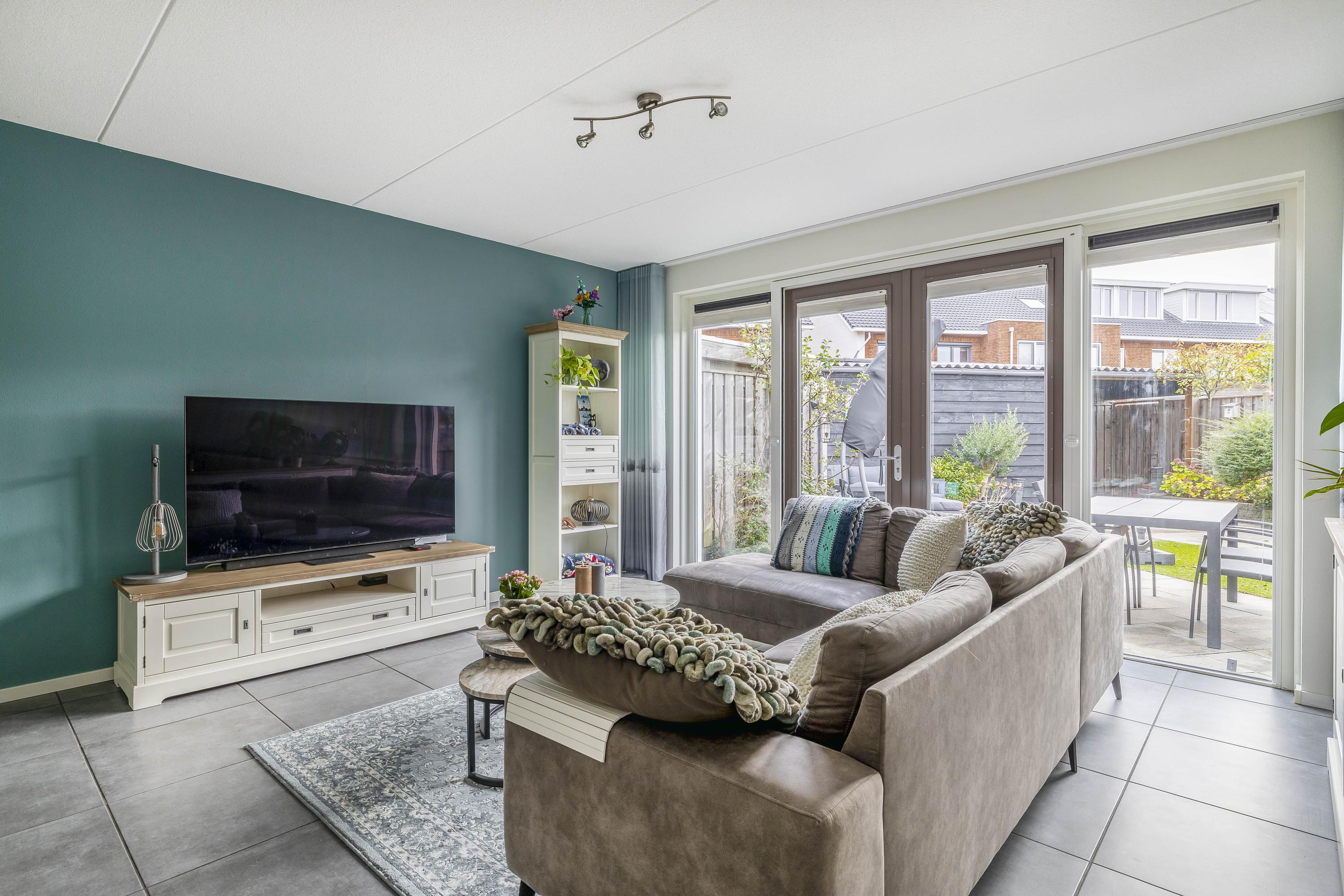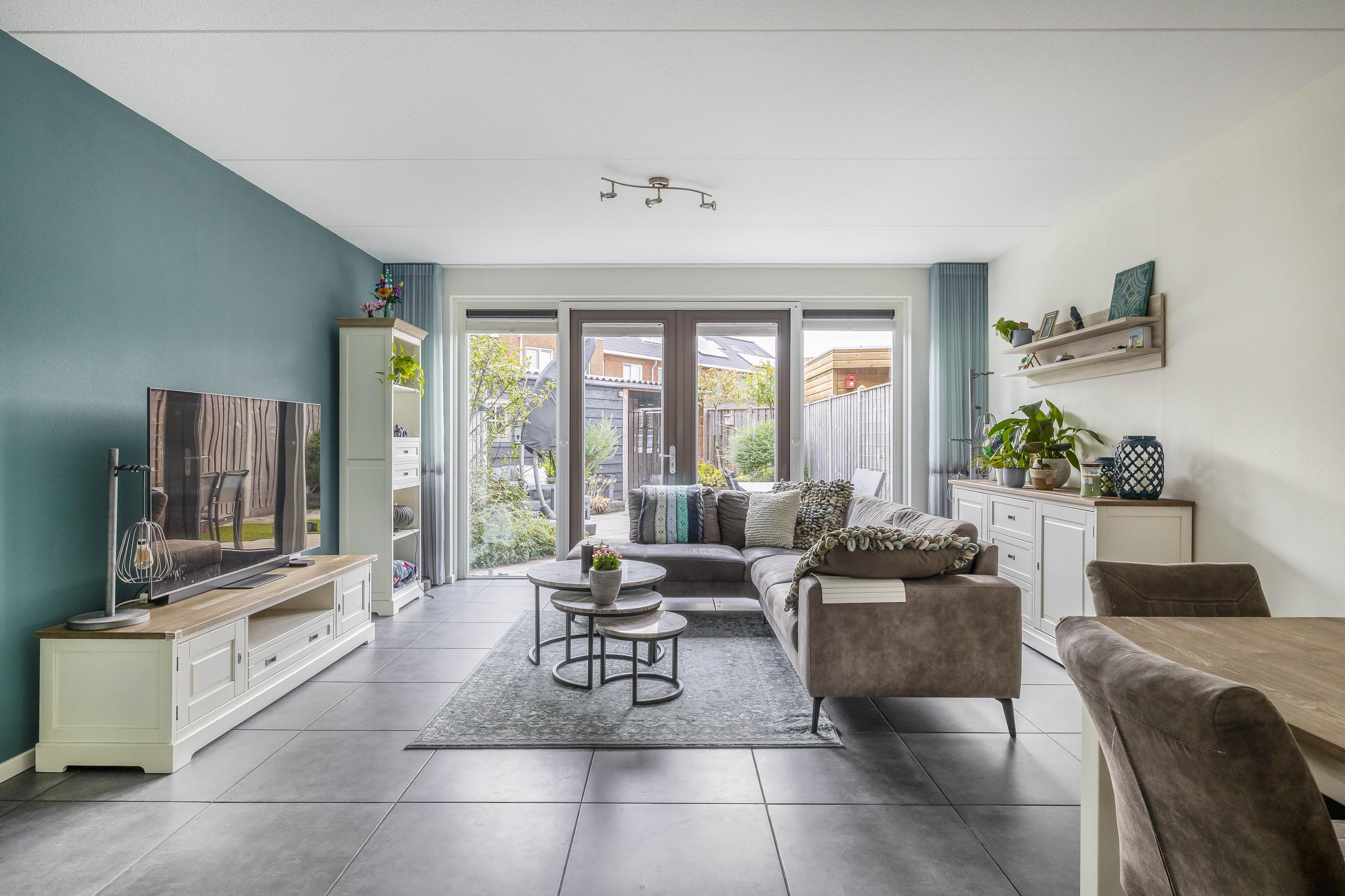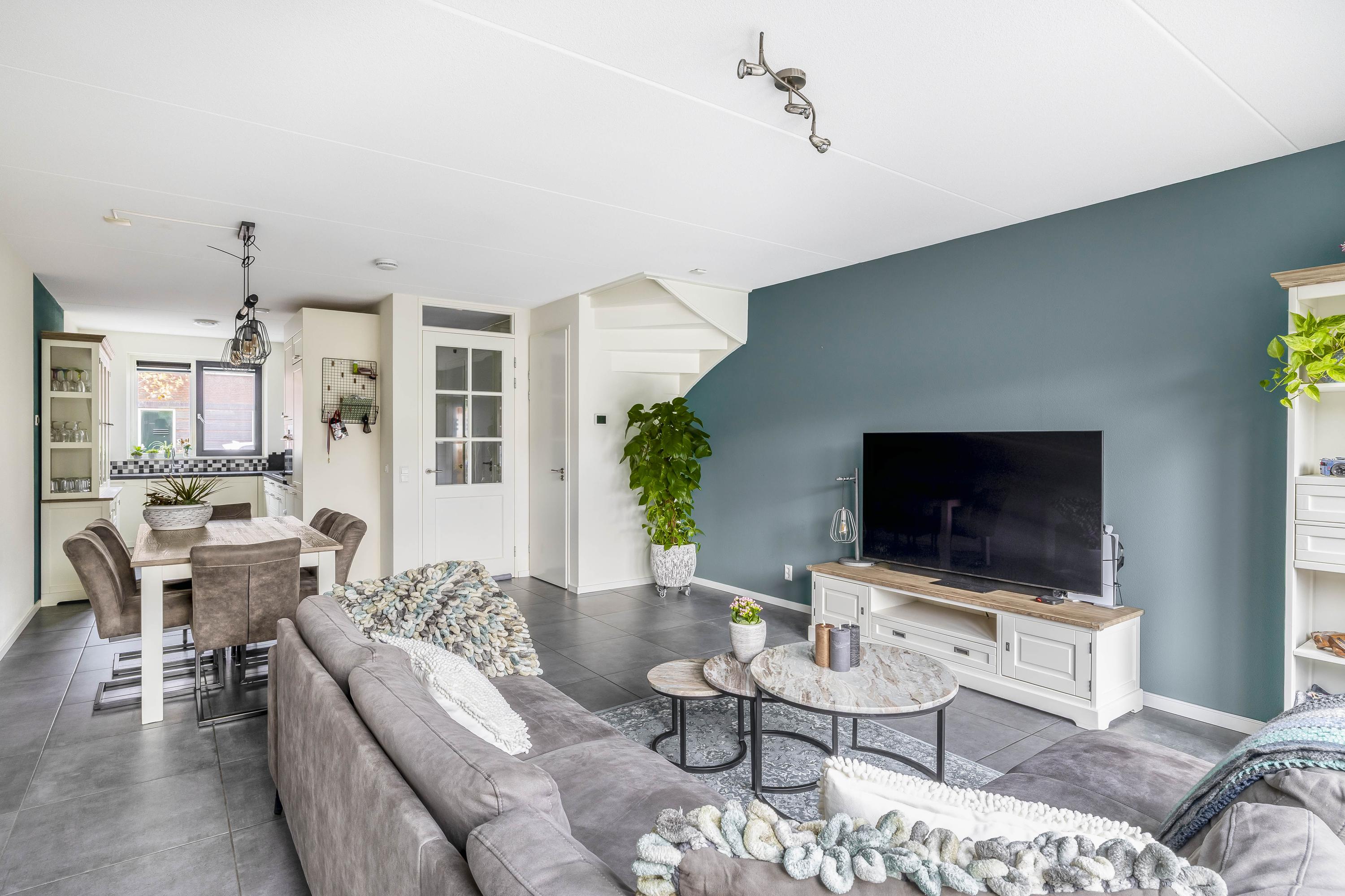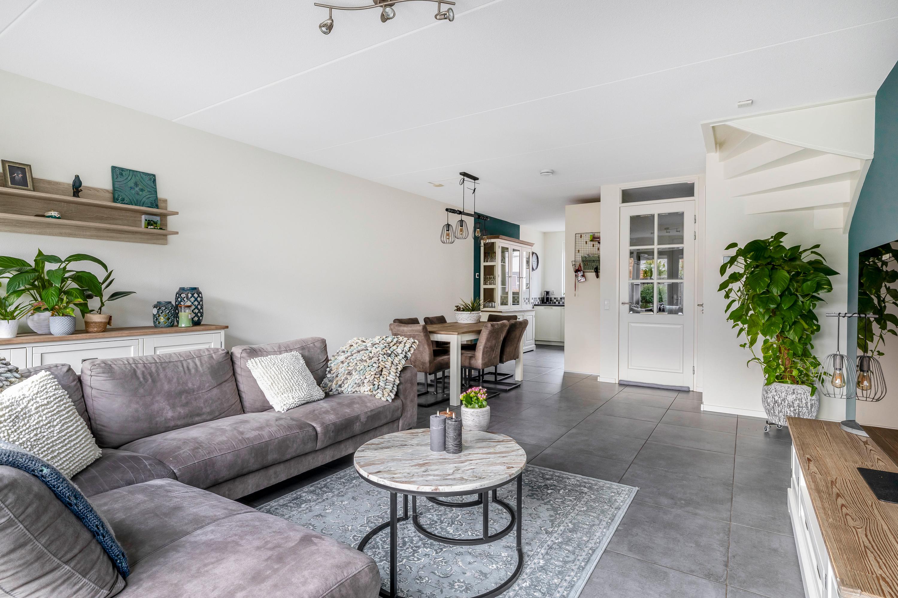 De woonkamer is een prettige, brede ruimte die dankzij de grote glazen pui met openslaande deuren rijkelijk wordt verlicht. De achterpui is voorzien van plissé gordijnen en hordeuren. Een moderne accentmuur en een ruime opzet zorgen voor een sfeervolle, uitnodigende leefruimte die eenvoudig in te richten is met een grote zit- en eethoek. Onder de trap bevindt zich een praktische trapkast voor extra bergruimte.