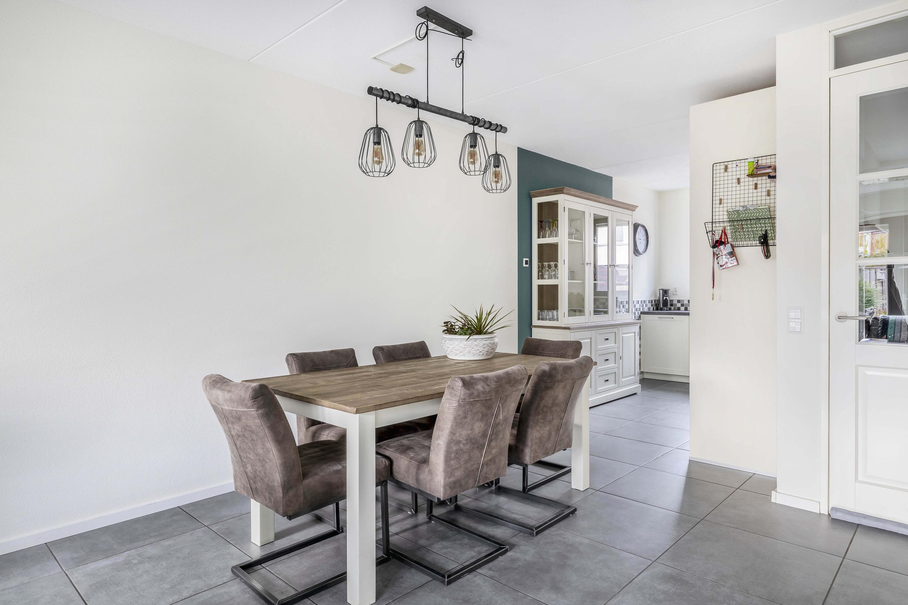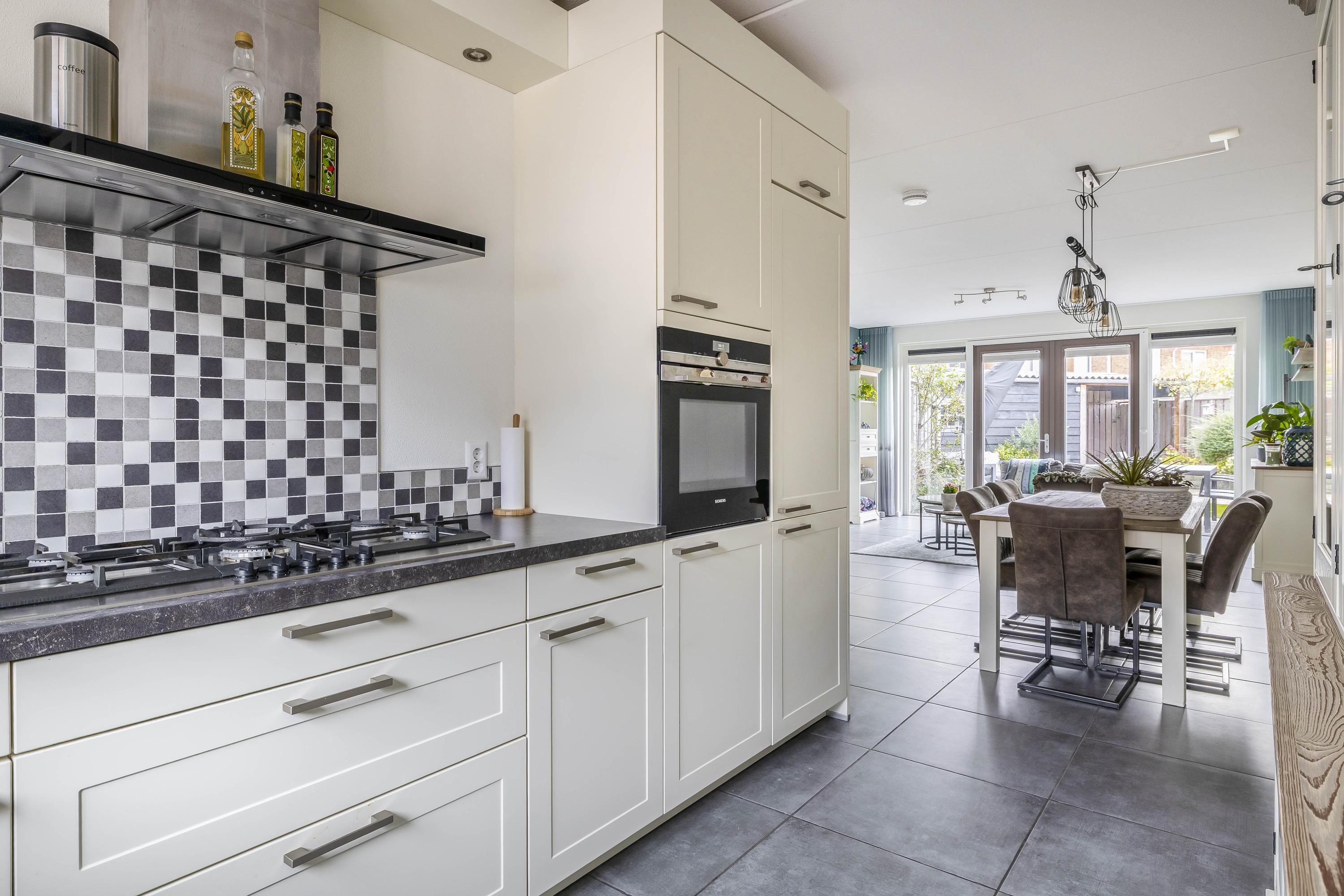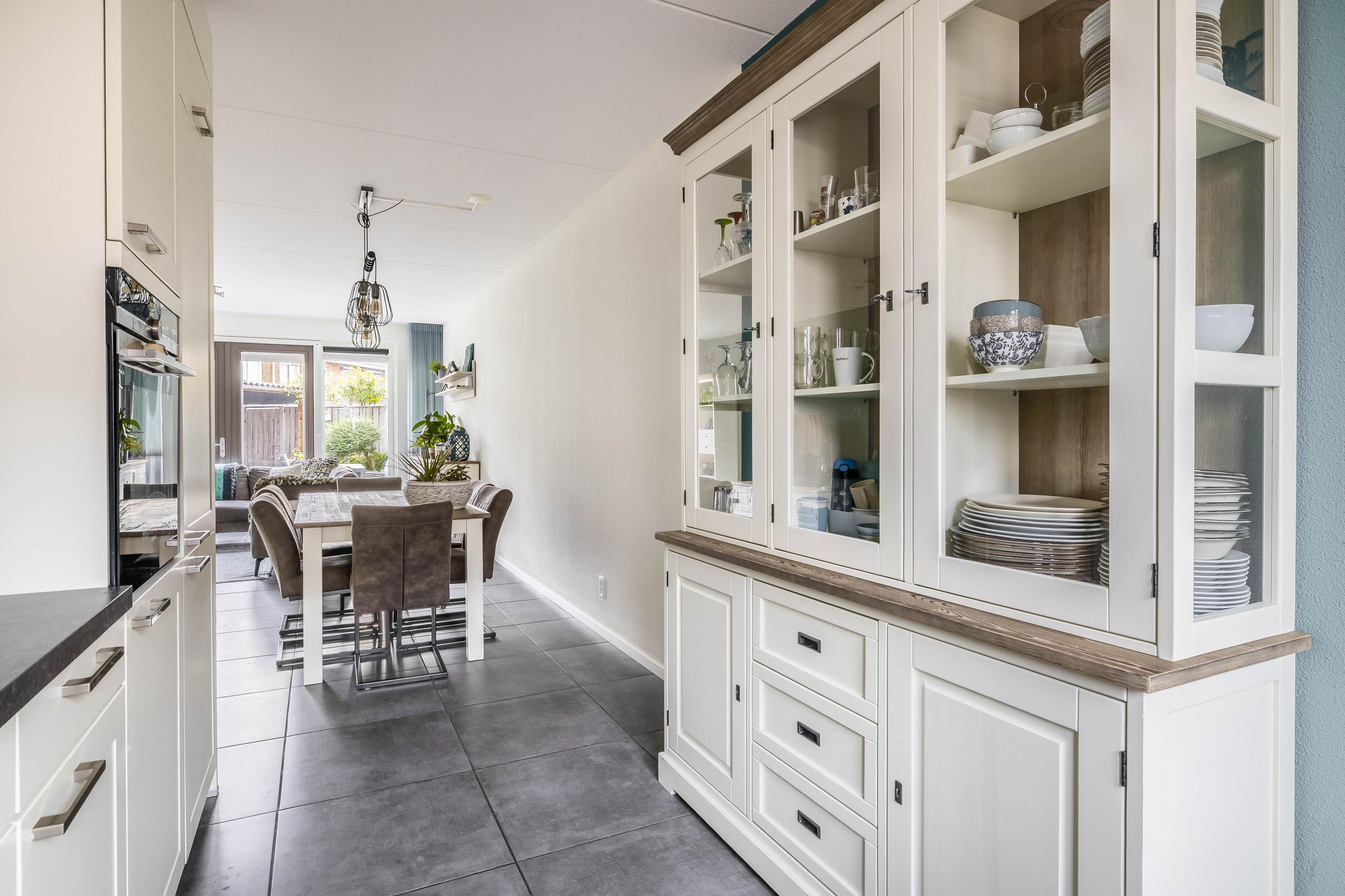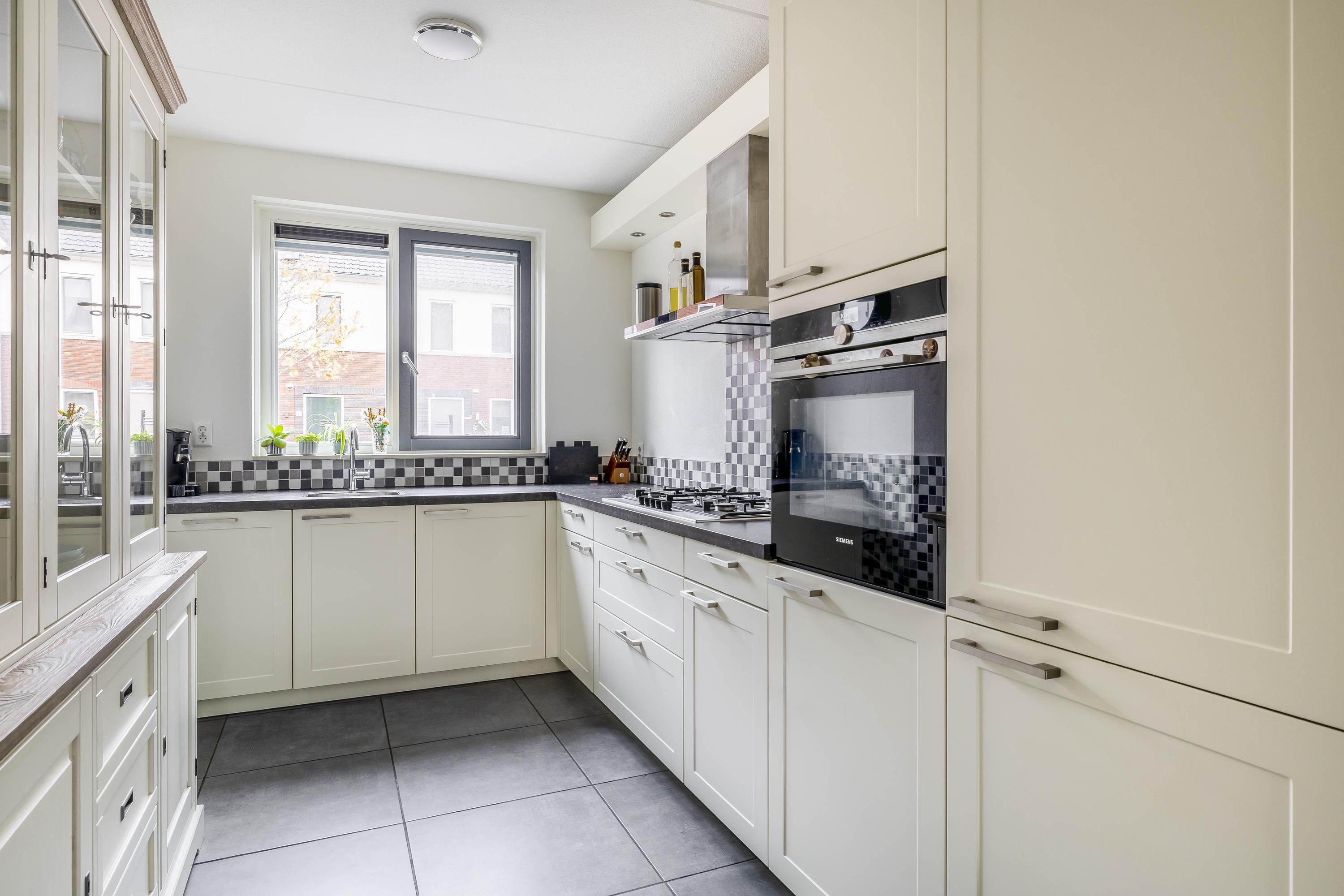 Aan de voorzijde ligt de moderne keuken, uitgevoerd in een landelijke stijl met lichte frontpanelen en een donker werkblad. De keuken in L-opstelling biedt veel werk- en opbergruimte en is uitgerust met alle benodigde inbouwapparatuur, waaronder een gaskookplaat met afzuigkap, een combimagnetron, koelkast, vriezer en vaatwasser. Het grote raam aan de voorzijde zorgt voor fijn daglicht en uitzicht op de rustige straat.