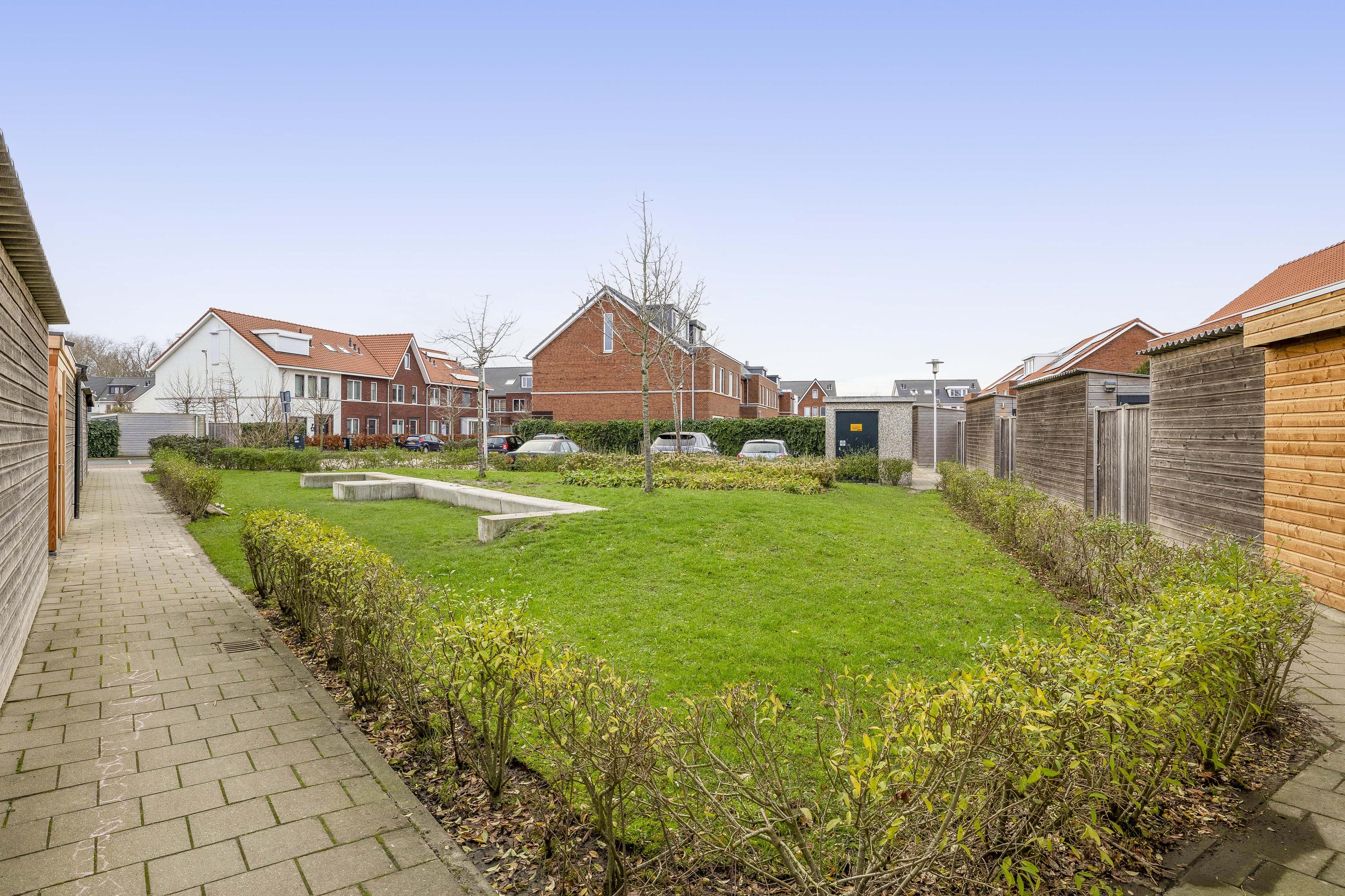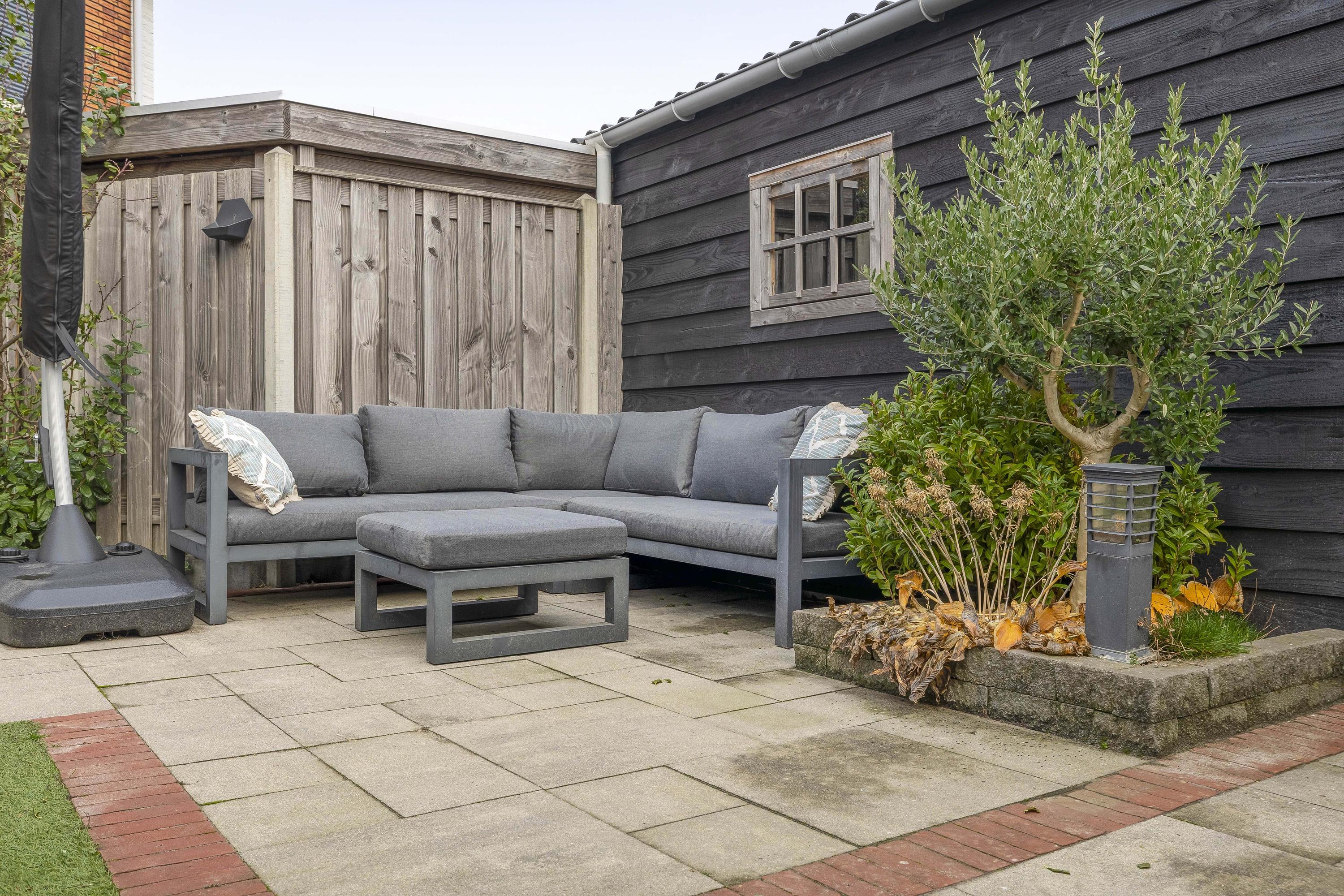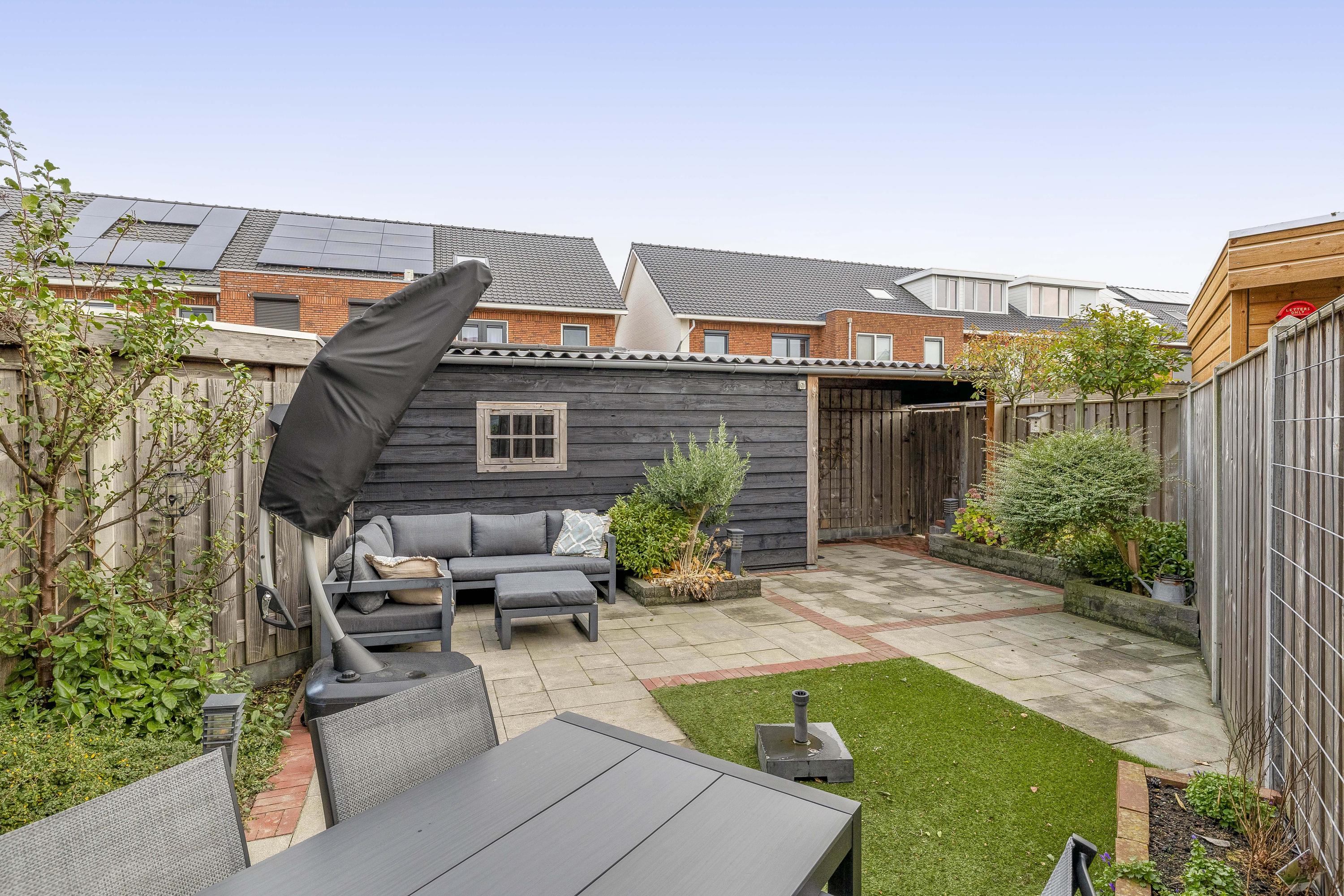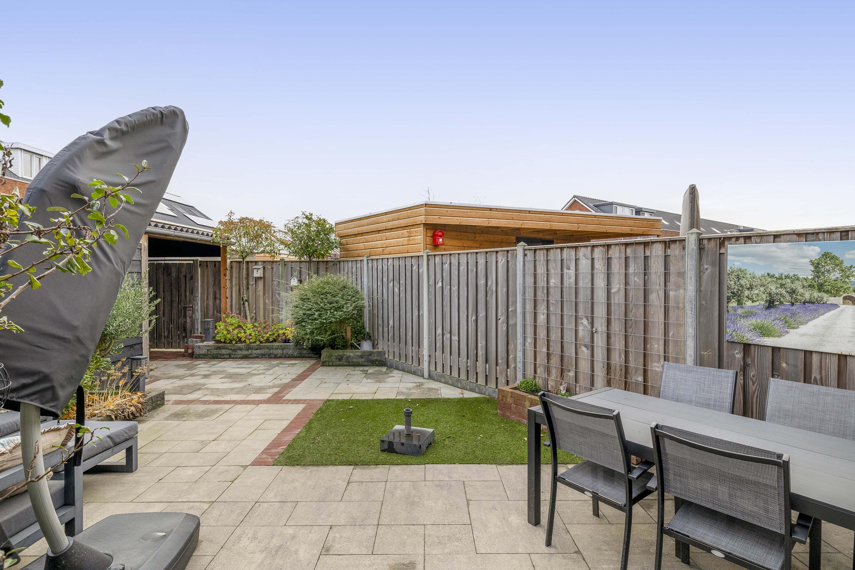 Achterin bevindt zich een moderne berging met overkapping uit 2023. De berging is ruim genoeg voor fietsen, gereedschap en opslag, terwijl de overkapping een fijne plek biedt om beschut buiten te zitten. De tuin ligt gunstig voor optimale bezonning en dankzij de houten erfafscheiding geniet je van veel privacy.
