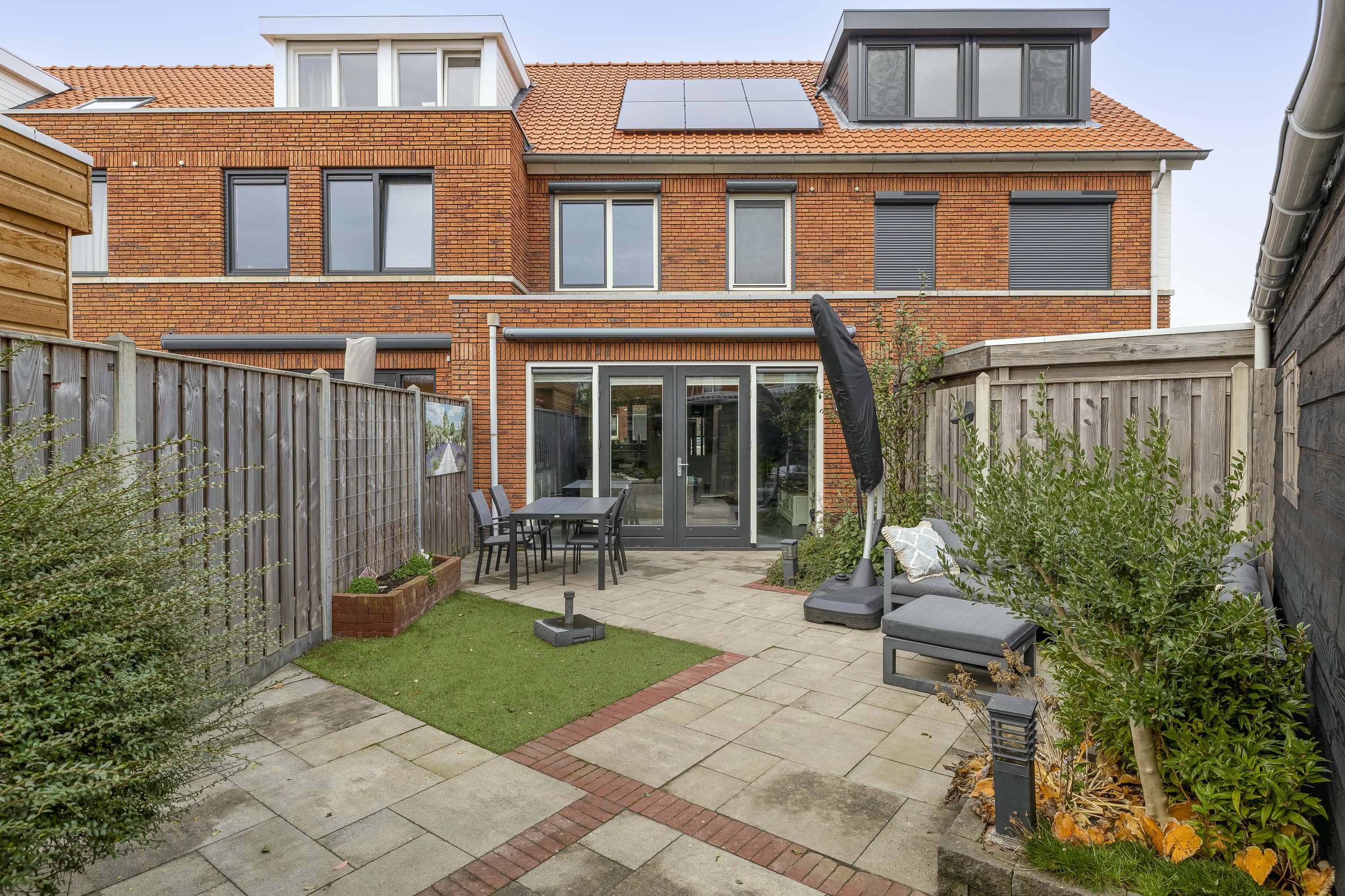 De diepe achtertuin vormt een heerlijk verlengstuk van de woonkamer. Dankzij de openslaande deuren stap je direct de tuin in, die is ingericht met onderhoudsvriendelijke bestrating, kunstgras, diverse beplantingen en voorzien van een zonnescherm. De tuin biedt voldoende ruimte voor meerdere zithoeken, zowel in de zon als in de schaduw.