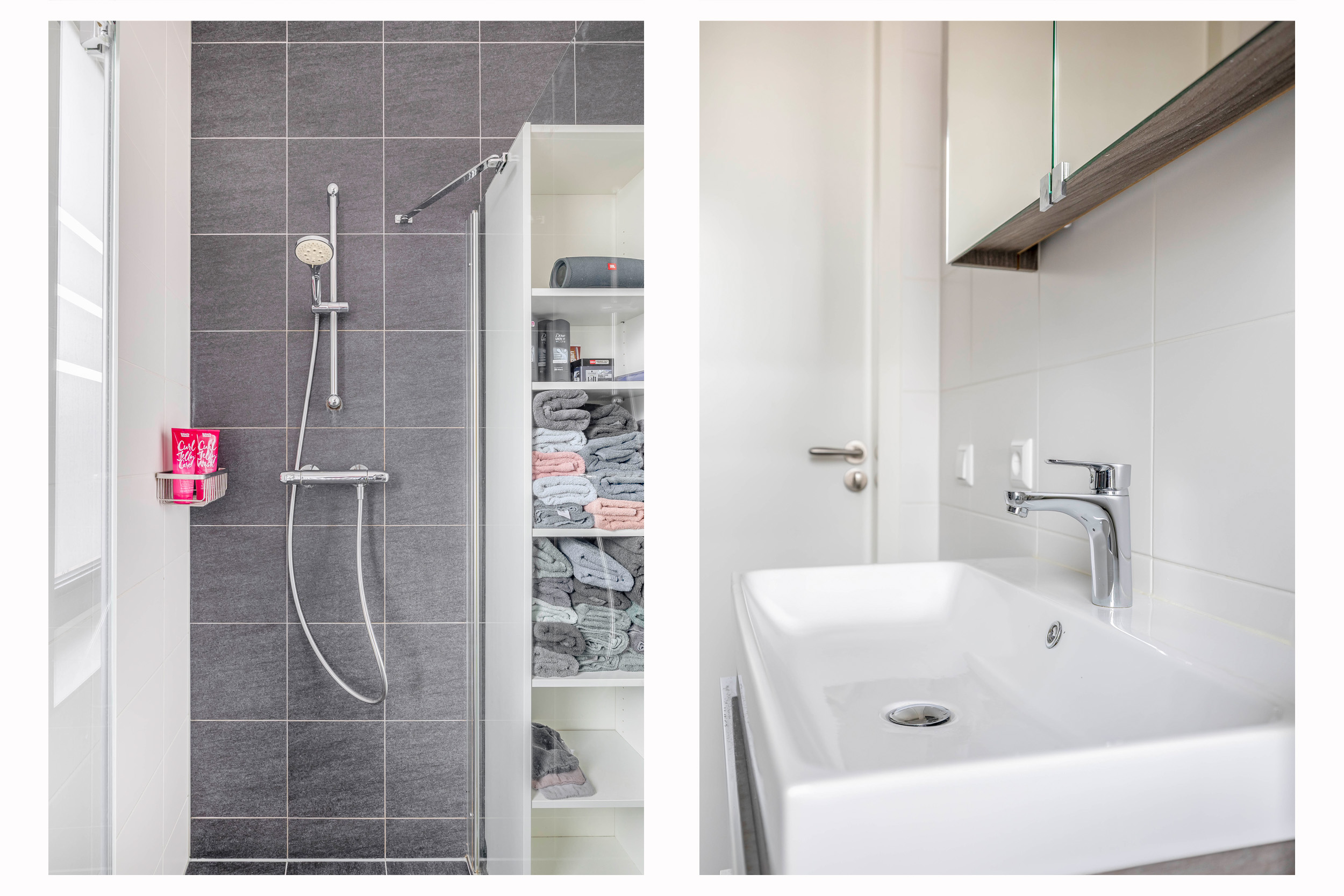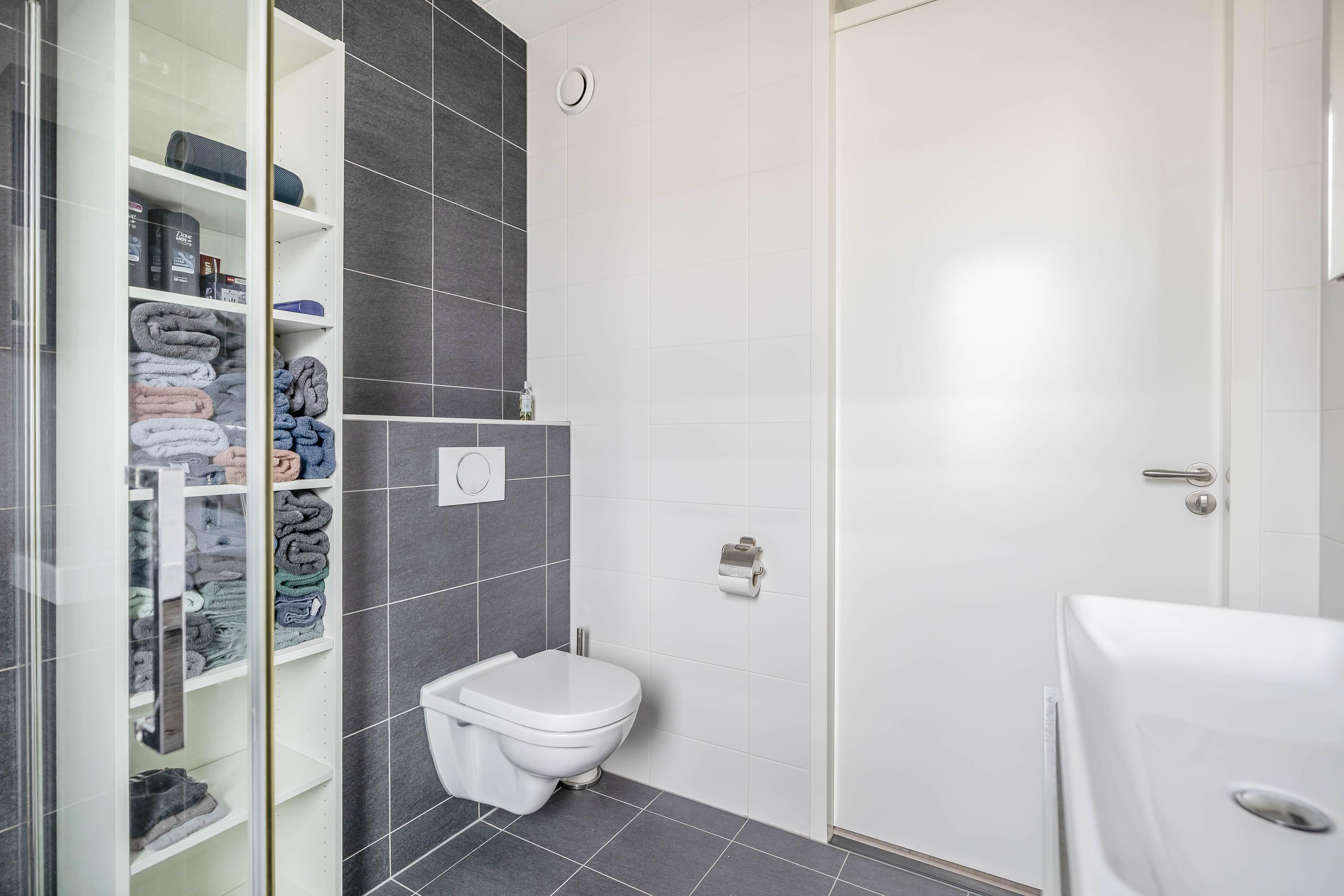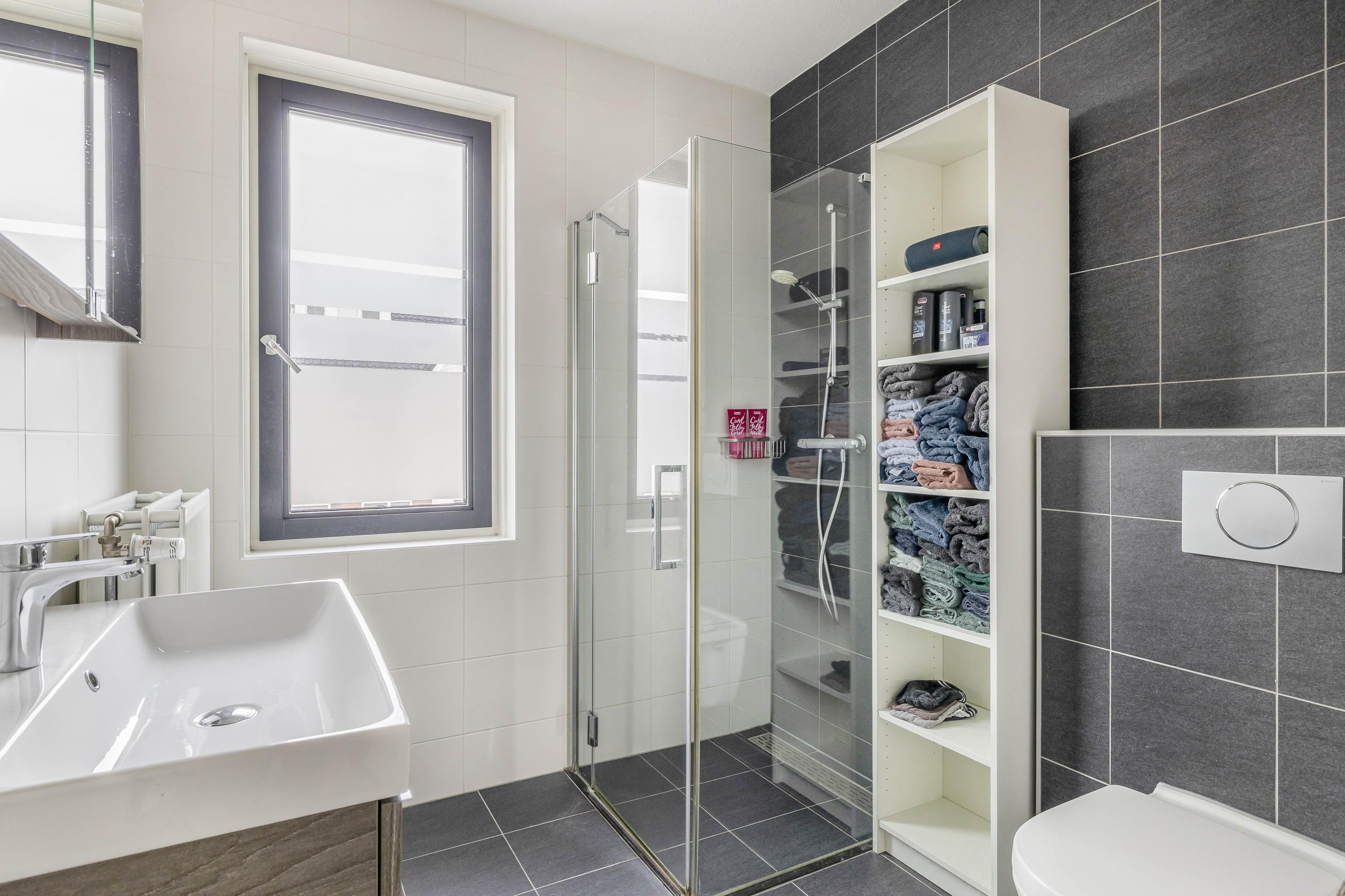 De badkamer is modern en volledig betegeld met een combinatie van lichte wanden en donkere vloertegels. De ruimte is ingedeeld met een douche met glazen wand, een wastafelmeubel en een tweede toilet. Een raam biedt daglicht en natuurlijke ventilatie. De wasmachine- en drogeraansluiting zijn eveneens op deze verdieping aanwezig.