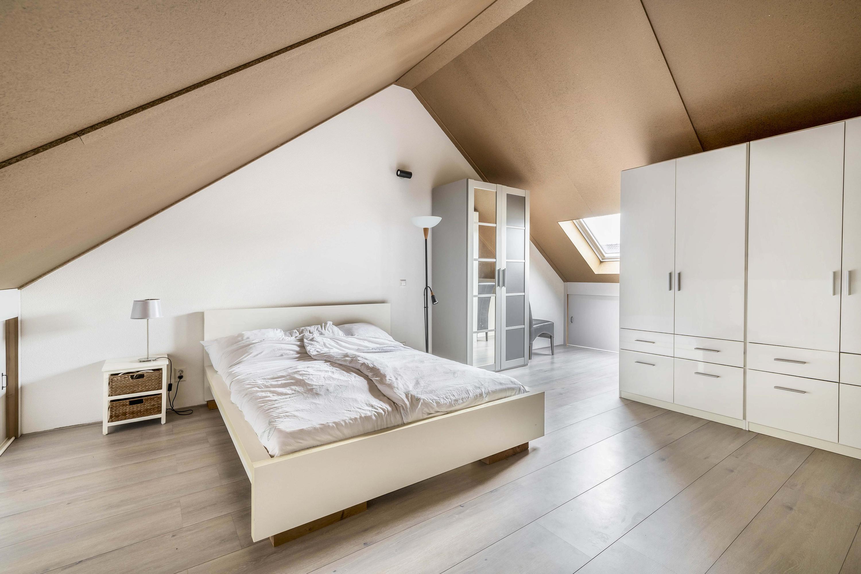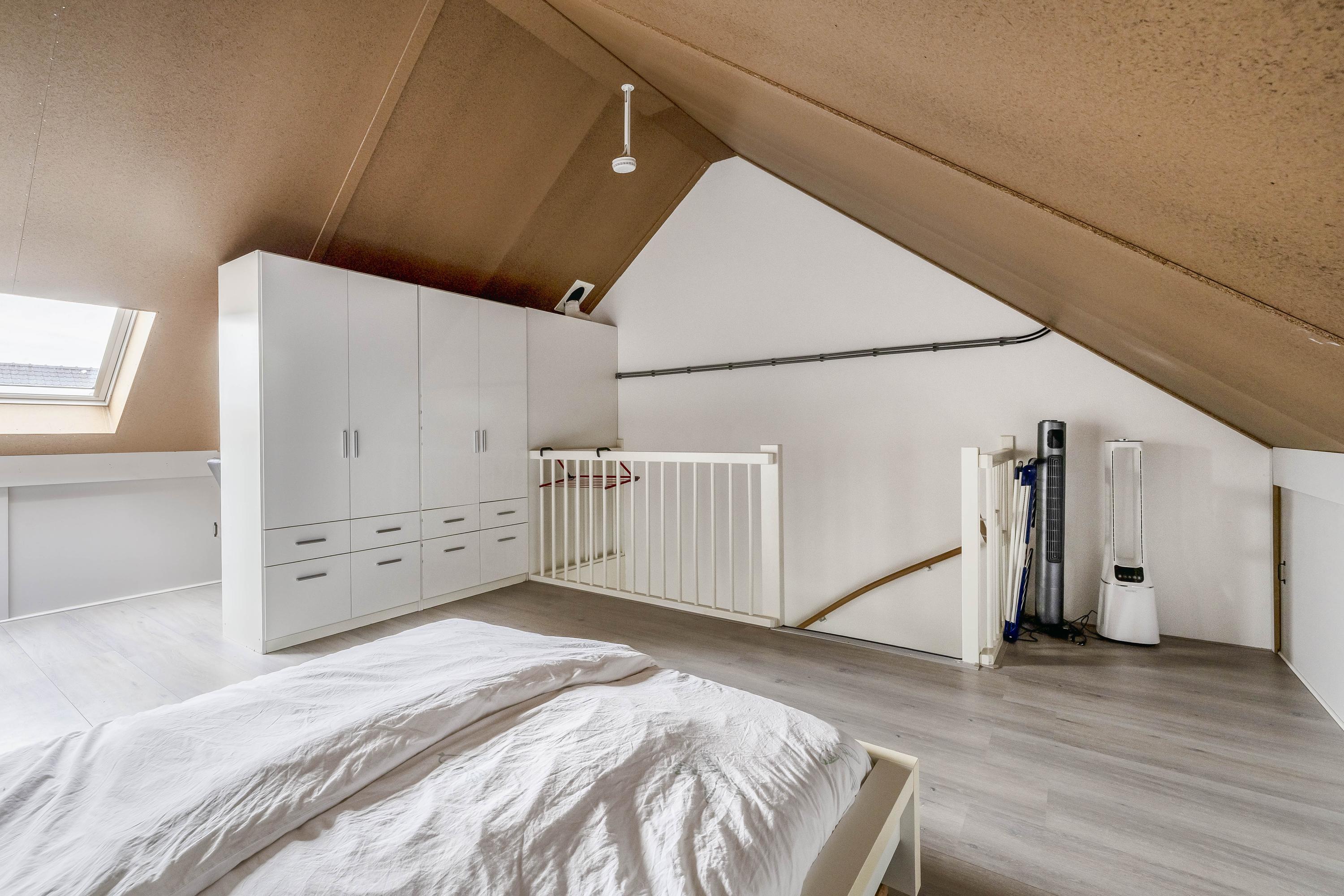 De tweede verdieping is een volwaardige woonlaag en een enorme meerwaarde voor het huis. Dankzij de hoge nok van 3,33 meter, het grote dakraam en de brede afmetingen is dit een zeer veelzijdige ruimte. Momenteel is de verdieping ingericht als ruime slaapkamer, er zijn volop mogelijkheden: het realiseren van twee aparte kamers, een kantoor aan huis, een speelzolder of een hobbyruimte. Aan weerszijden bevinden zich knieschotten met opbergruimte.