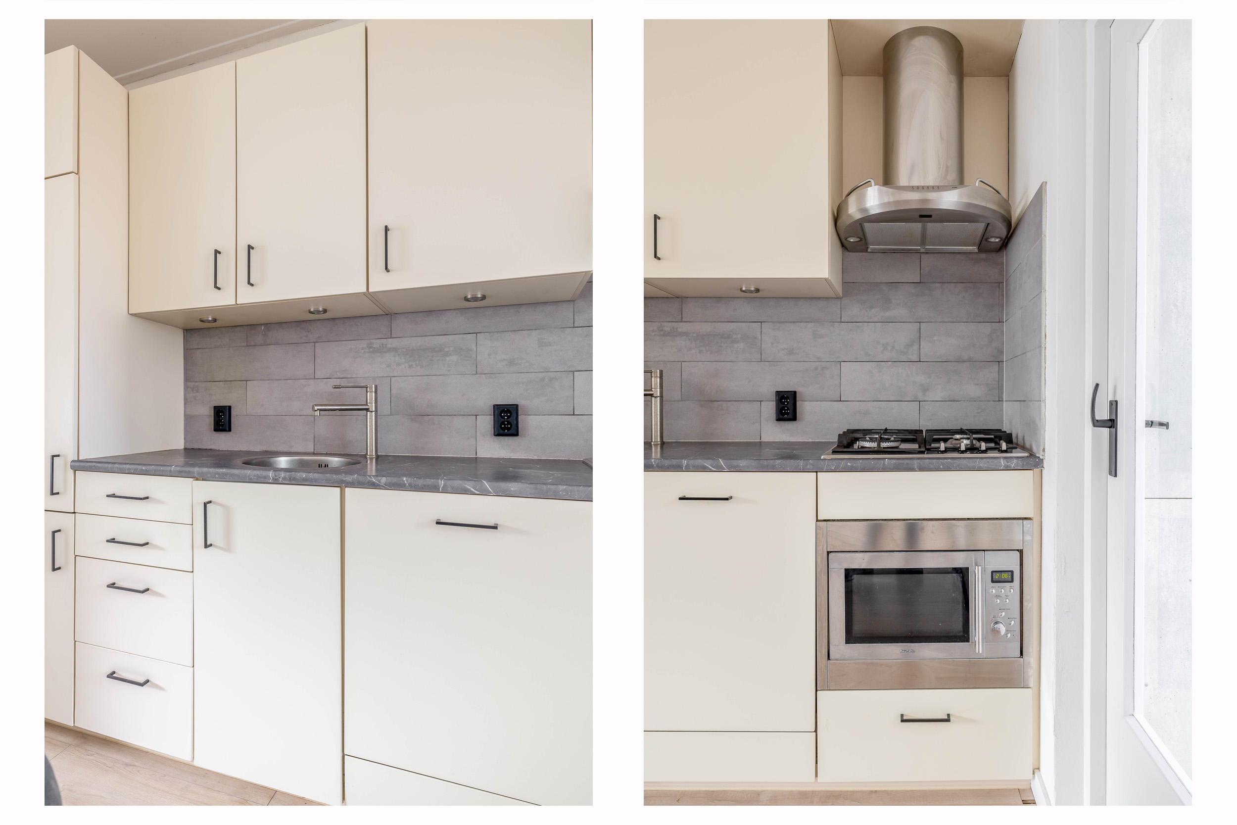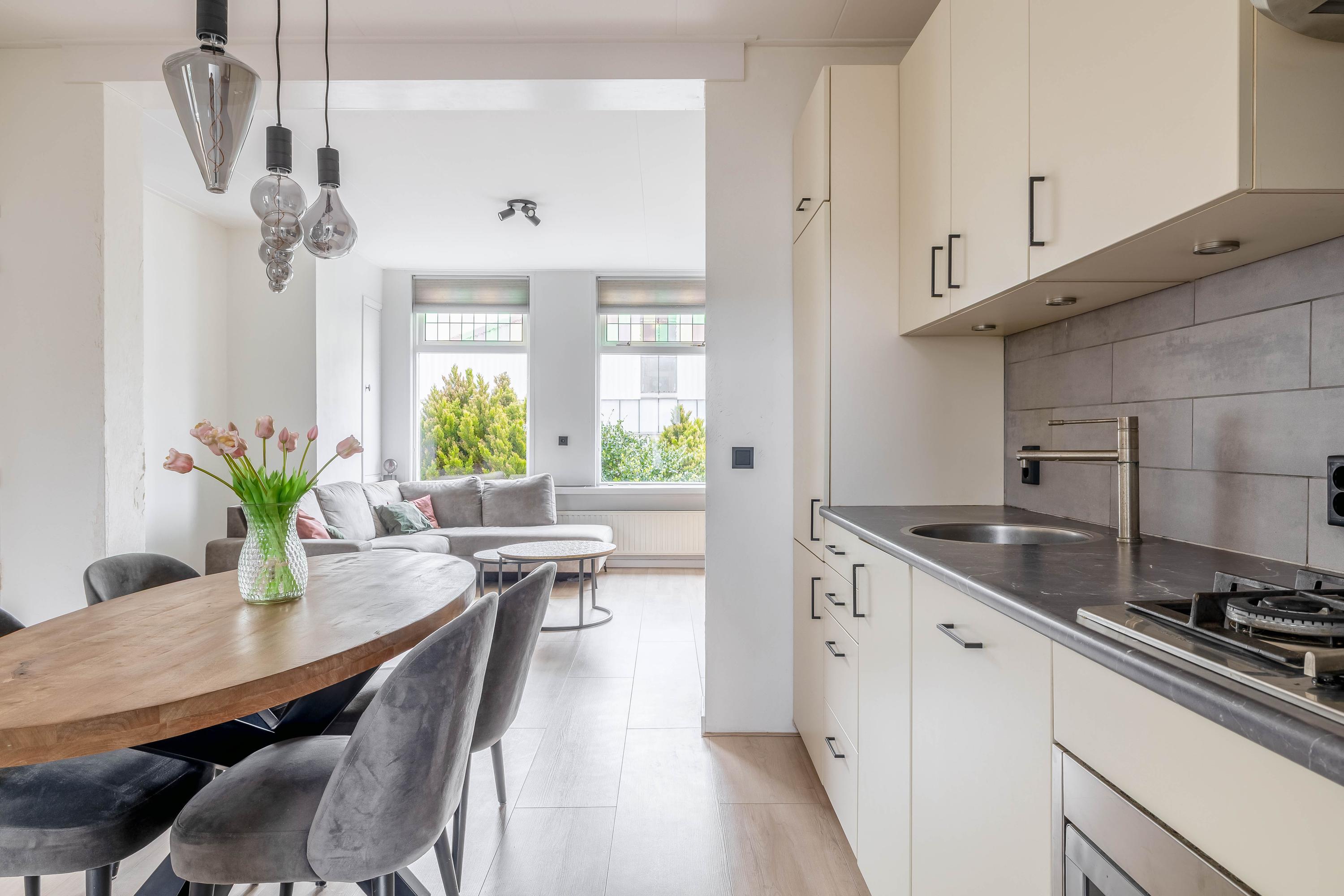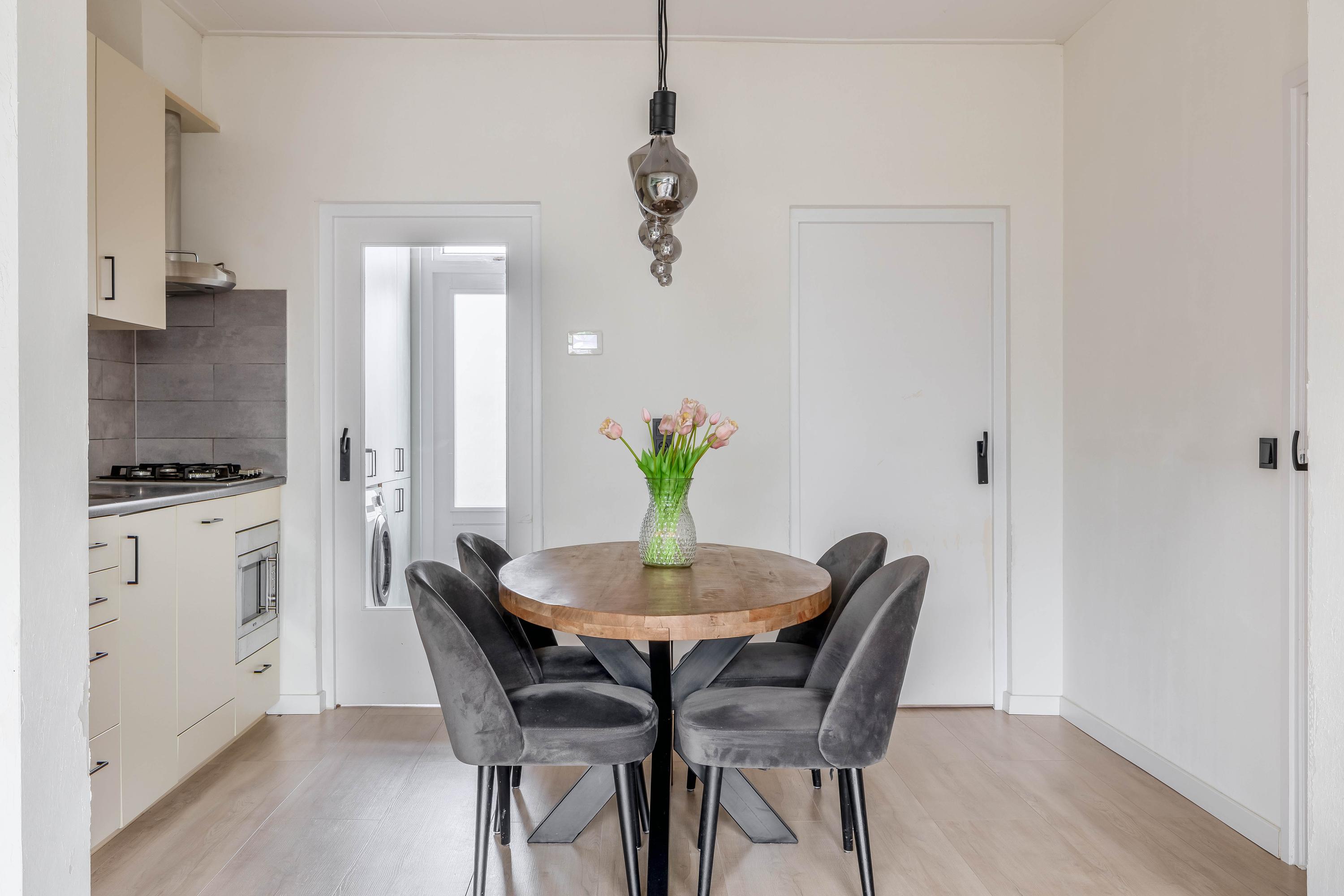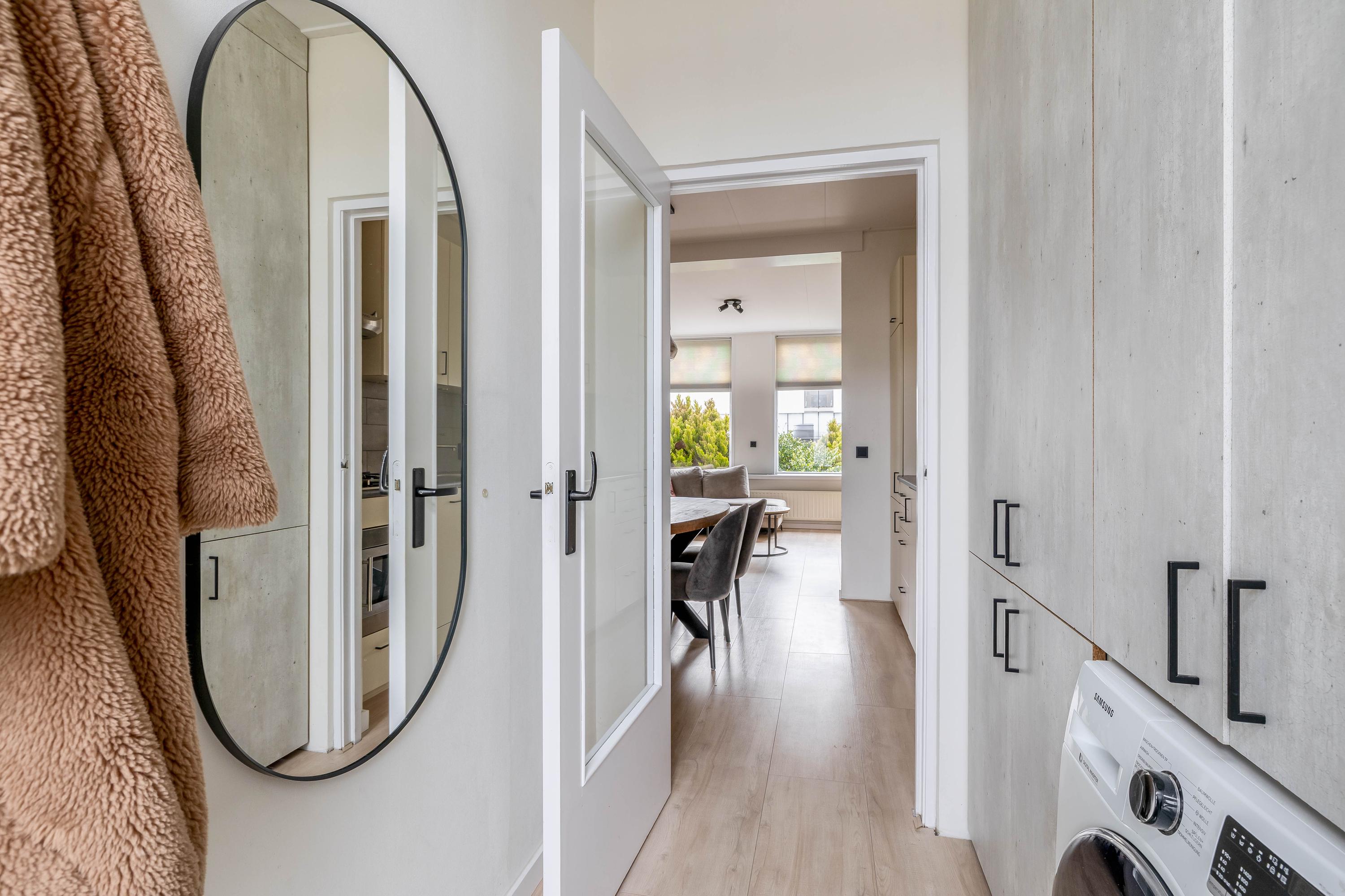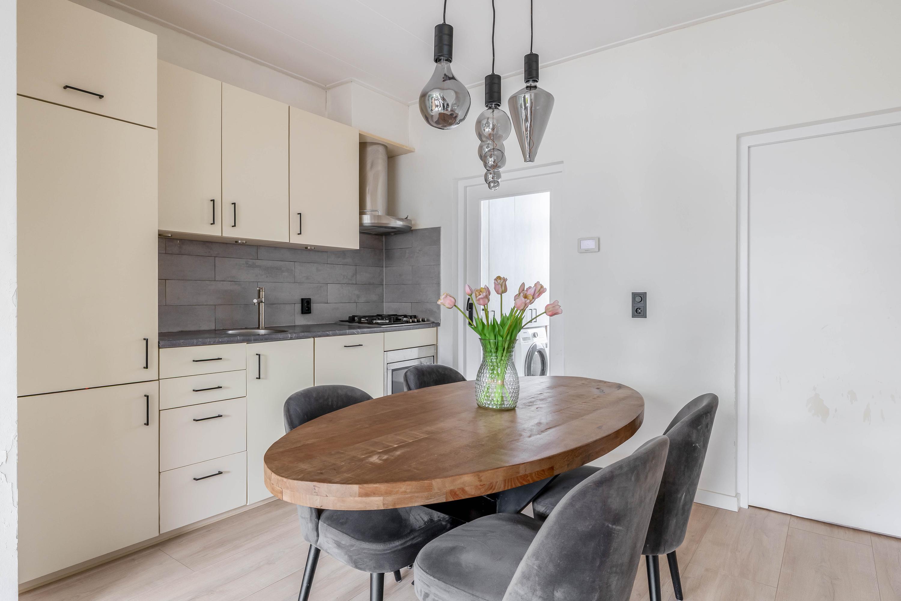 De keuken is strak en functioneel ingericht en voorzien van diverse inbouwapparatuur. Er is voldoende werk- en kastruimte aanwezig, waardoor koken hier echt een plezier wordt. De keuken sluit mooi aan op de rest van de woning en biedt direct toegang tot de woonkamer.