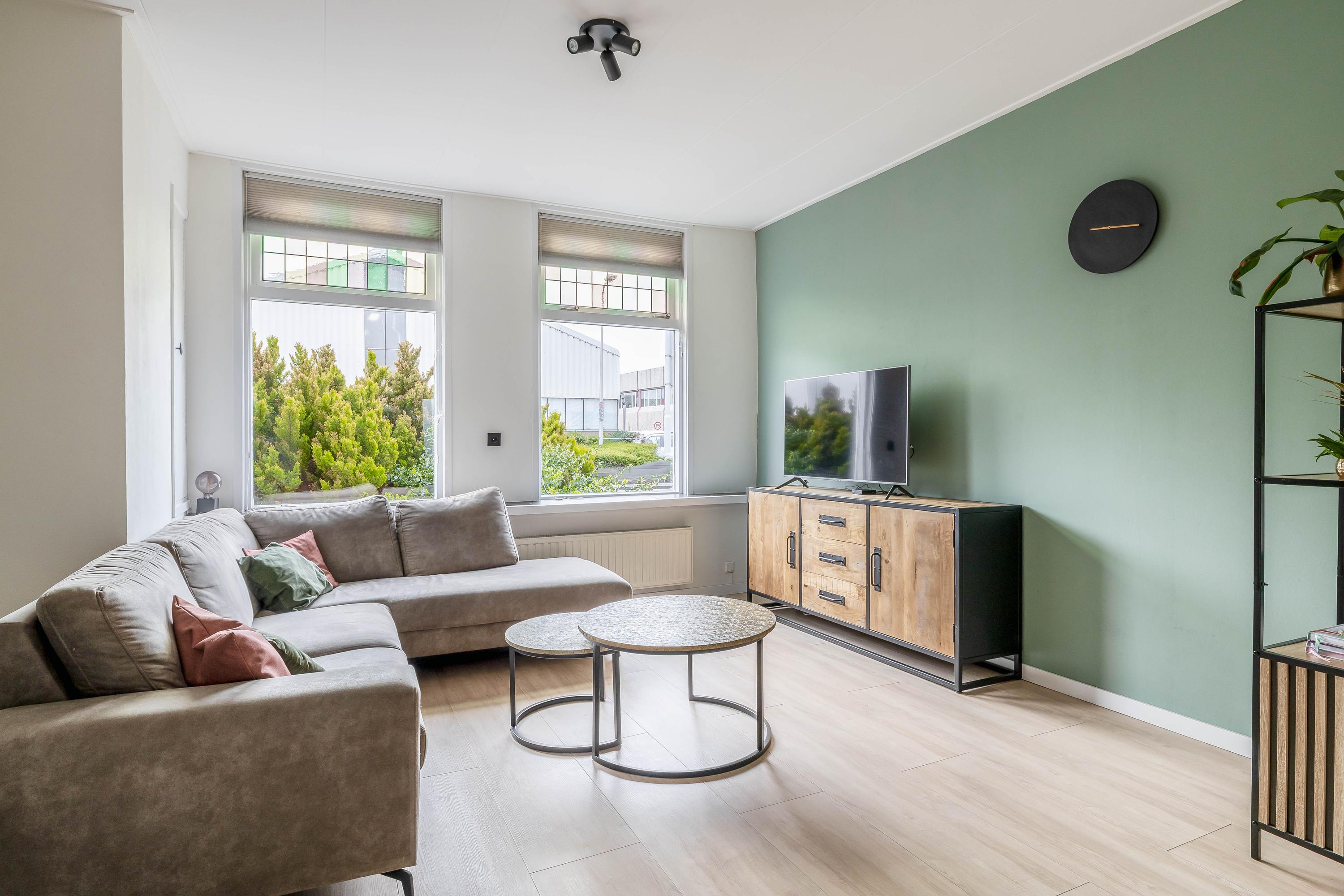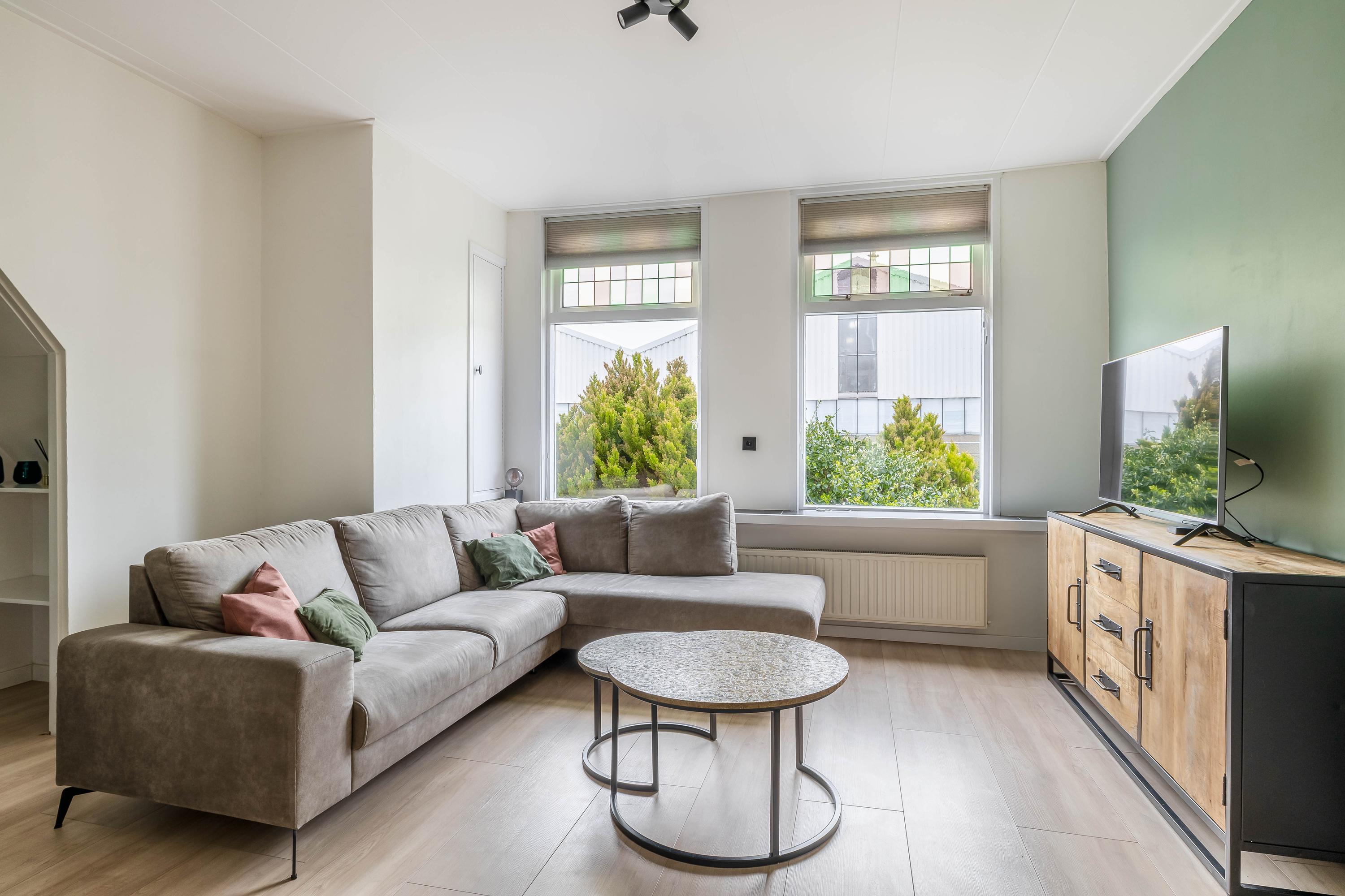 De woonkamer is een heerlijke lichte ruimte dankzij de grote raampartijen aan de voorzijde. De combinatie van moderne afwerking, rustige kleuren en veel daglicht zorgt voor een warme en uitnodigende sfeer.