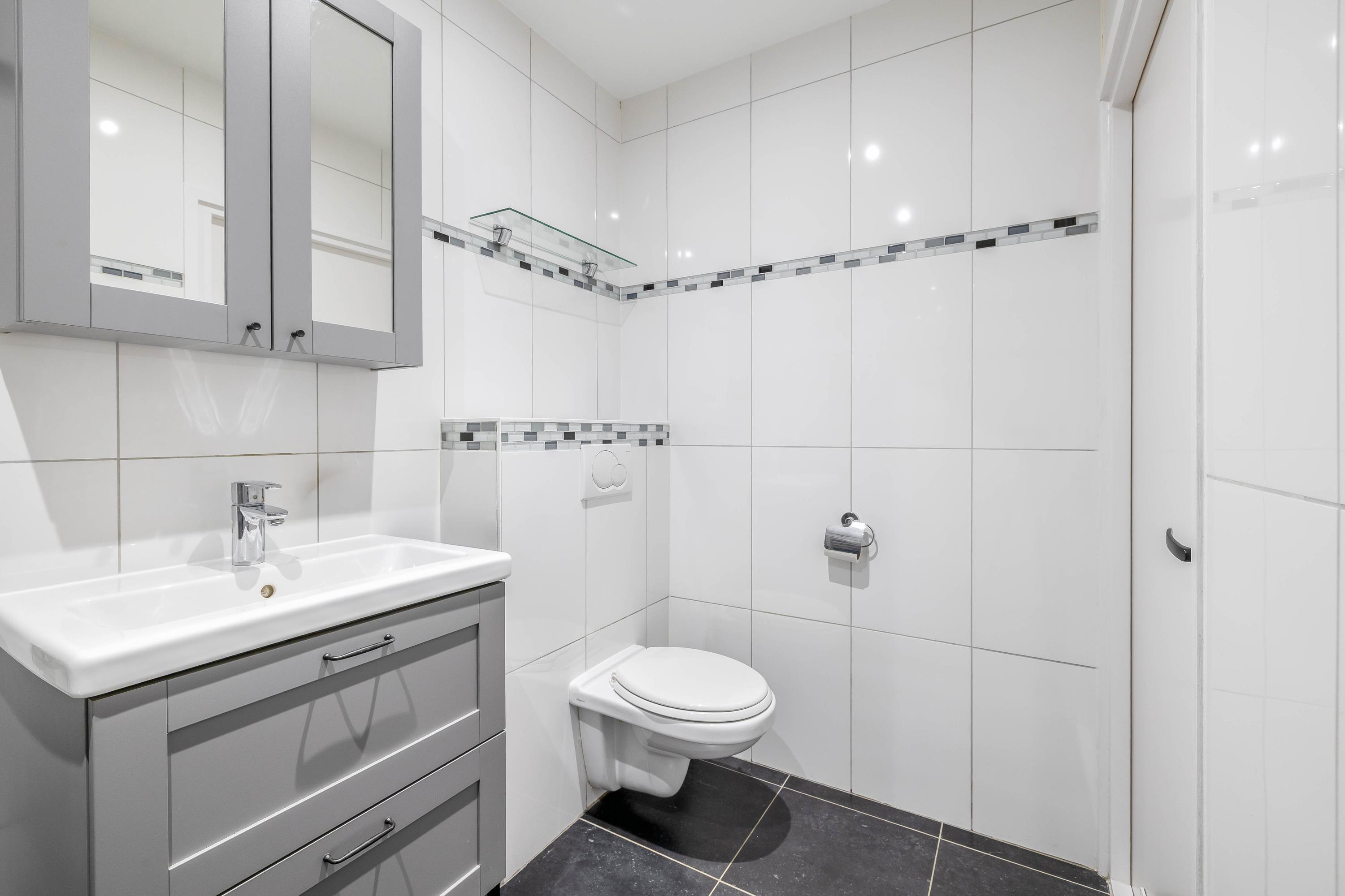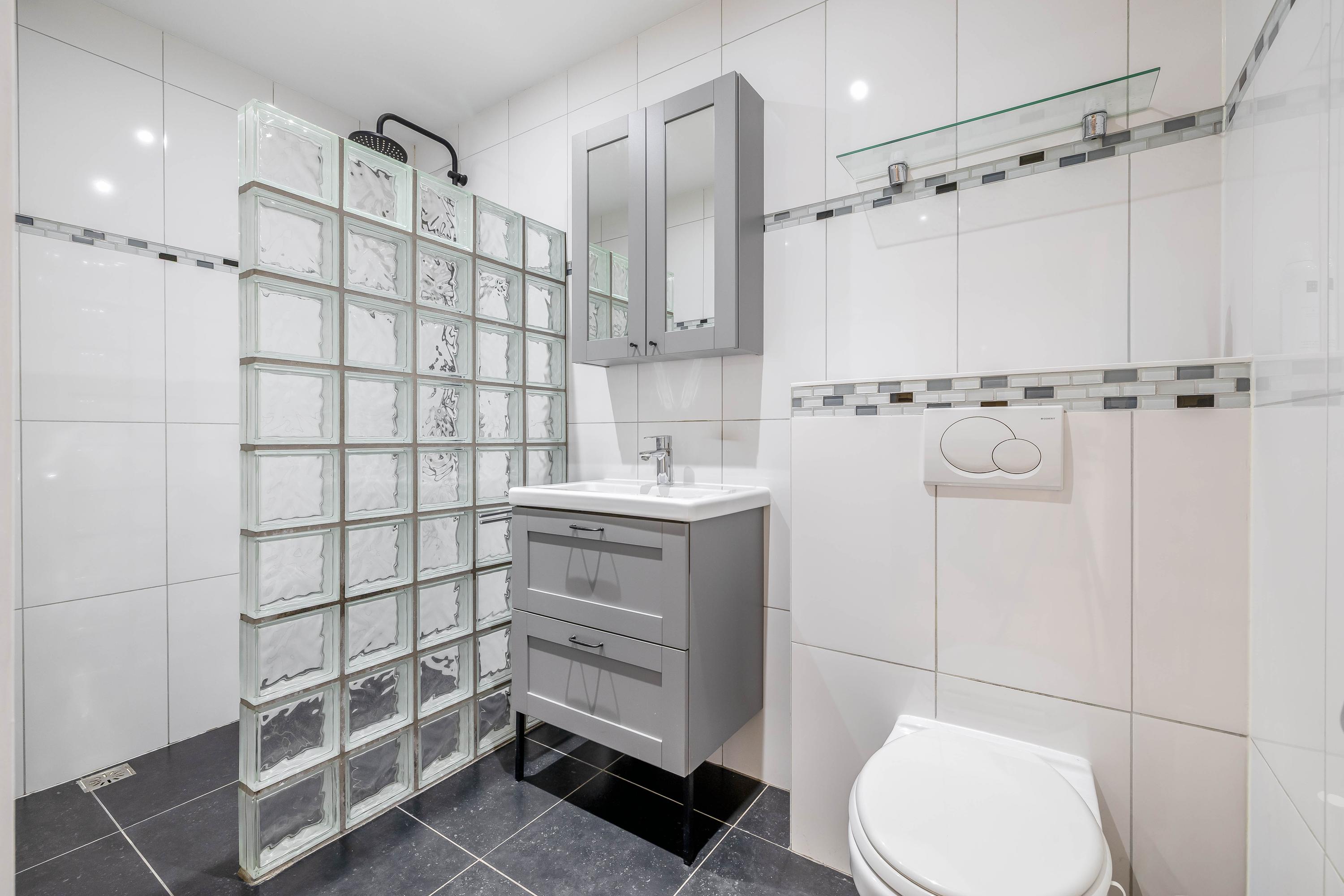 De badkamer is modern uitgevoerd en beschikt over een inloopdouche, wastafelmeubel en toilet. Daarnaast is er vloerverwarming aanwezig, wat zorgt voor extra comfort.