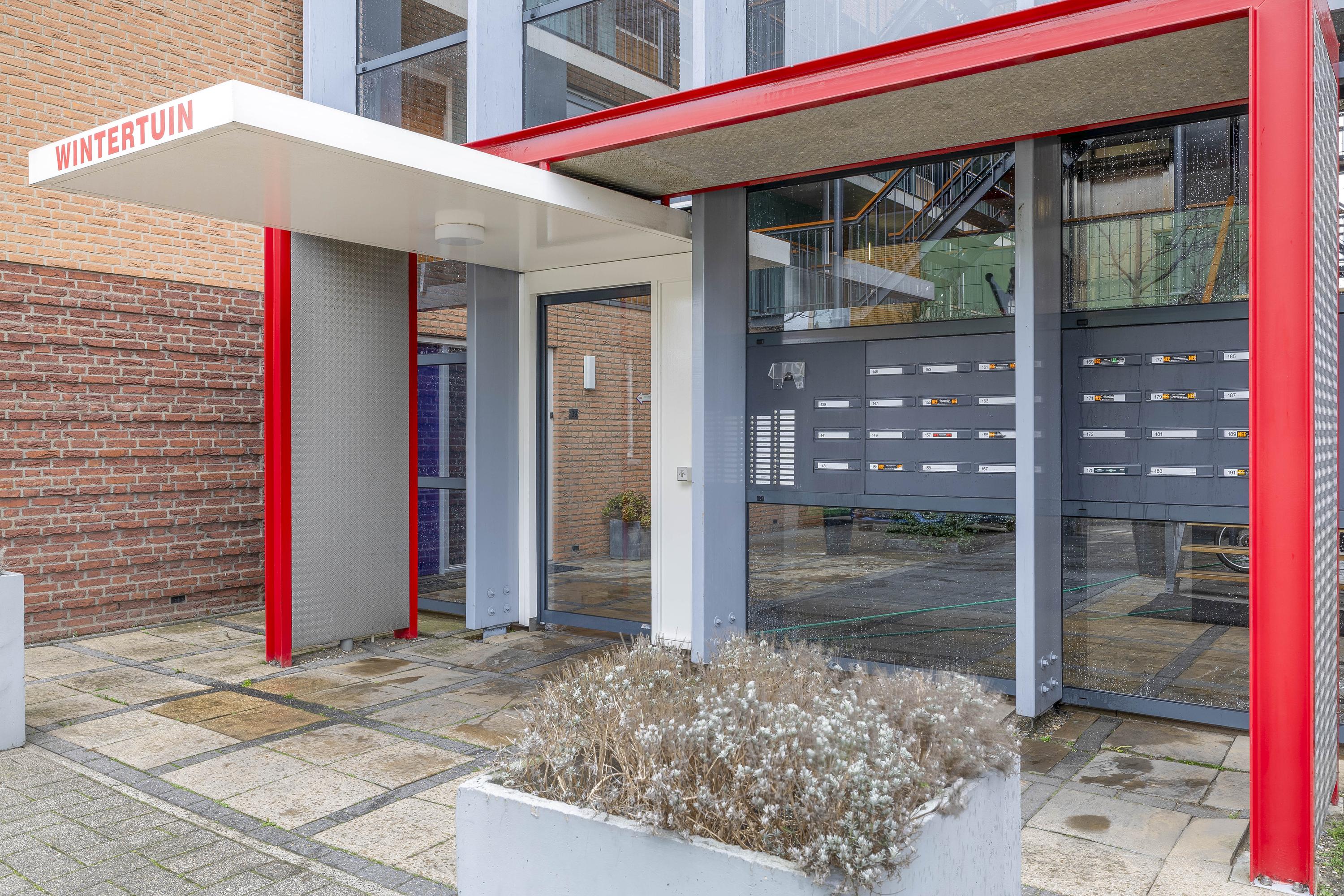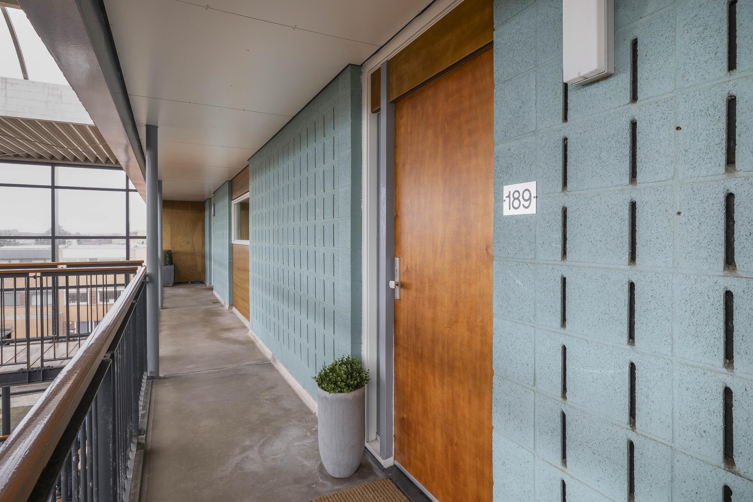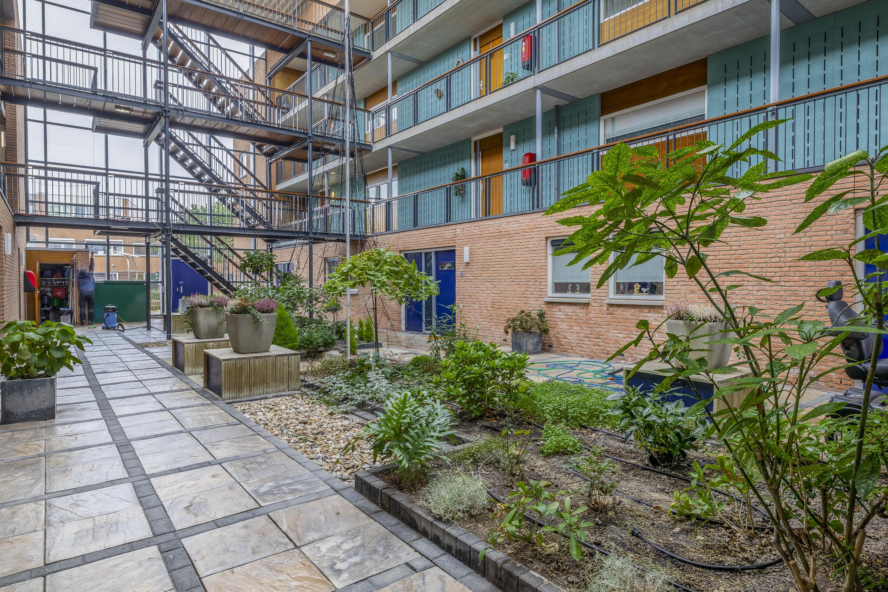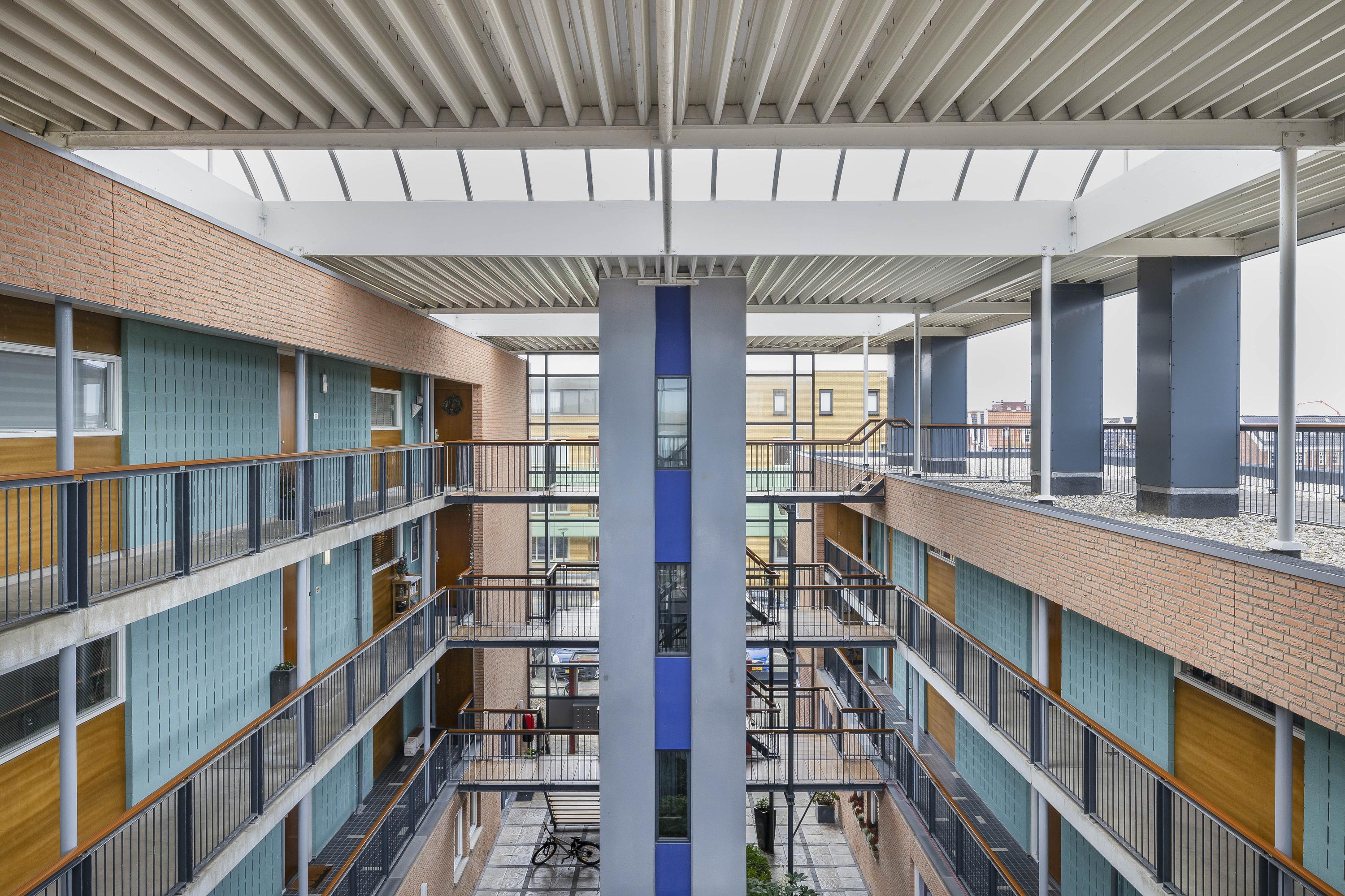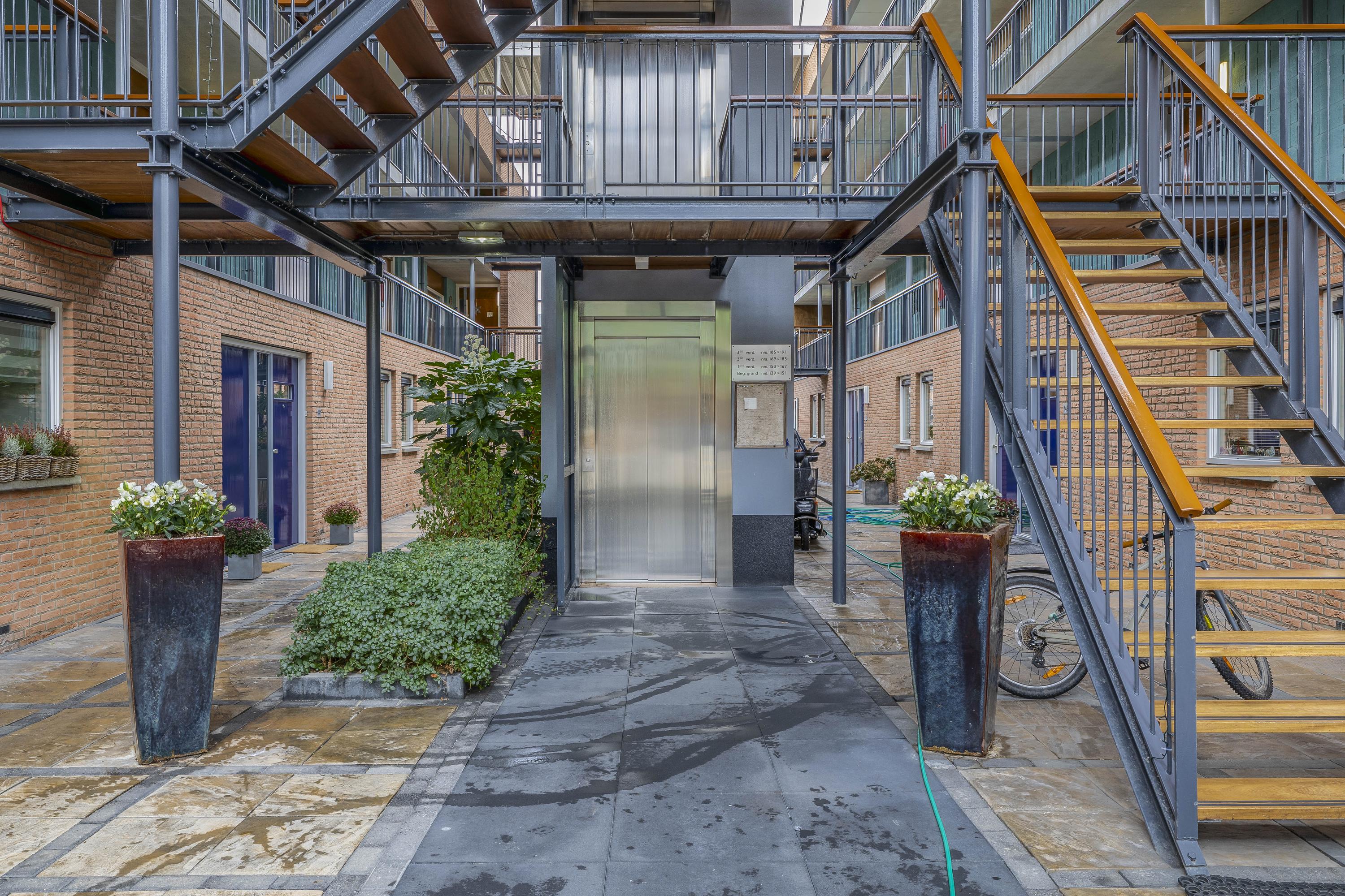 Via de automatische schuifdeur bereik je de binnentuin, een gezellige ruimte met bestrating in natuursteenlook, grote plantenbakken en verschillende zitplekken. De lift en het open trappenhuis brengen je naar de derde verdieping, waar de galerij toegang geeft tot de woning.