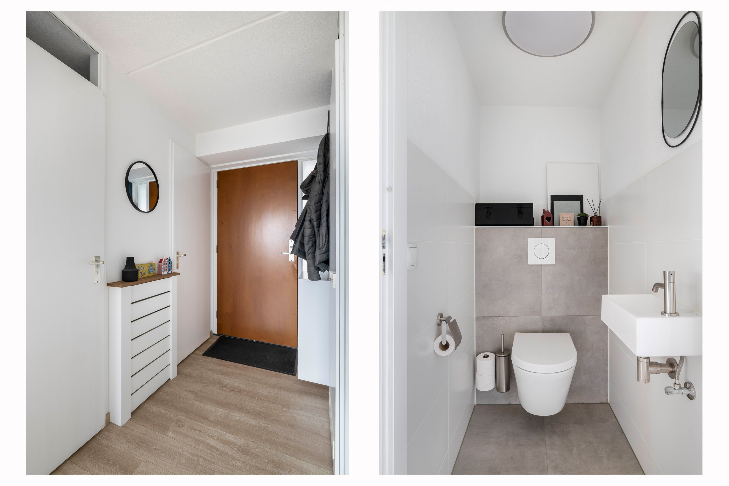 Binnen valt direct de doorlopende laminaatvloer op, warm van kleur en netjes onderhouden. De hal verbindt alle vertrekken met elkaar en geeft toegang tot het toilet, dat strak is afgewerkt met witte wandtegels, een fonteintje en een neutrale vloer.