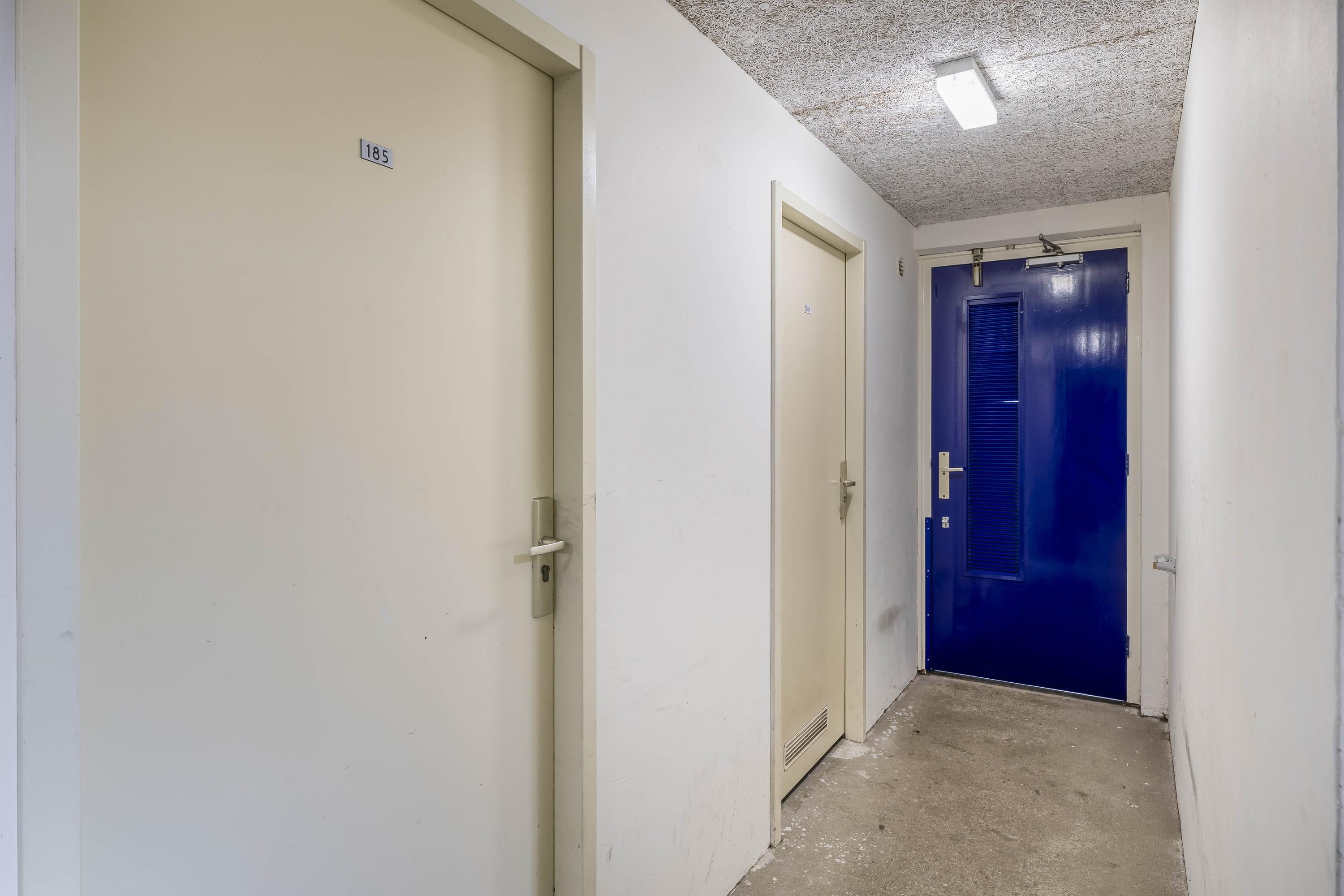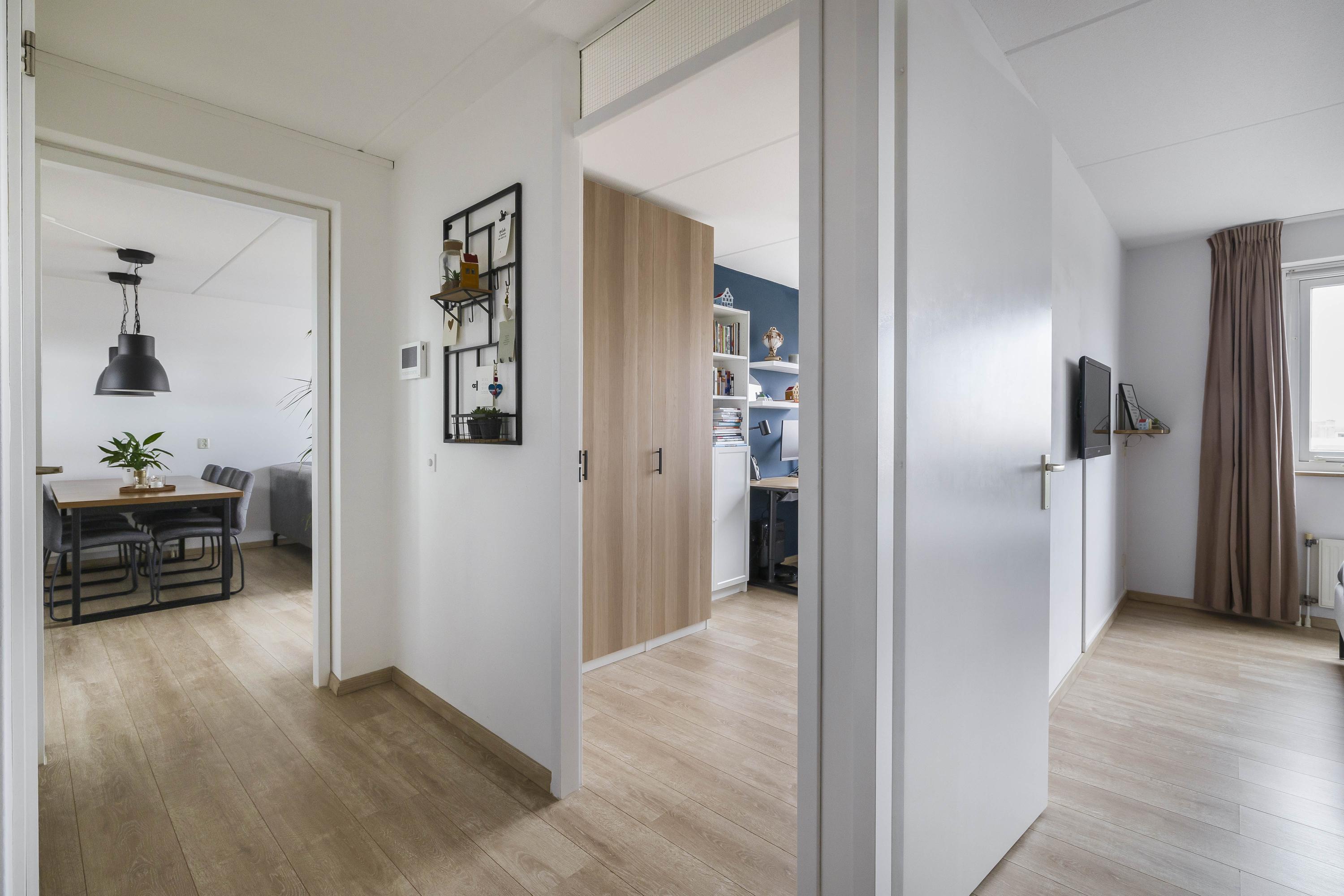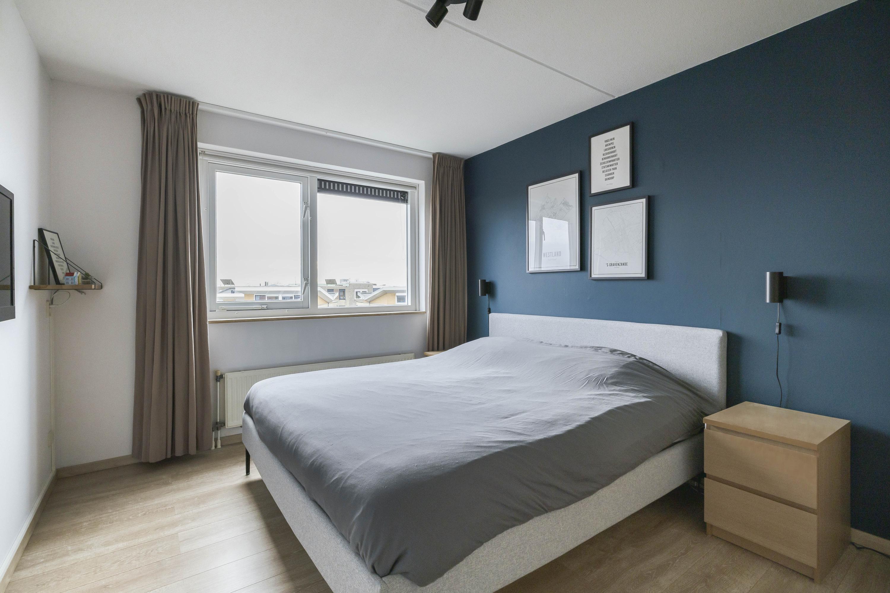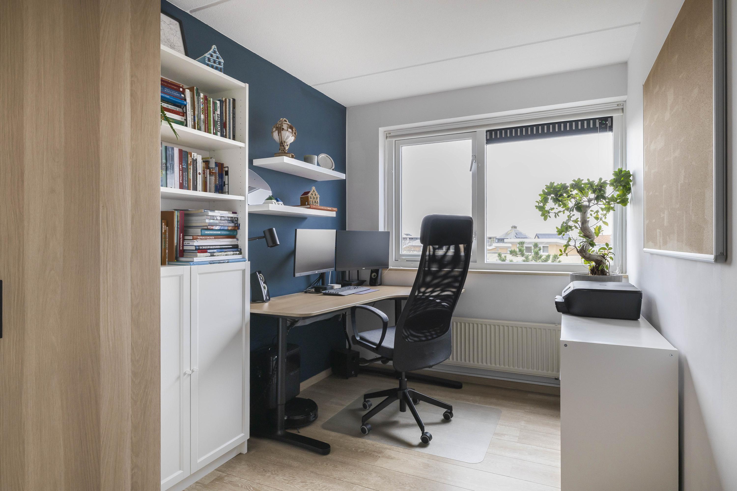 Beide slaapkamers liggen aan de rustige zijde van het complex. De hoofdslaapkamer heeft ruimte voor een groot tweepersoonsbed en een brede kast. De tweede slaapkamer is nu ingericht als werkruimte met bureau, boekenkasten en veel licht, ideaal voor kantoor of tweede slaapkamer.