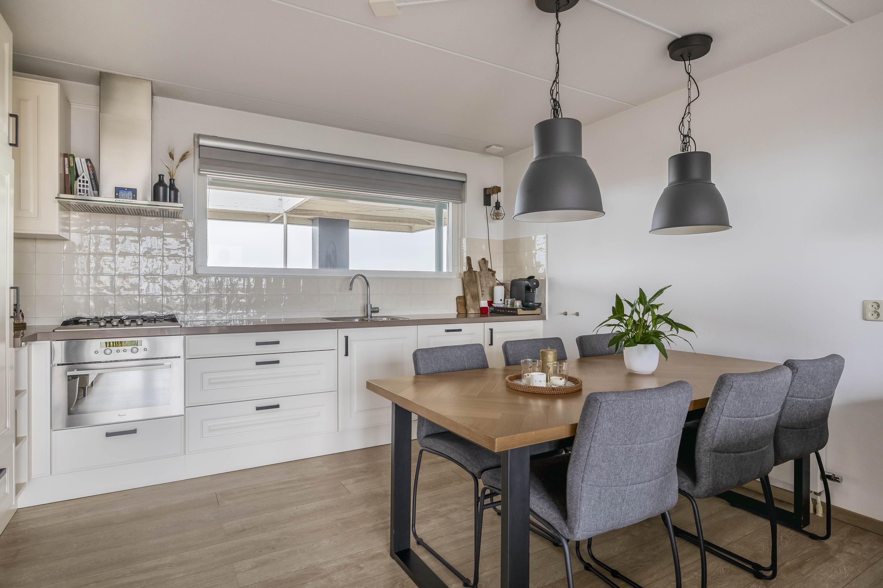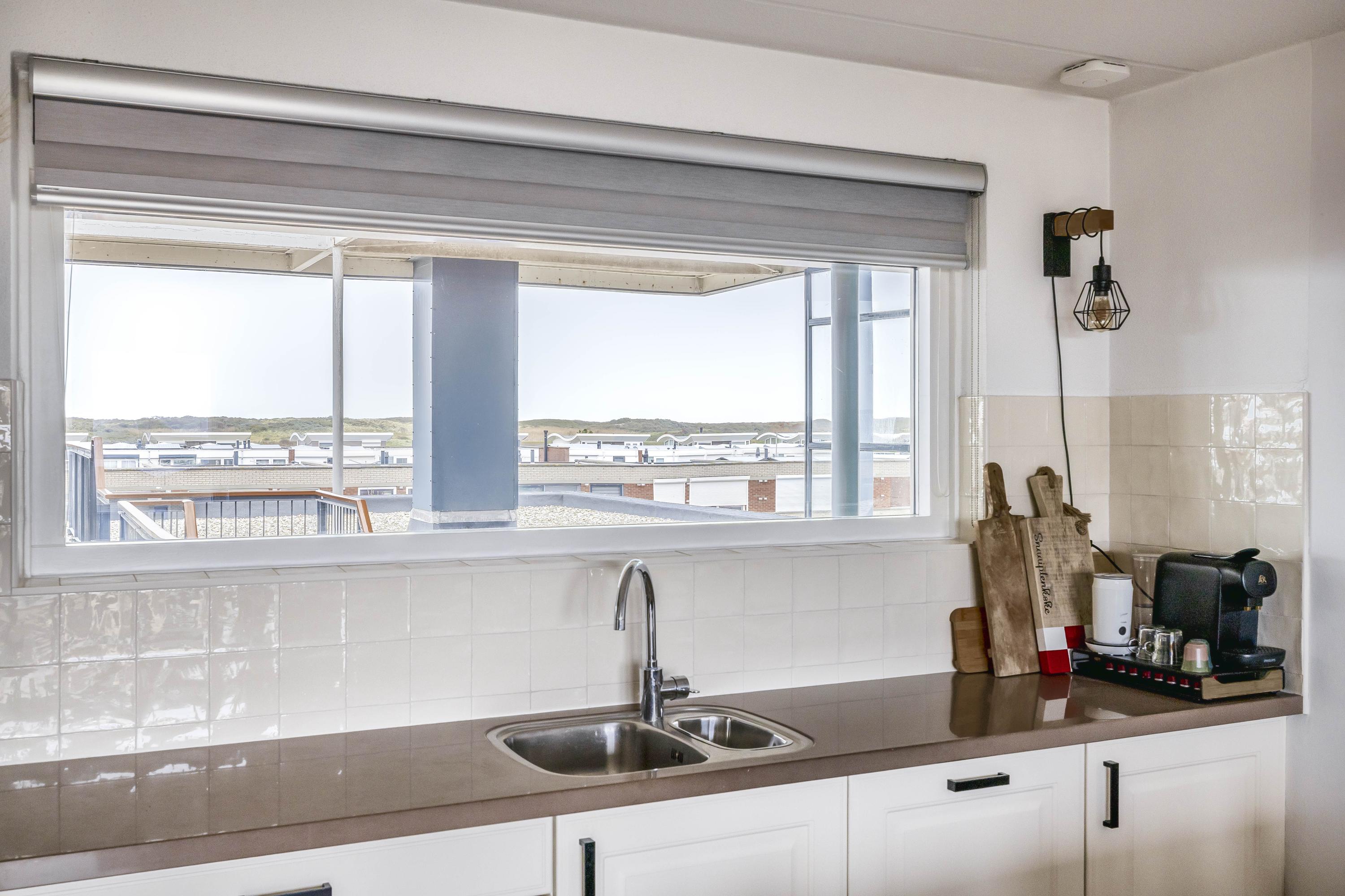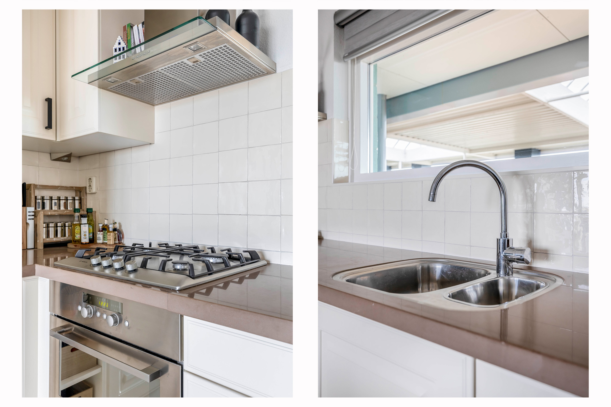 Grenzend aan de woonkamer ligt de open keuken. De keuken heeft een landelijk-moderne uitstraling met witte paneelfronten, een ingebouwde koelkast en een ruim werkblad met een glanzende tegelwand die het licht mooi vangt. De opstelling biedt veel bergruimte en is compleet uitgerust met onder andere een combi-oven, vaatwasser, RVS afzuigkap en een koelkast die in 2020 is vernieuwd. Door de ruime indeling past er een eettafel van zes personen die deze woonkeuken tot een echte leefplek maakt. Het raam in de keuken biedt elke avond een schouwspel van kleuren wanneer de zon ondergaat. Van hieruit zie je de duinen. Pak je stoel en 's avonds eet je met dit uitzicht op het balkon van de gezamenlijke ruimte.