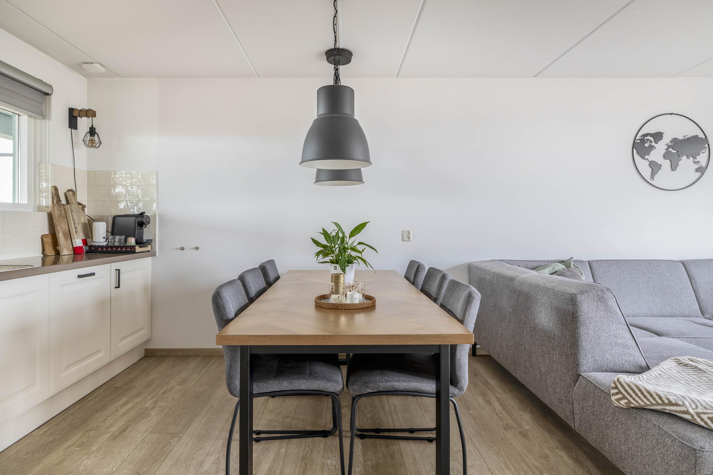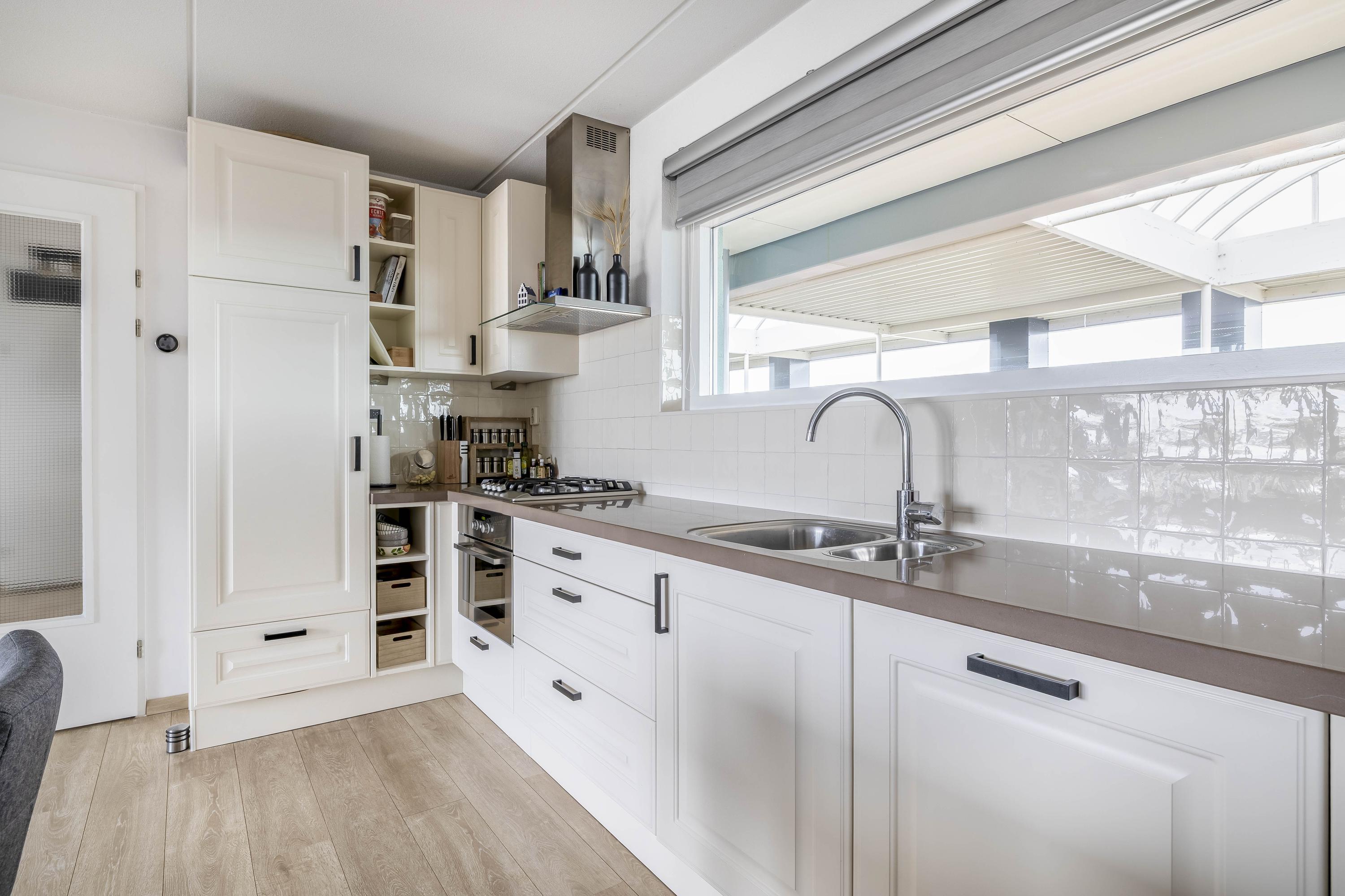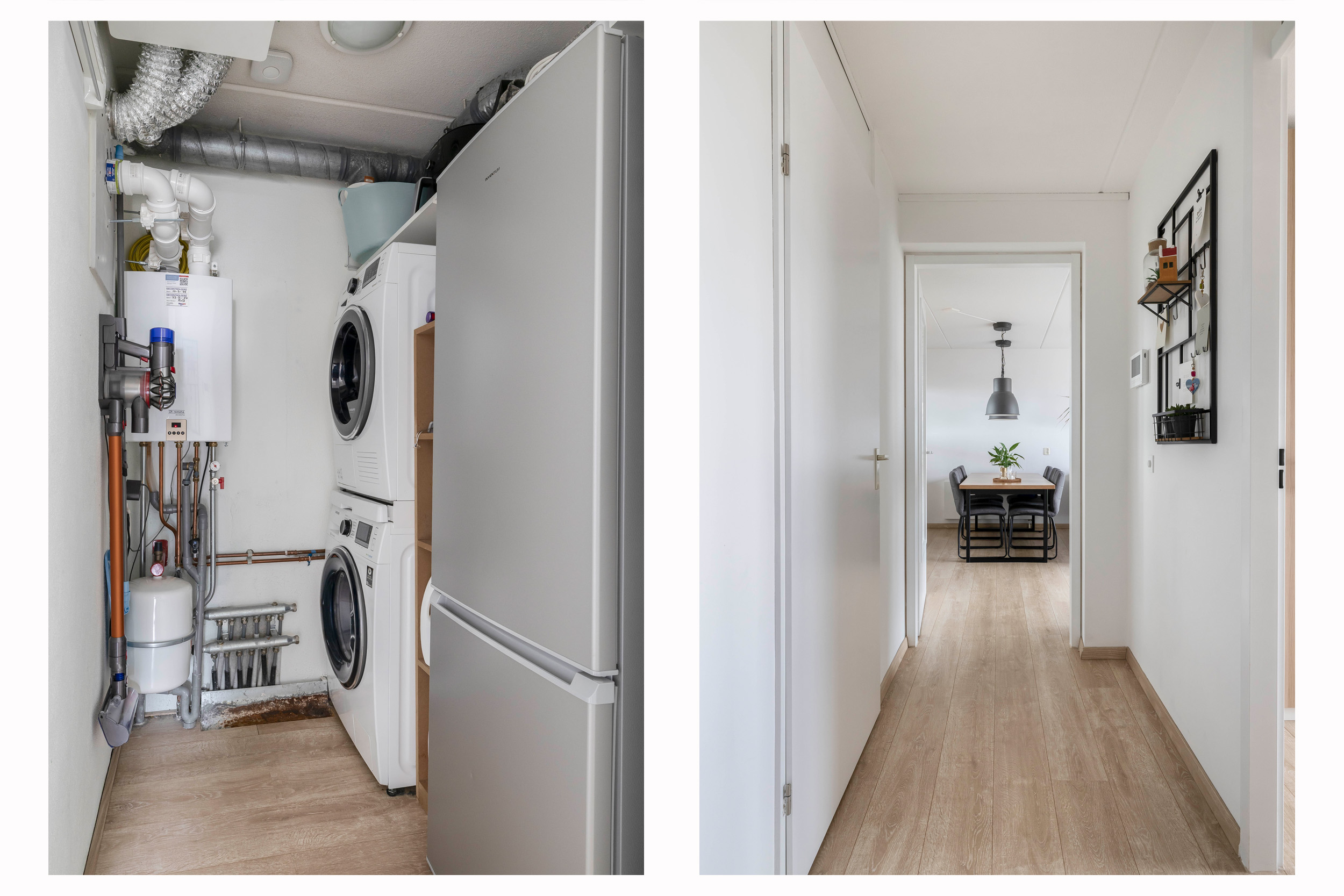 Grenzend aan de woonkamer ligt de open keuken. De keuken heeft een landelijk-moderne uitstraling met witte paneelfronten, een ingebouwde koelkast en een ruim werkblad met een glanzende tegelwand die het licht mooi vangt. De opstelling biedt veel bergruimte en is compleet uitgerust met onder andere een combi-oven, vaatwasser, RVS afzuigkap en een koelkast die in 2020 is vernieuwd. Door de ruime indeling past er een eettafel van zes personen die deze woonkeuken tot een echte leefplek maakt. Het raam in de keuken biedt elke avond een schouwspel van kleuren wanneer de zon ondergaat. Van hieruit zie je de duinen. Pak je stoel en 's avonds eet je met dit uitzicht op het balkon van de gezamenlijke ruimte.
