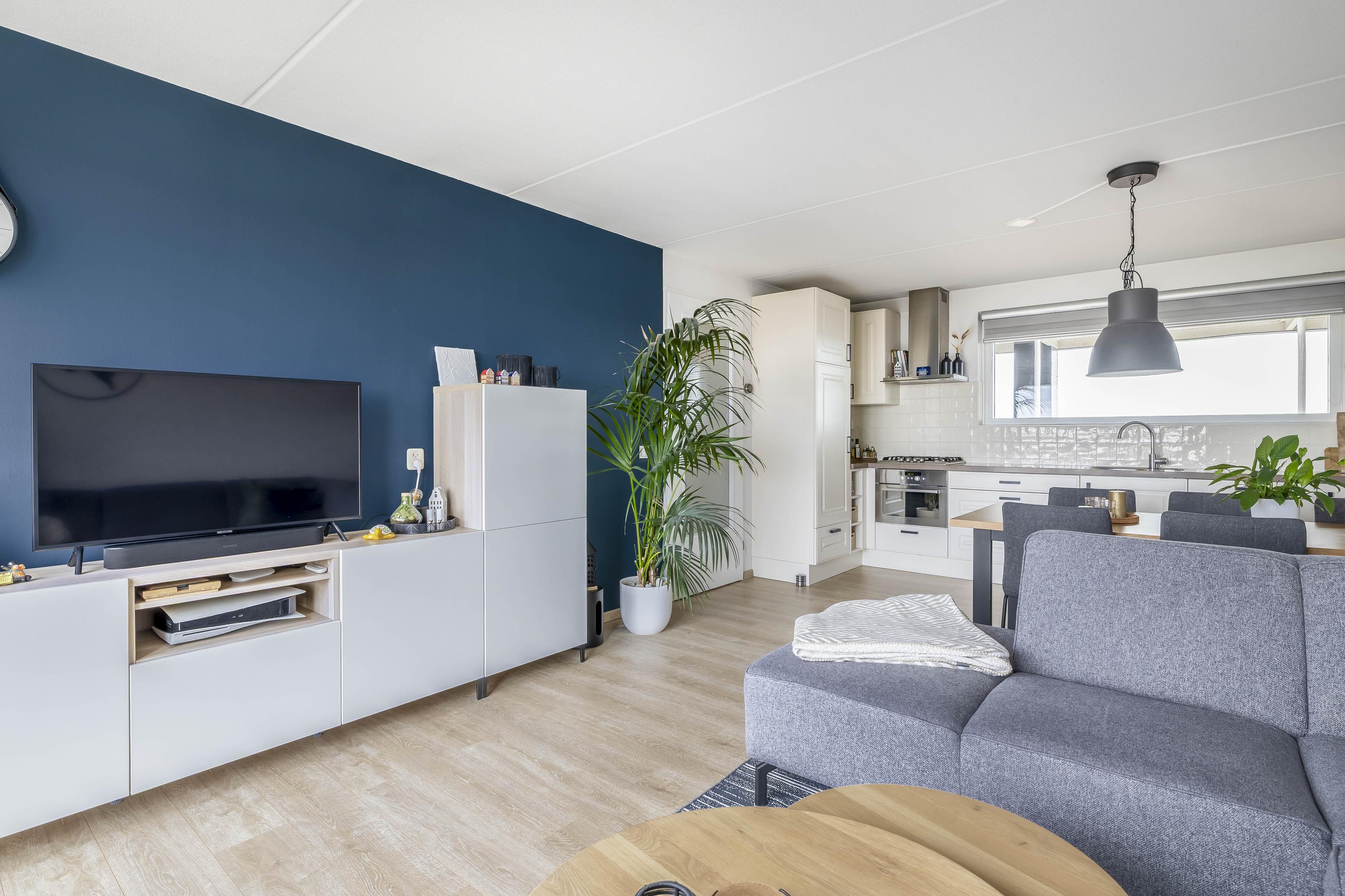 In de woonkamer creëren de brede raampartijen een prettige lichtinval. De ruimte voelt ruim en sfeervol door de strakke wanden, warme vloer en een donkerblauwe accentmuur. Vanuit de zithoek kijk je uit over groen en laagbouw, zonder inkijk van buren. Het geeft de woonkamer een rustig karakter, waar je zowel ’s ochtends met een kop koffie als ’s avonds met uitzicht op de kerktoren in alle privacy zit.