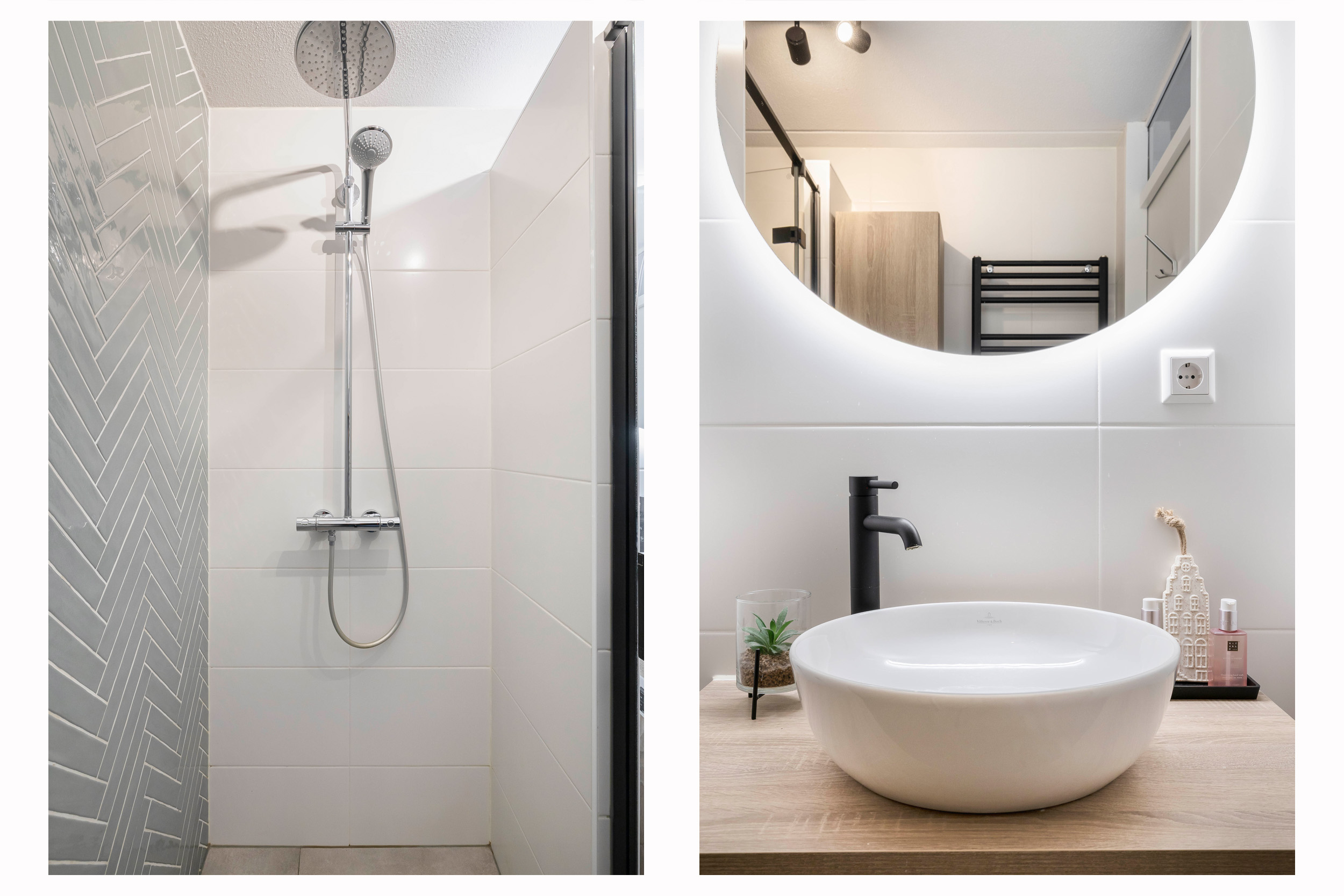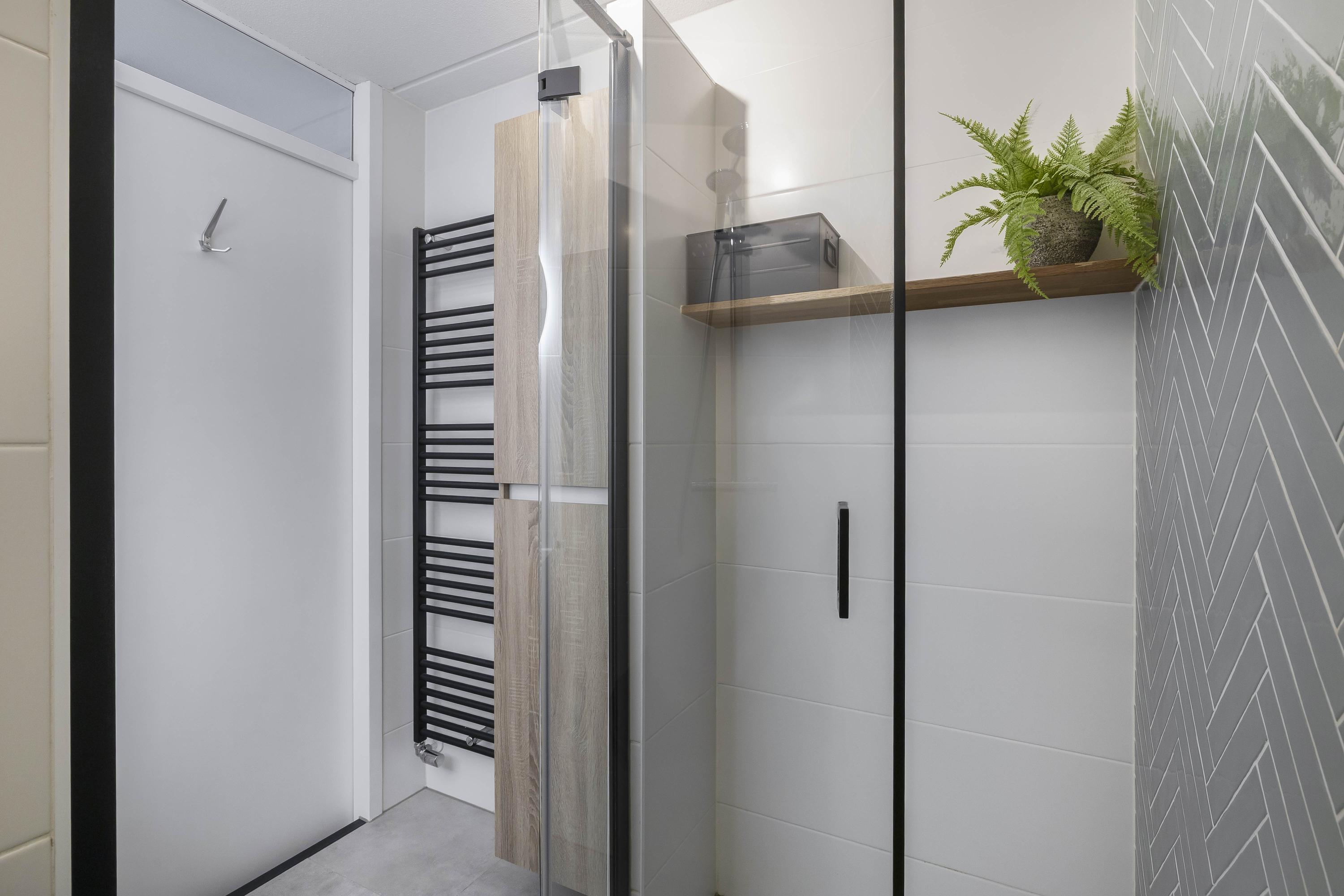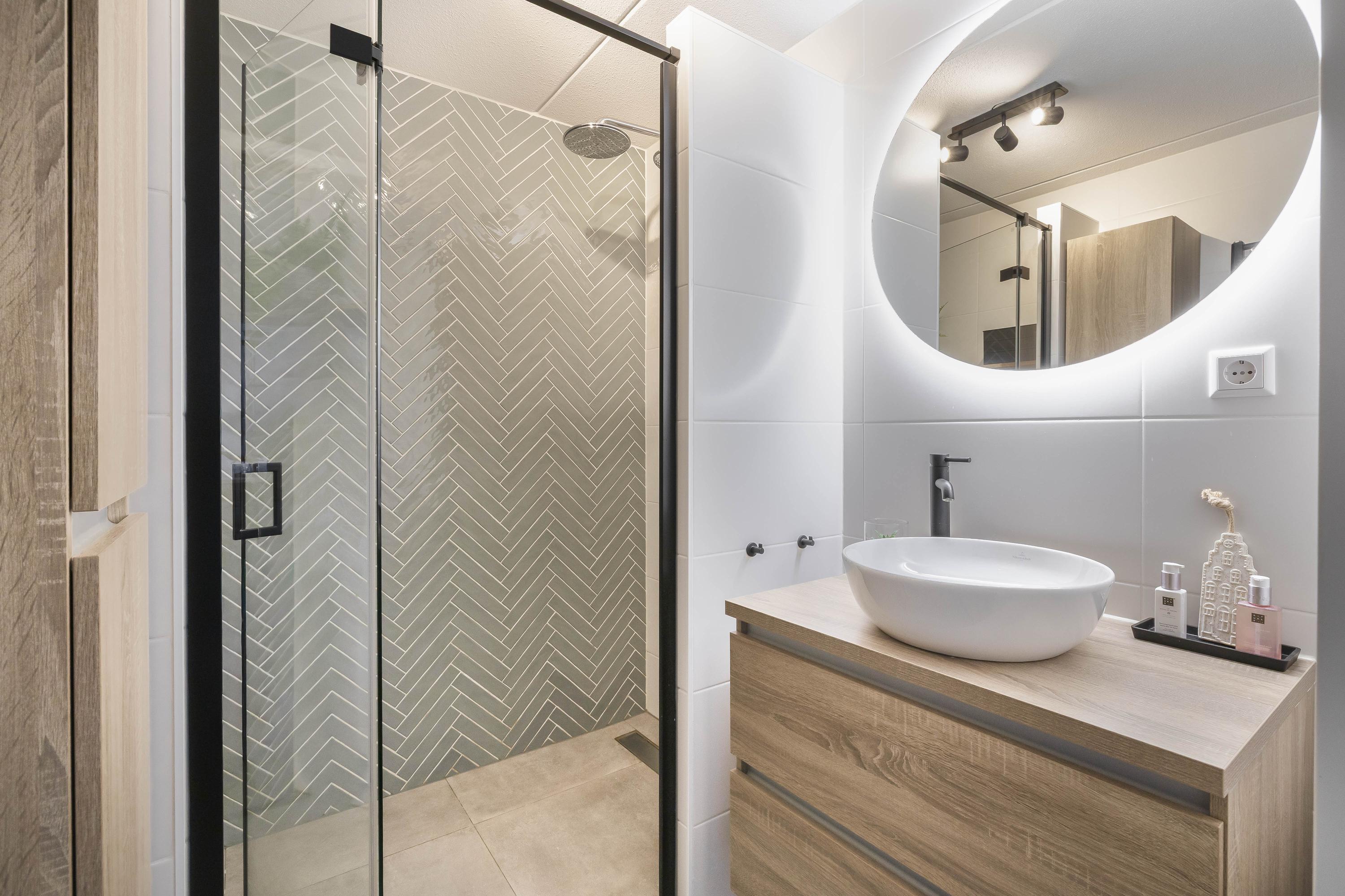De badkamer is volledig vernieuwd in 2020 en heeft een luxe uitstraling met een ruime inloopdouche met regendouchekop, glazen wand met zwart profiel en een visgraattegel in zacht groene tint. Het houten badkamermeubel met brede waskom, matzwarte kraan en verlichte ronde spiegel versterkt de moderne hotel-stijl, terwijl extra kastruimte zorgt voor praktische opberging.