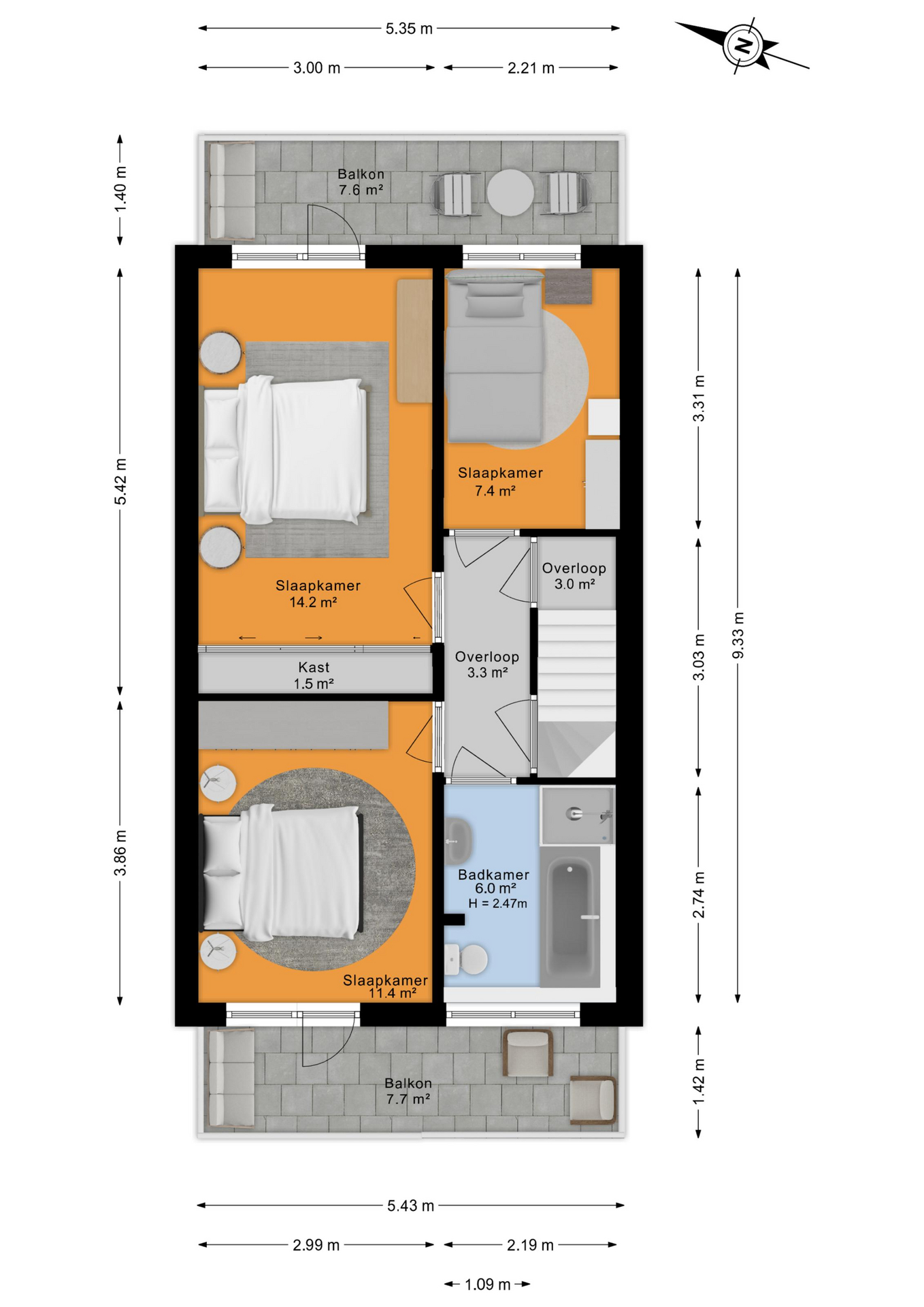 Hier vind je drie ruime slaapkamers. Twee kamers hebben toegang tot het balkon aan de voorzijde van de woning—ideaal voor een kop koffie in de ochtendzon. De badkamer is compleet uitgerust met een ligbad, douchecabine, tweede toilet en een stijlvol wastafelmeubel.
